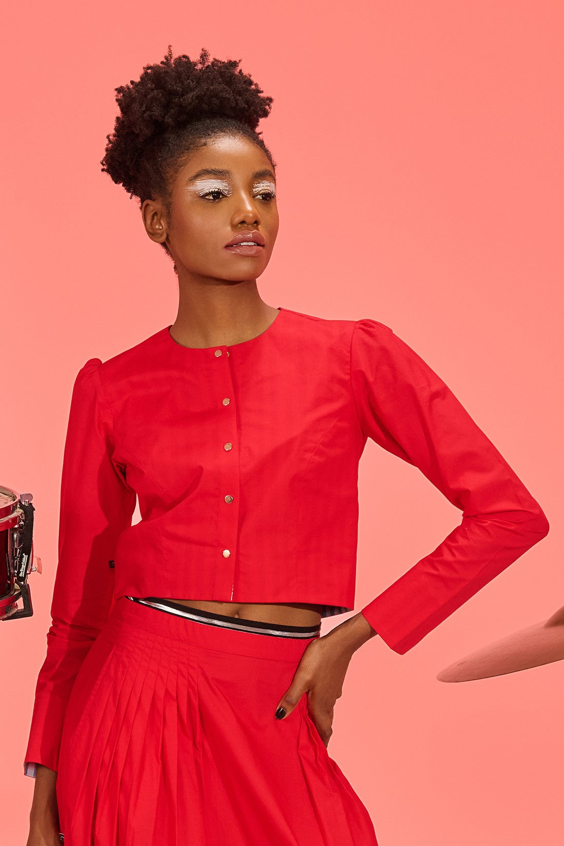 A short length top with statement embroidery adds a touch of elegance and personality to the ensemble. Pair it with our POP skirt to complete the look, making it perfect for special occasions or a fashionable night out.