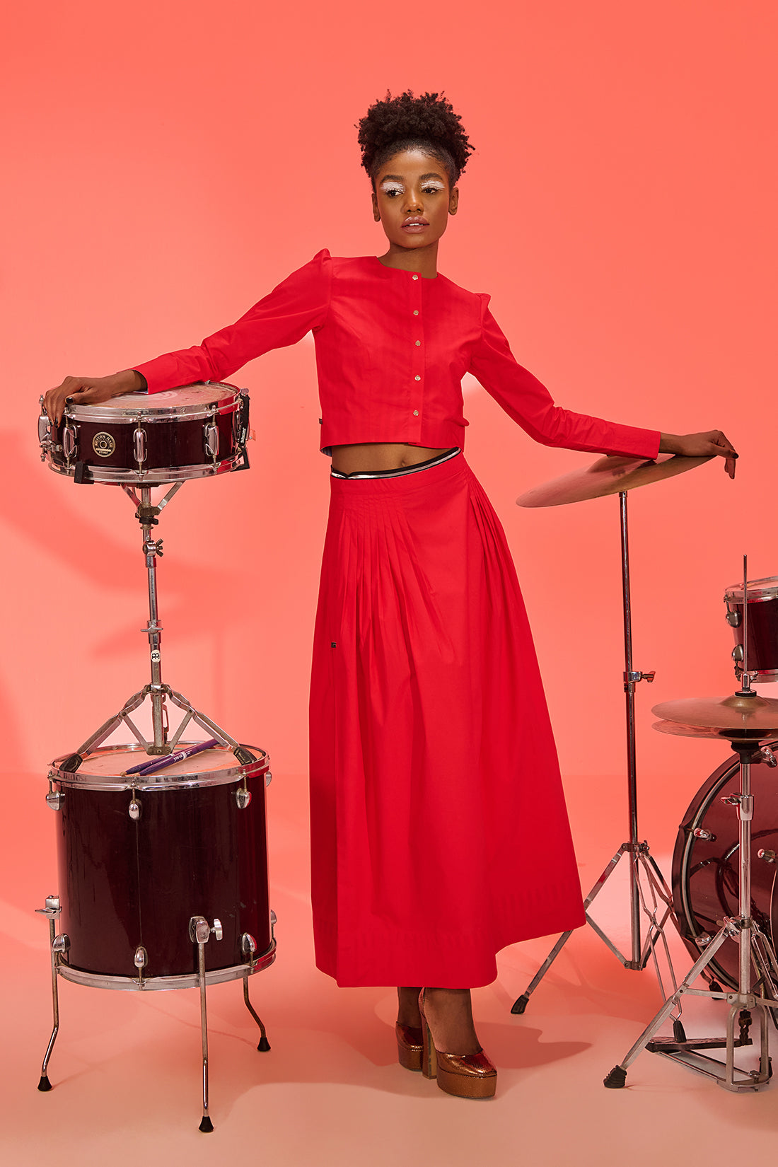 An elegant Co-ord set with standout details. The short-length top features slim-fit sleeves, a front metallic button closure, and statement embroidery at the back. Paired with our POP skirt, this set is perfect for special occasions or a stylish night out, combining polished tailoring with eye-catching details.