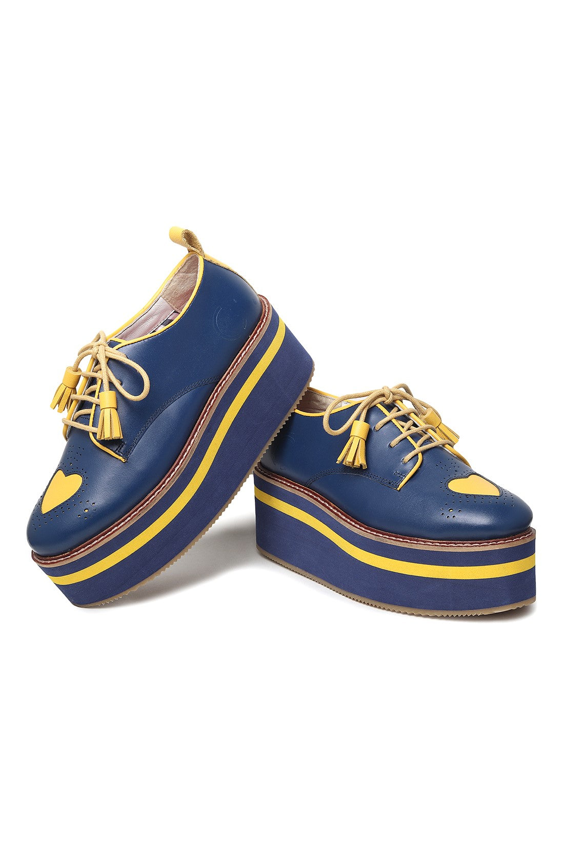 Bold, playful, and unapologetically quirky. These blue platform lace-ups feature contrast yellow heart cutout, tassel accents, and a statement layered sole that brings instant attitude to any look. Designed for comfort with a standout edge—this pair is made to be noticed.