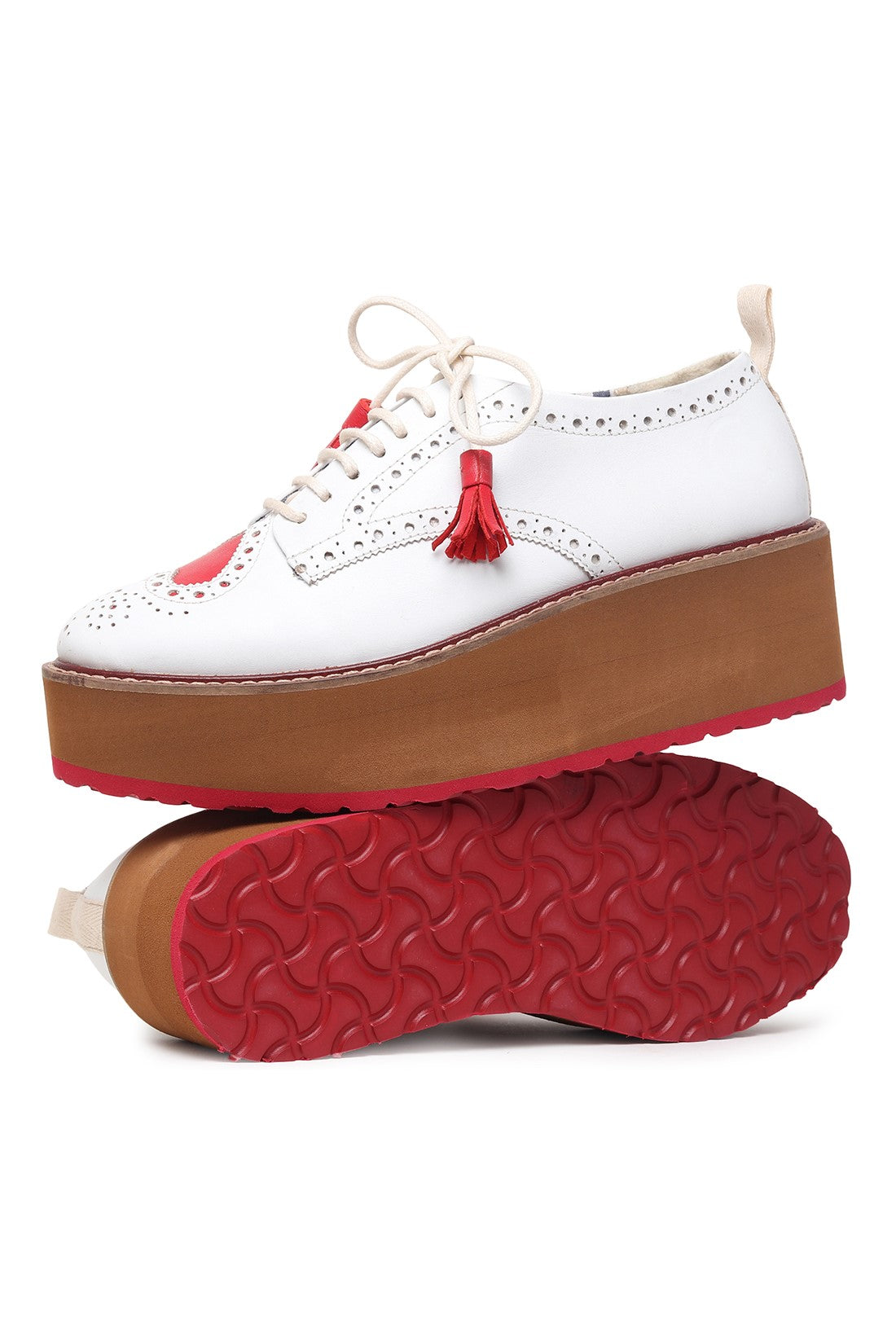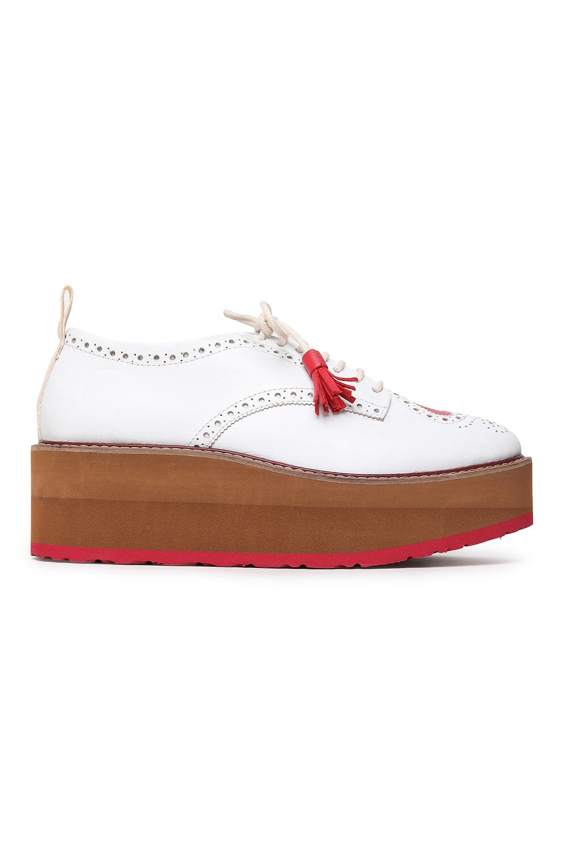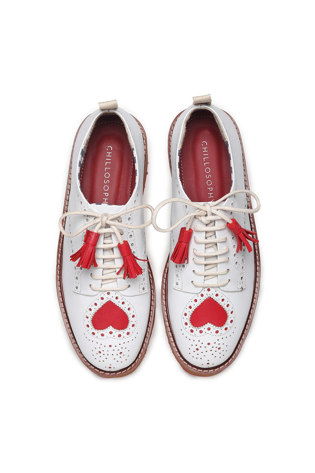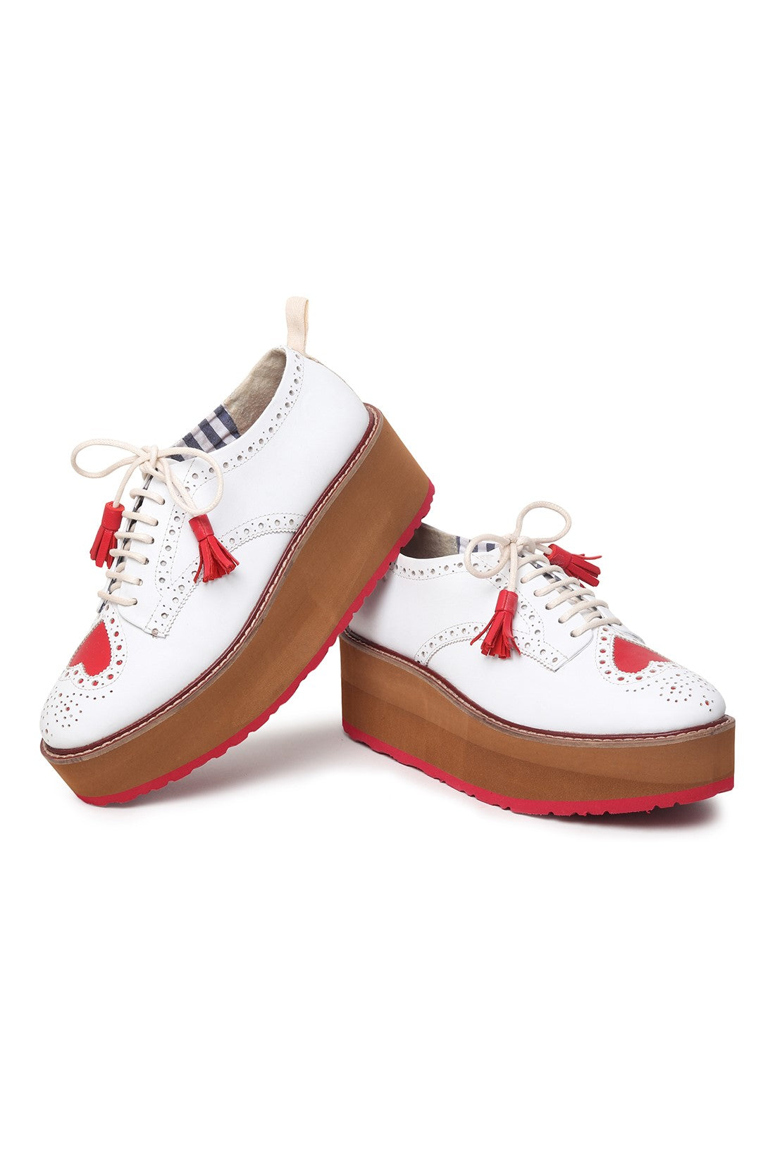 A playful statement with a romantic twist, these white platform lace-ups feature contrast red heart cutout detailing, tassel laces, and classic brogue perforations. Set on a bold layered platform sole, they blend comfort with character, perfect for adding a touch of quirk to everyday dressing.