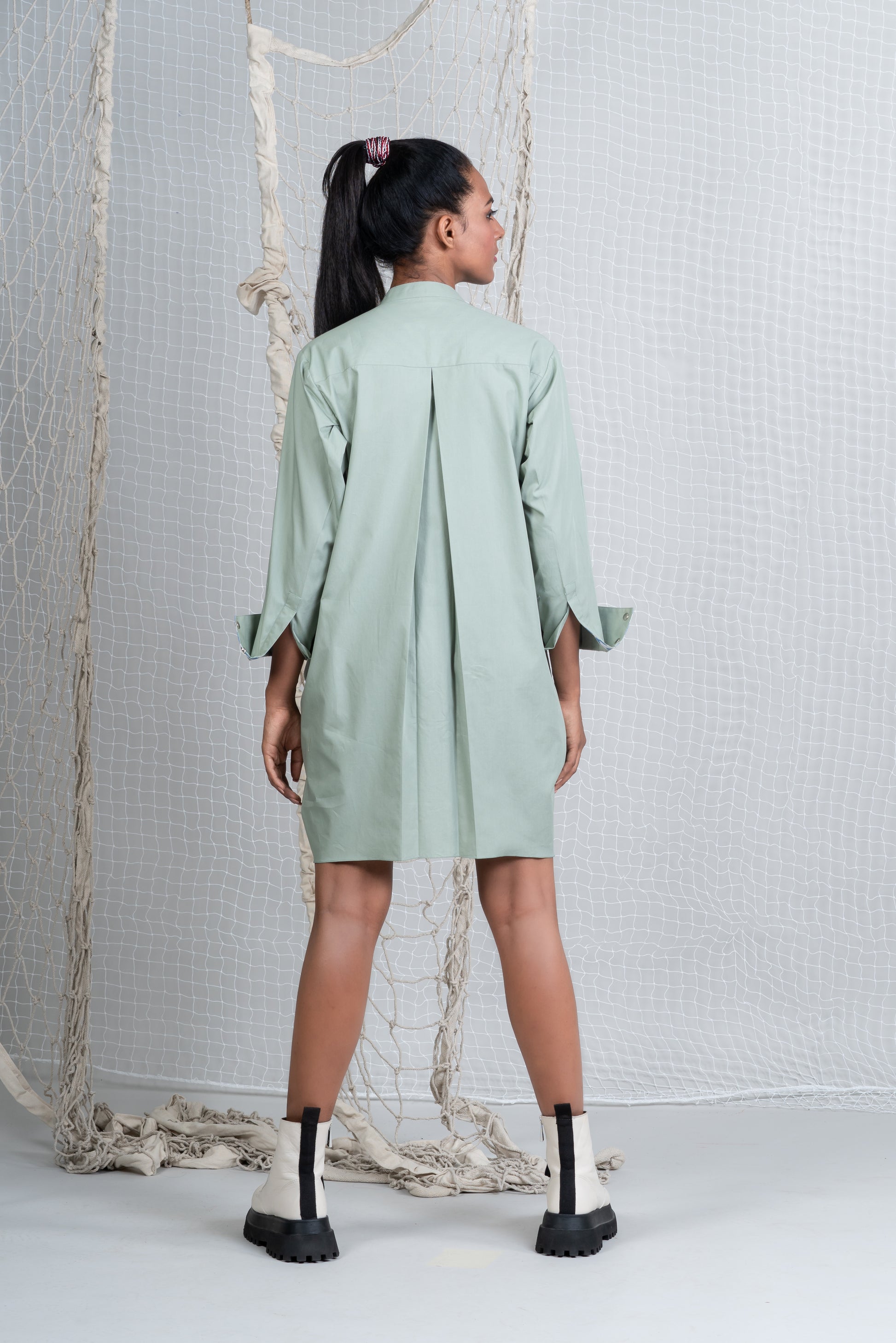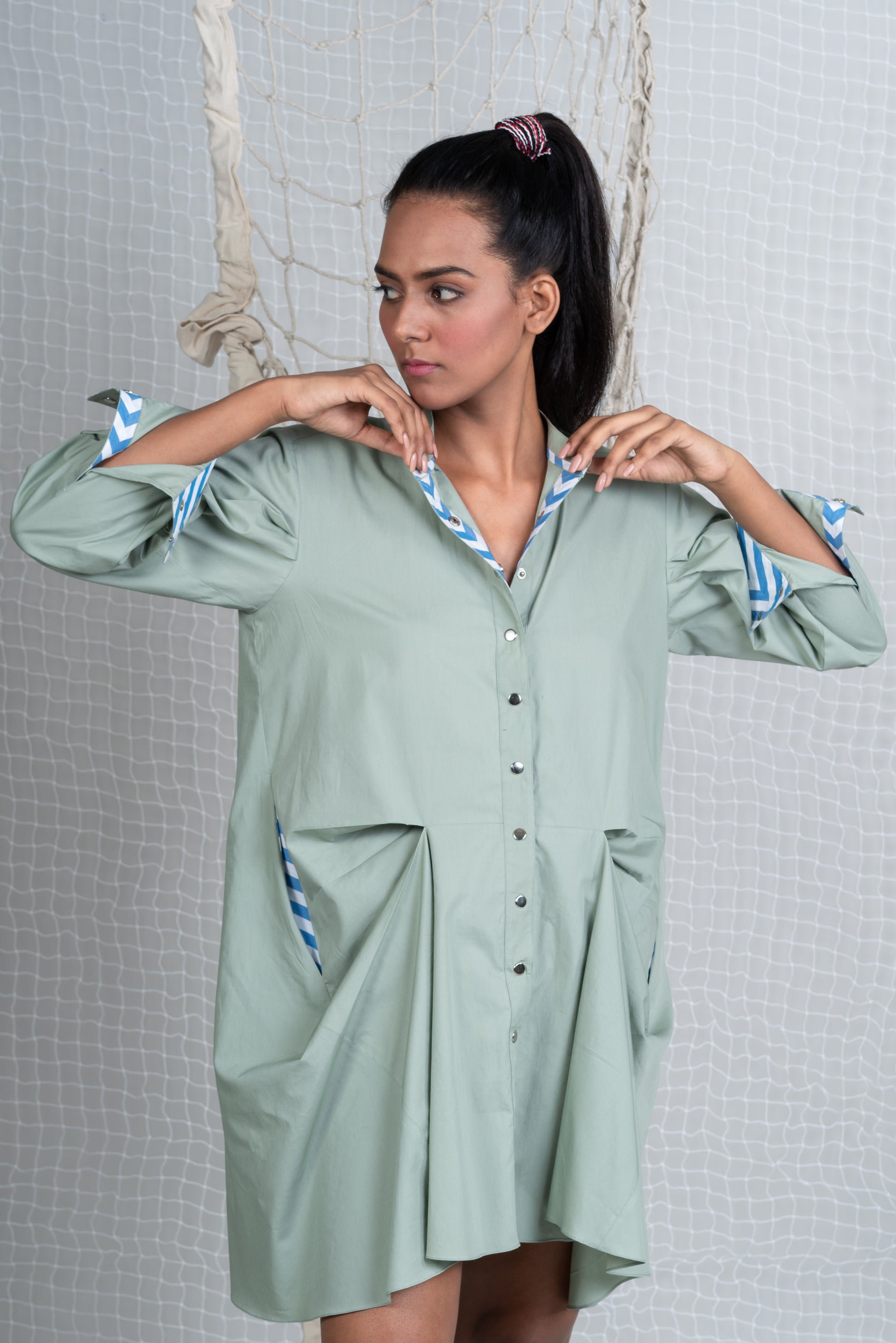 Modern and chic dress having box pleat drape detail near waist with round band collar, golden buttons, cheveron cuff detail and pockets on the sides making it the perfect dress for a casual outing.