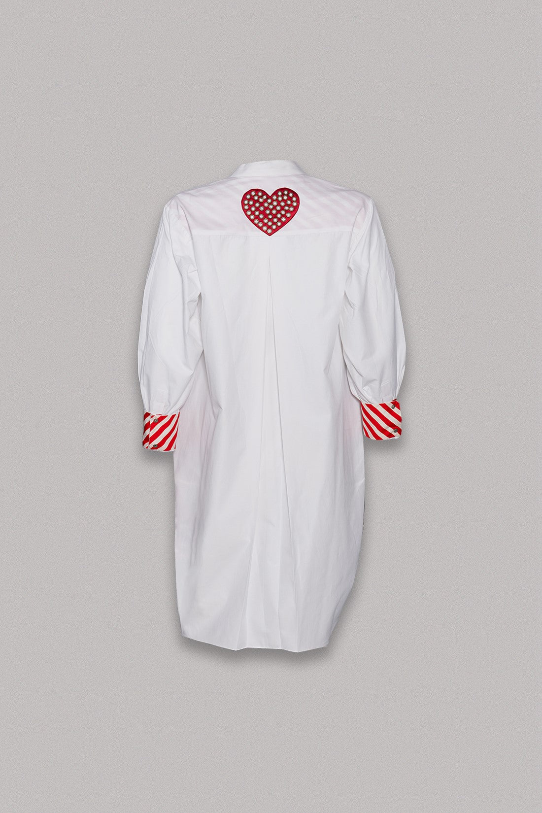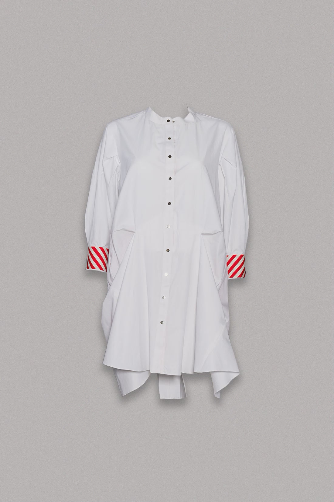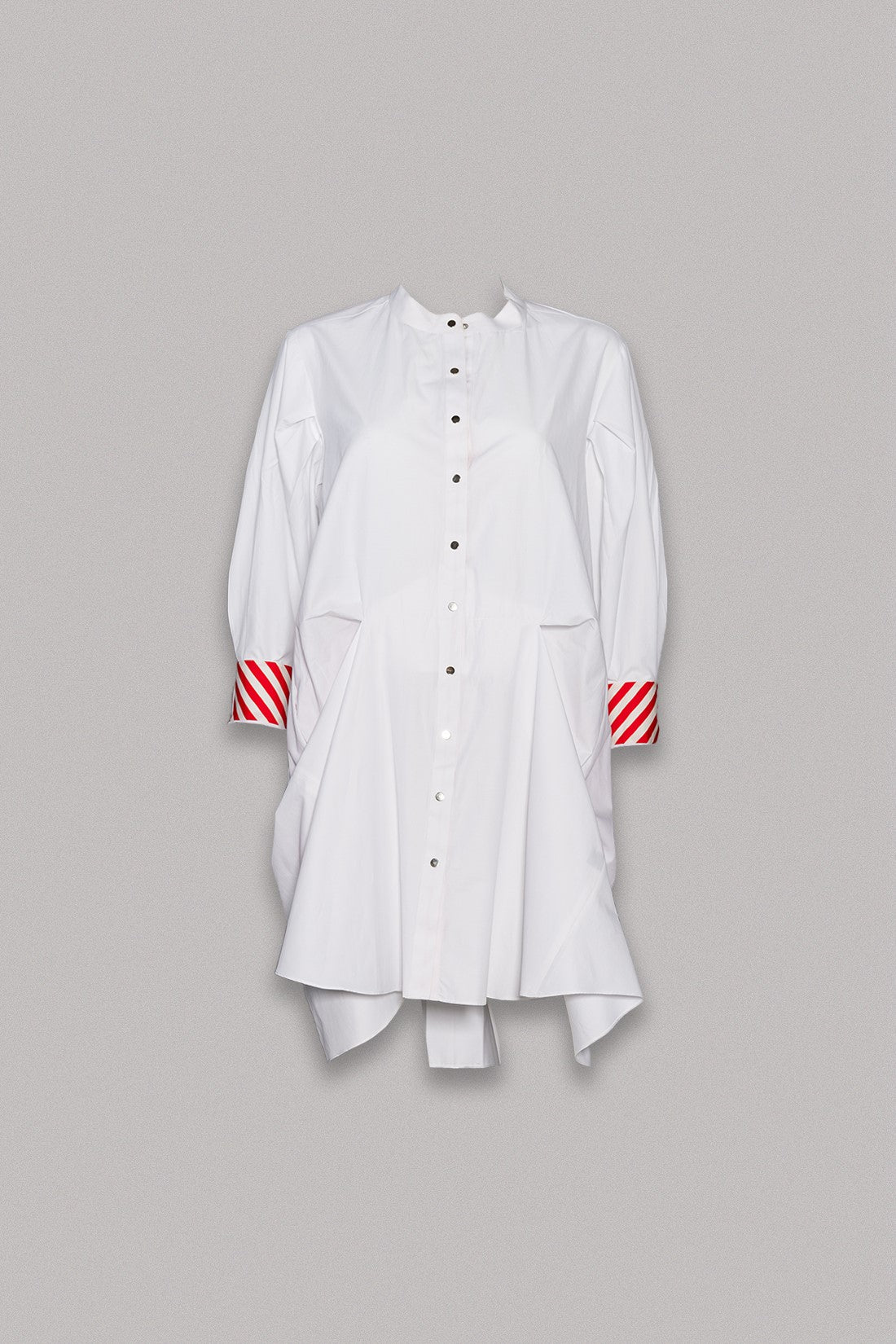 Stylish and trendy, Isla is the ideal dress for a laid-back occasion. This minidress features a stripe cuff design, pockets on the sides, a round band collar, golden buttons, and box pleat drape accents around the waist.