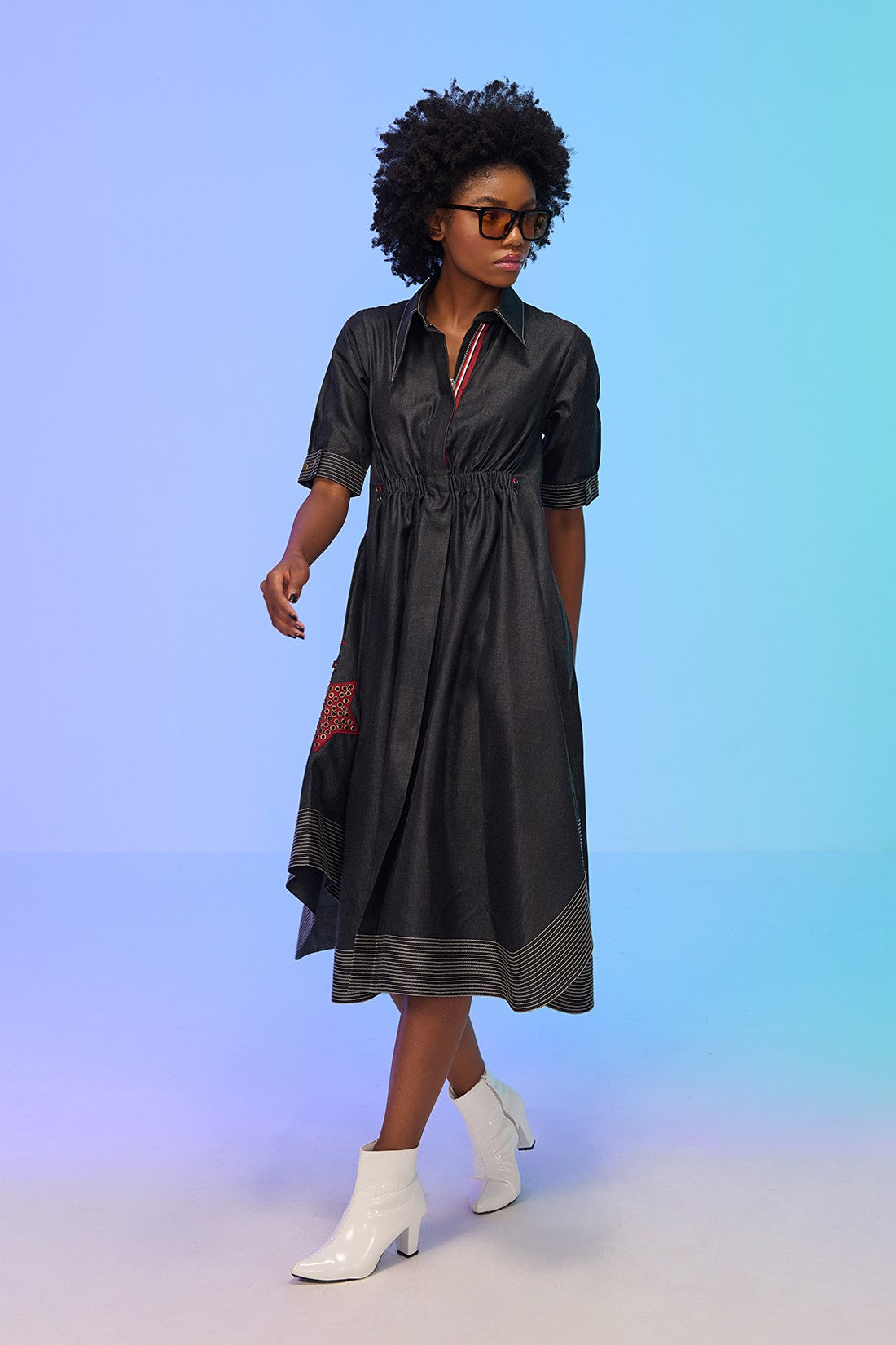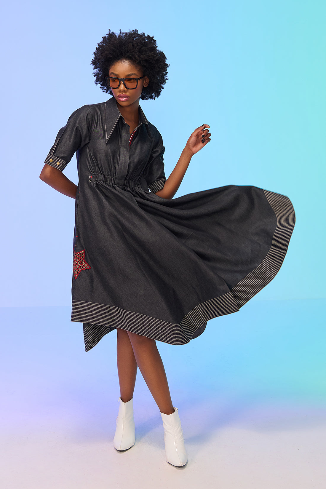 - Enhanced with a star shaped patch with metallic rivets on one side of the dress