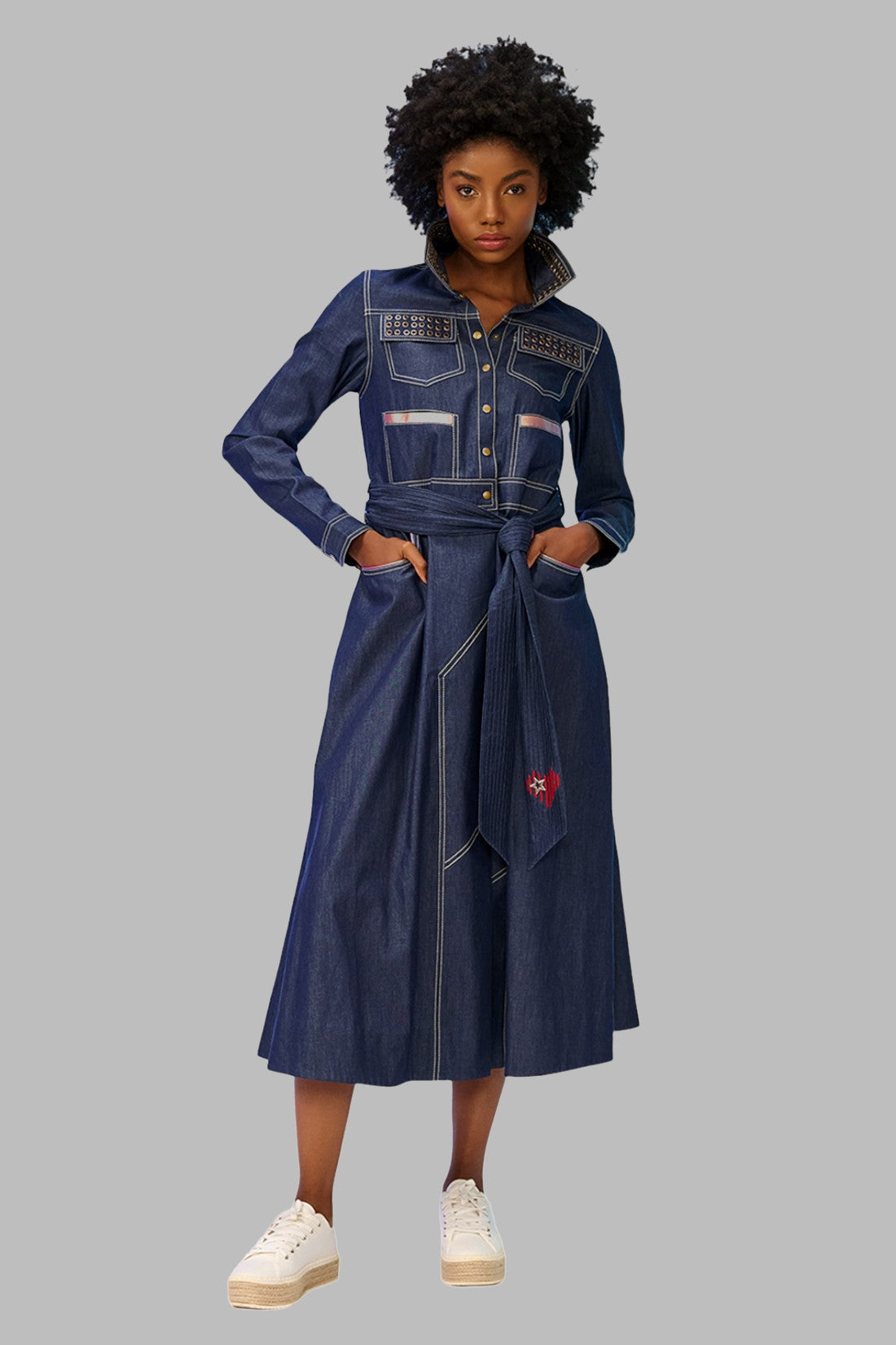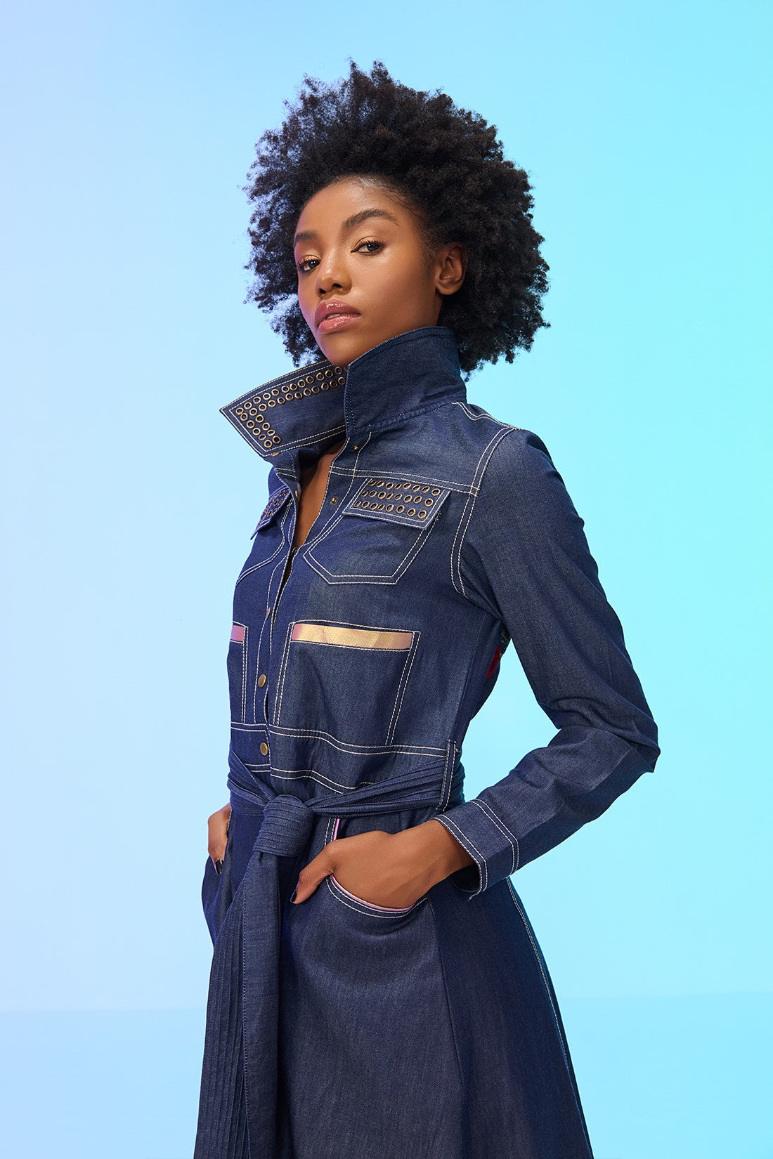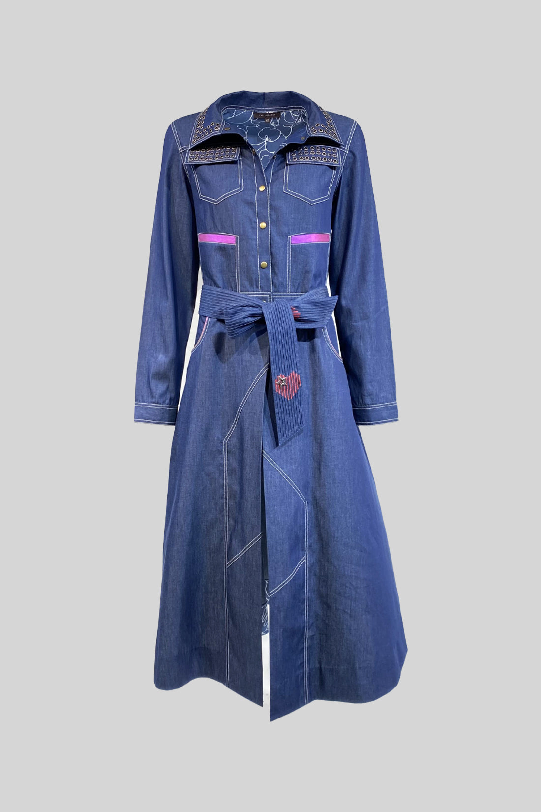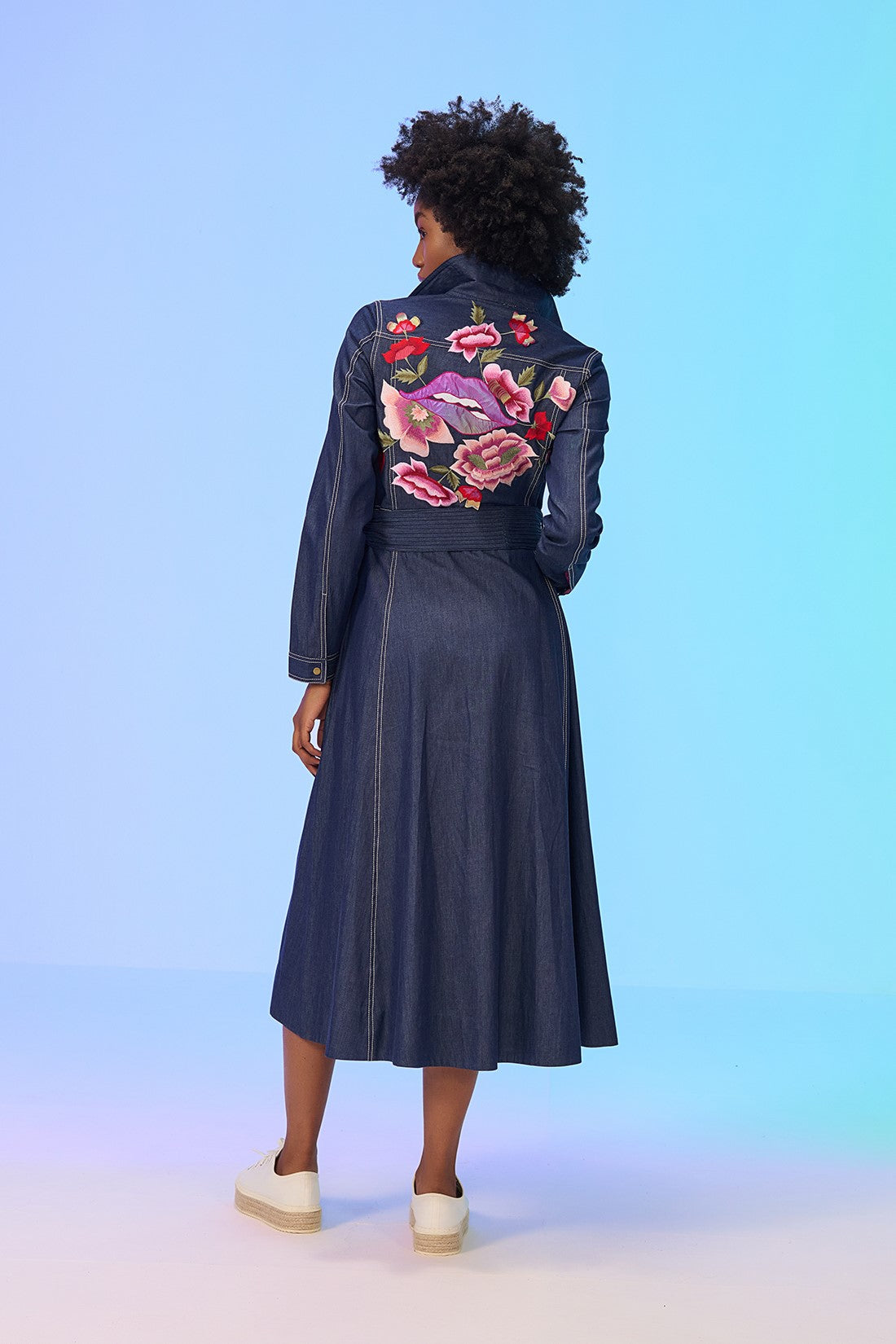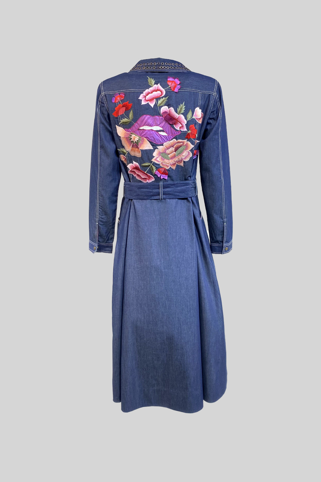 Smart Trench coat with embroidery inspired by pop culture. The trench embodies free spirited aesthetics that mixes different trims and details into an eclectic style.