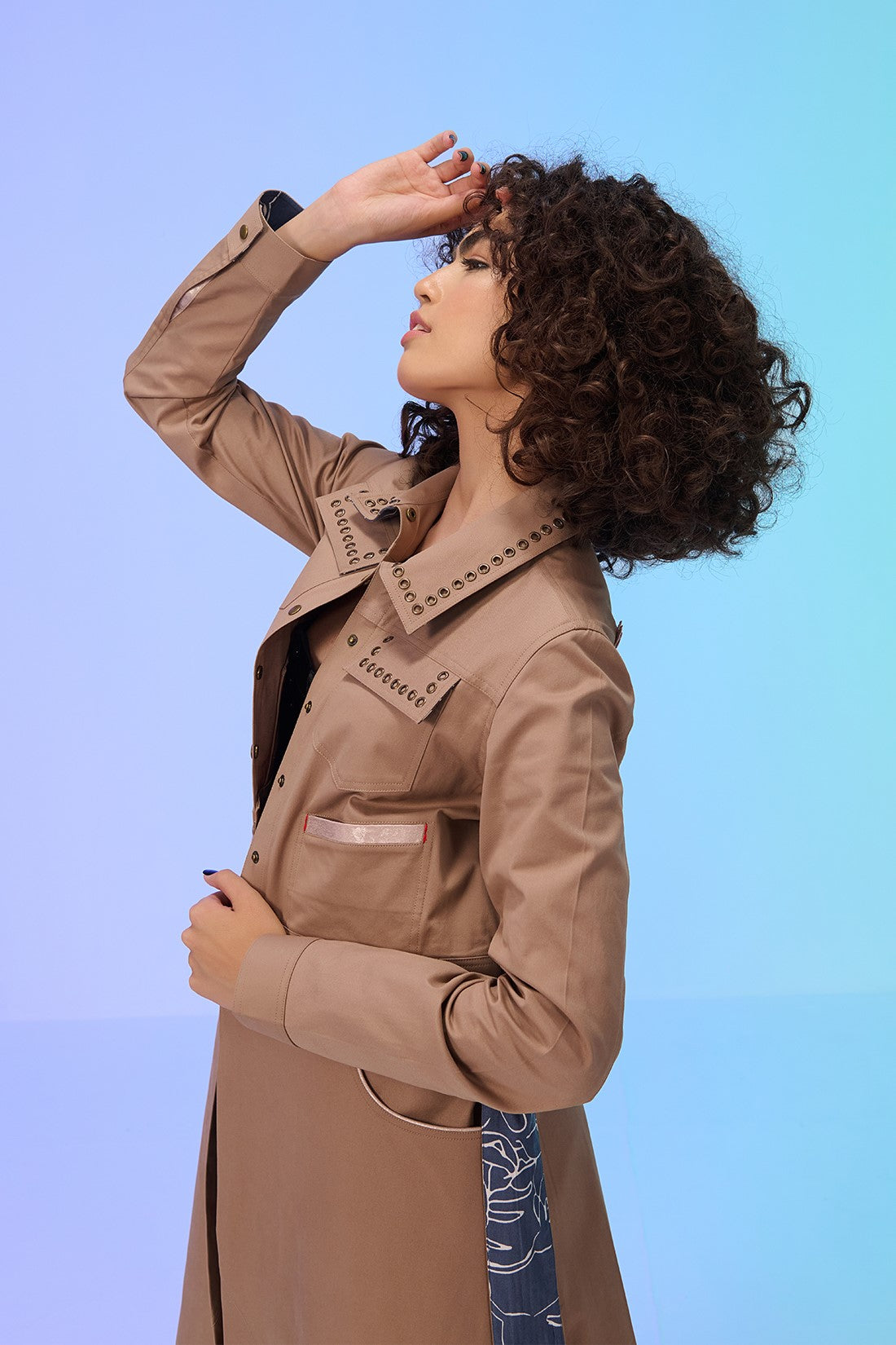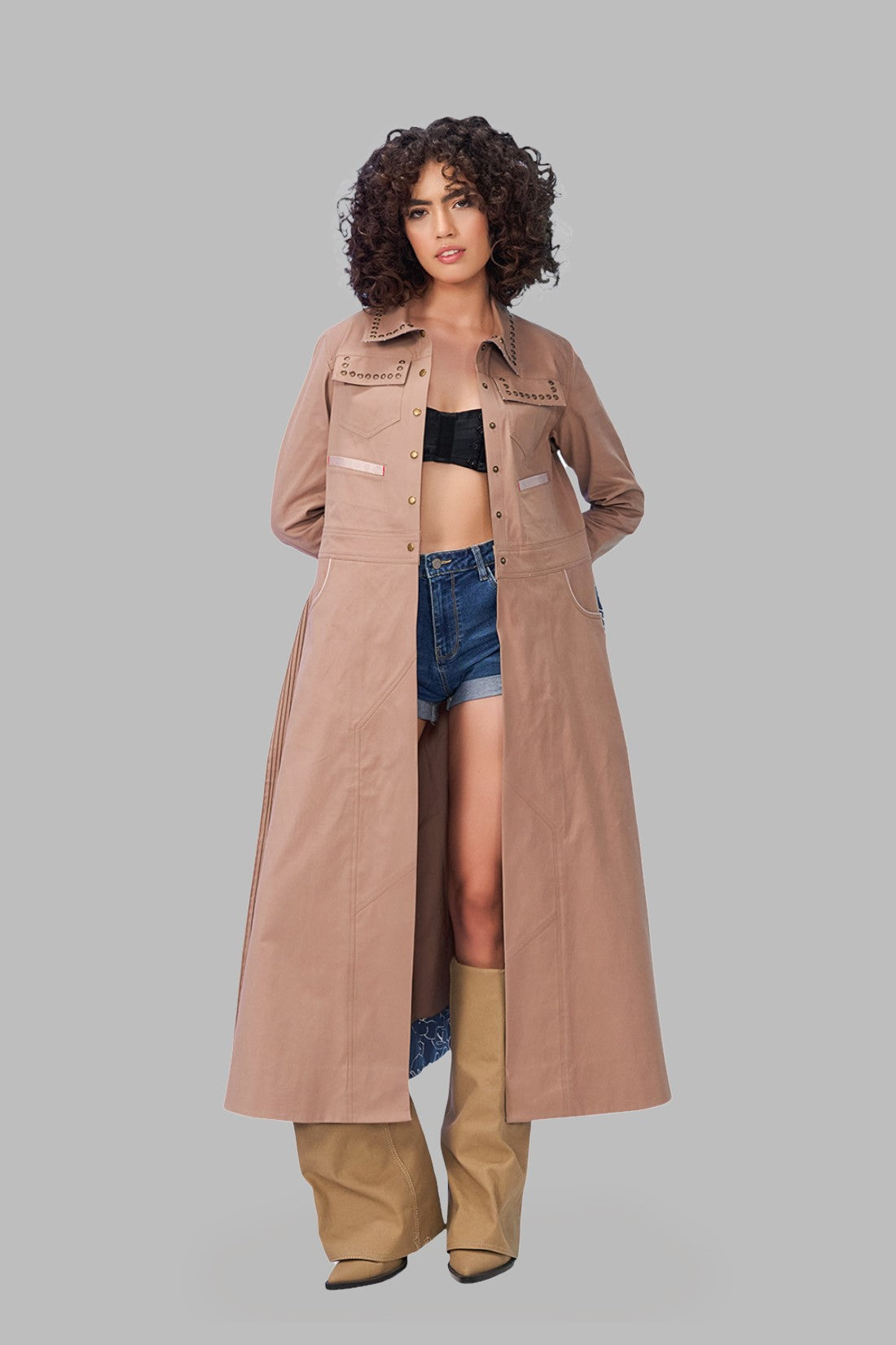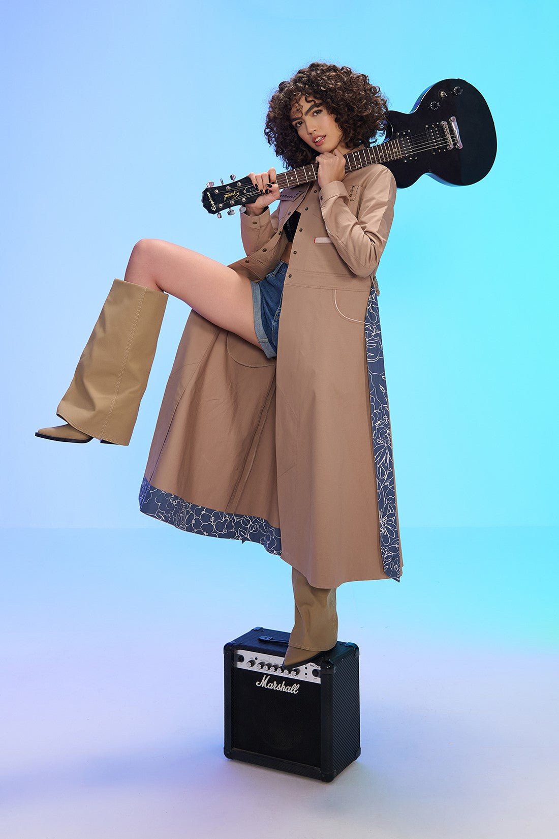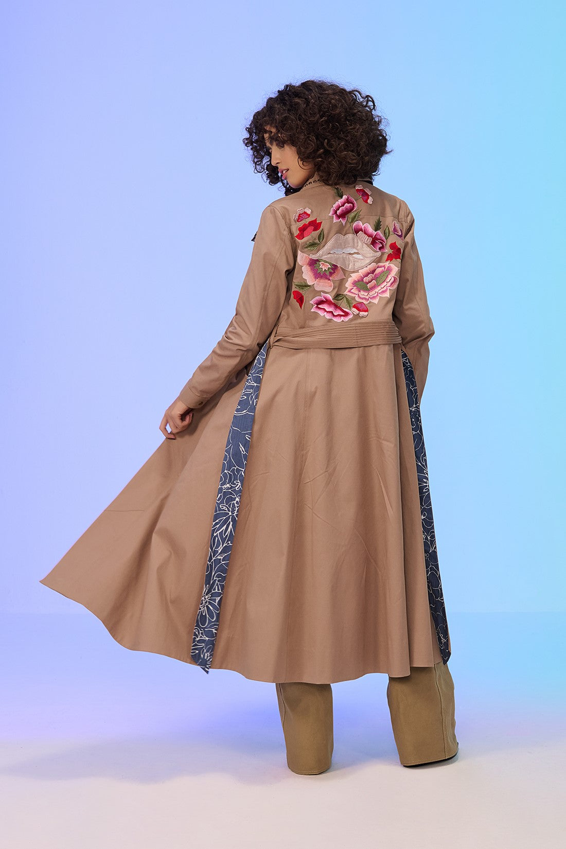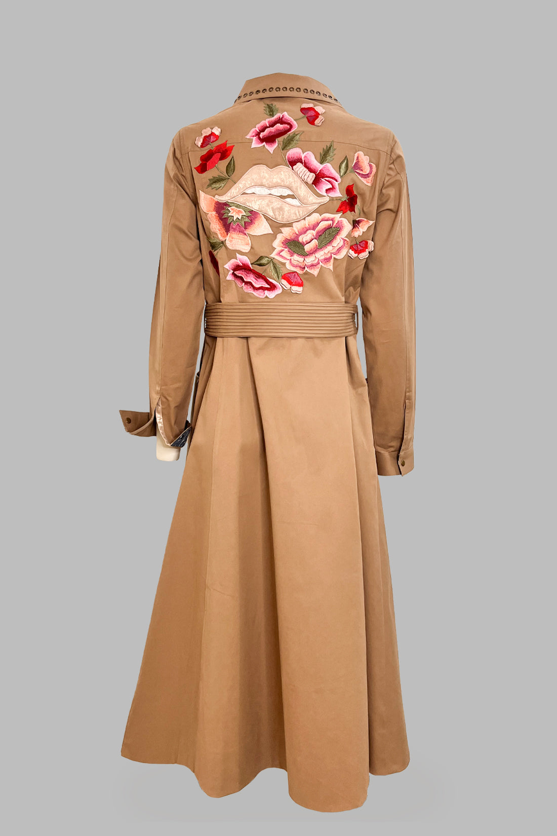 Smart Trench coat with embroidery inspired by pop culture. The trench embodies free spirited aesthetics that mixes different trims and details into an eclectic style.