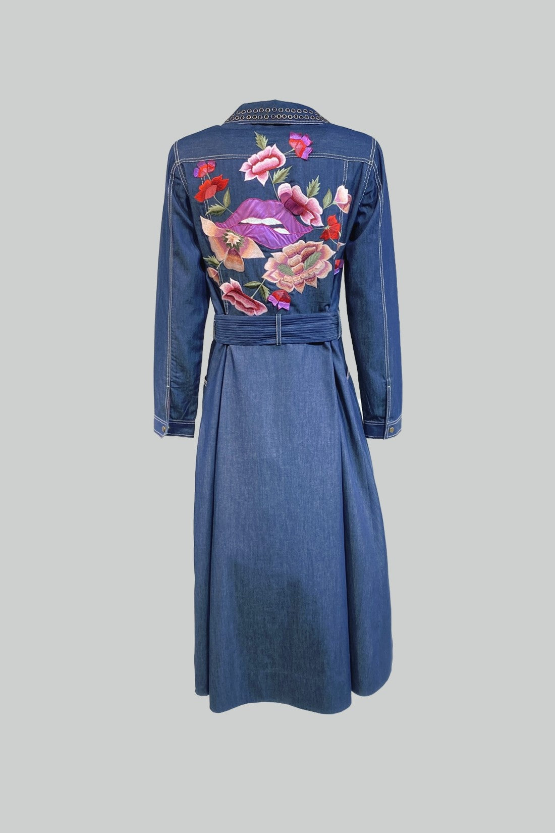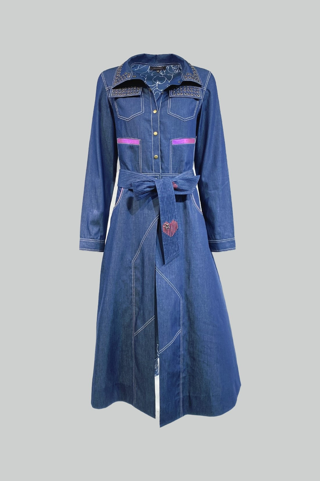 A pop culture-inspired trench coat with boho embroidery, holographic pocket detailing, antique metallic buttons, rivets, and a pintuck and heart-embroidered belt.