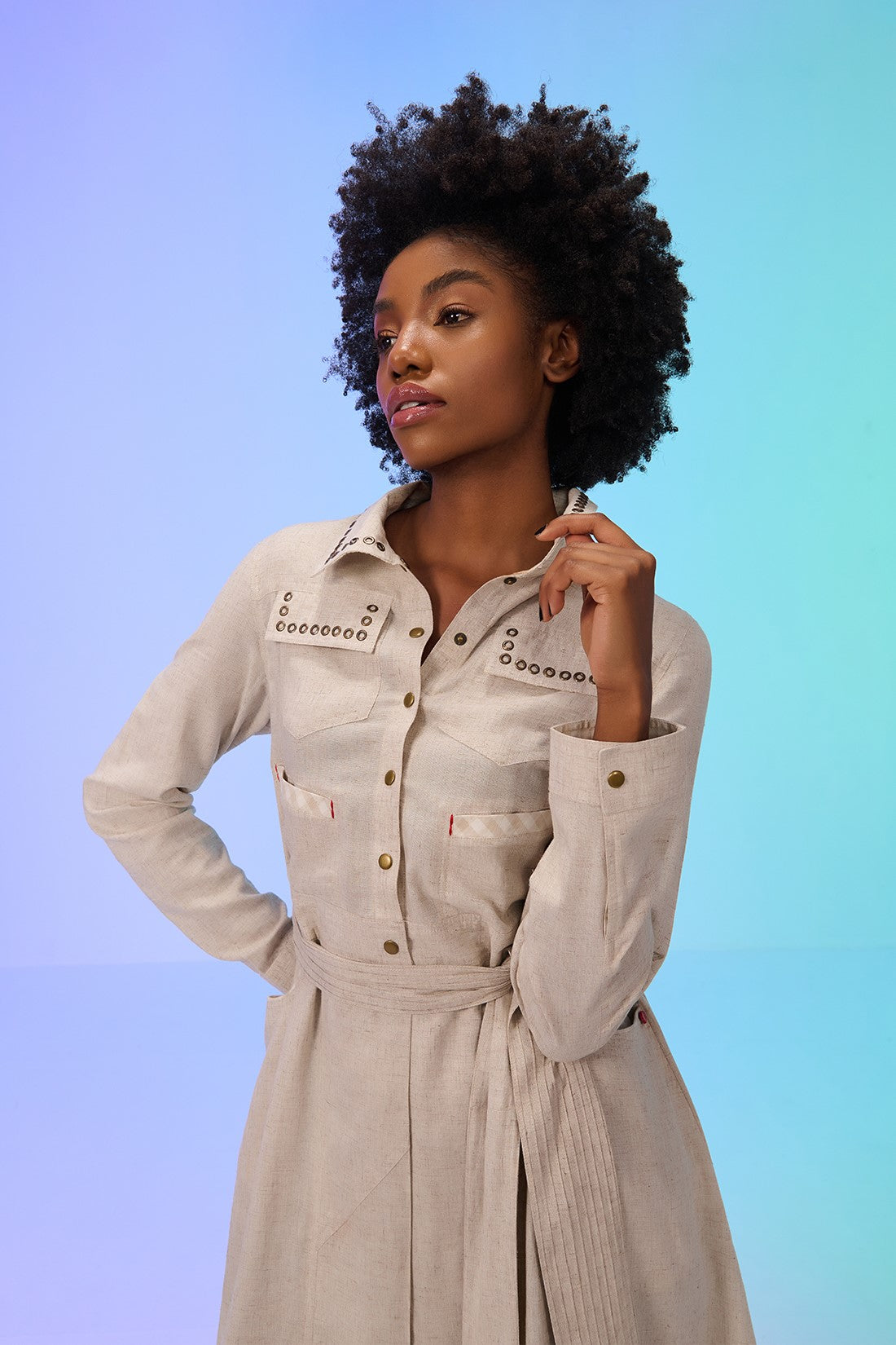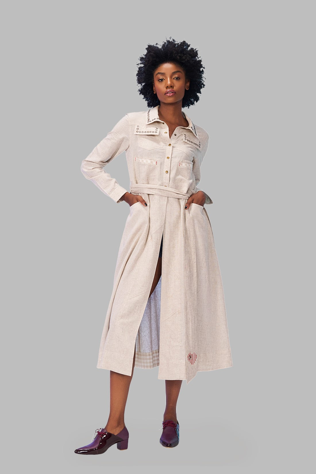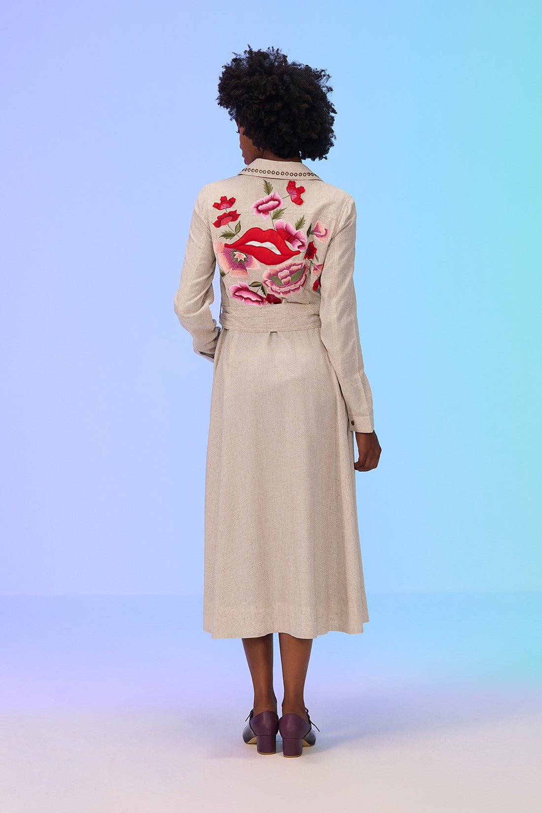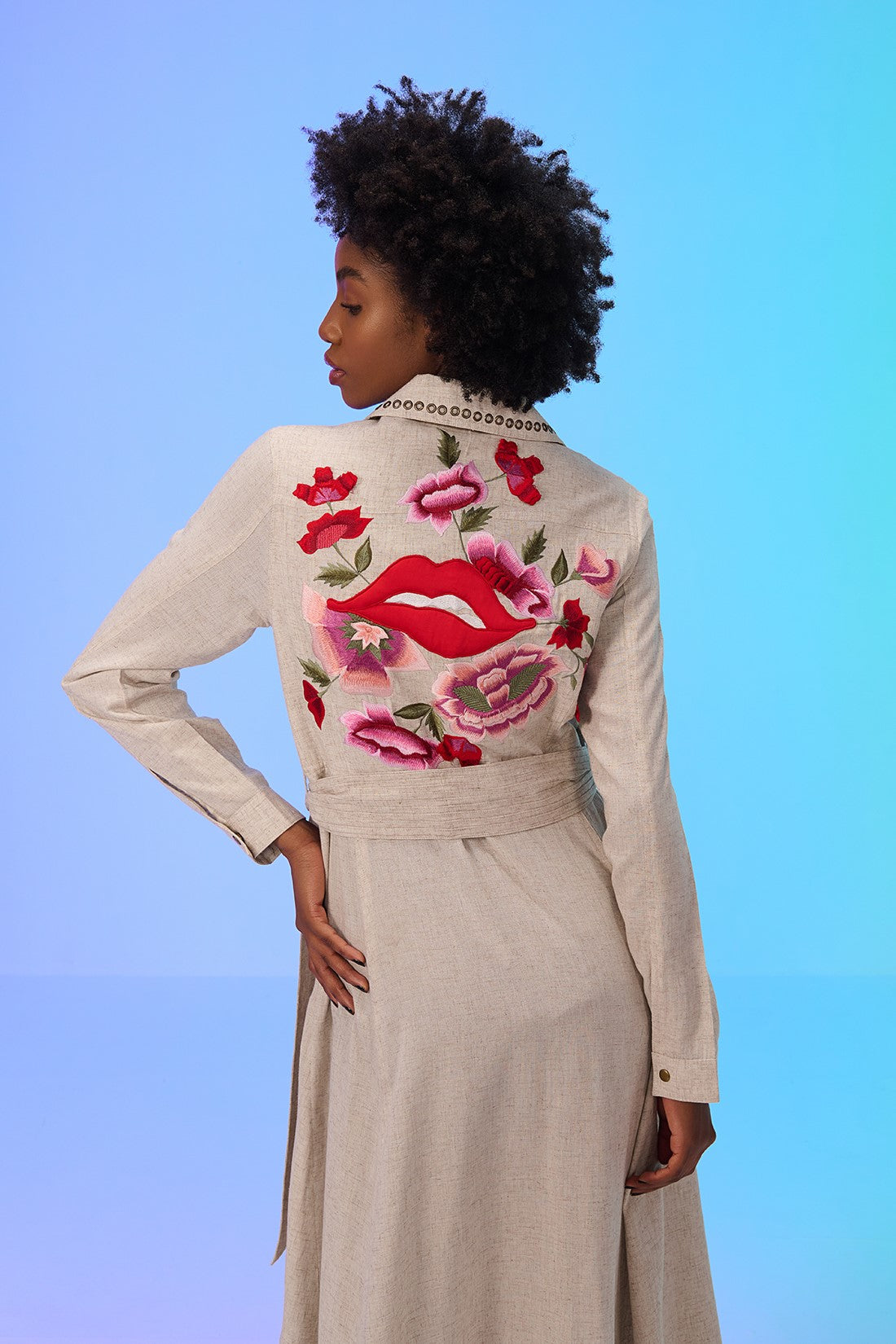 Smart Trench coat with embroidery inspired by pop culture. The trench embodies free spirited aesthetics that mixes different trims and details into an eclectic style.