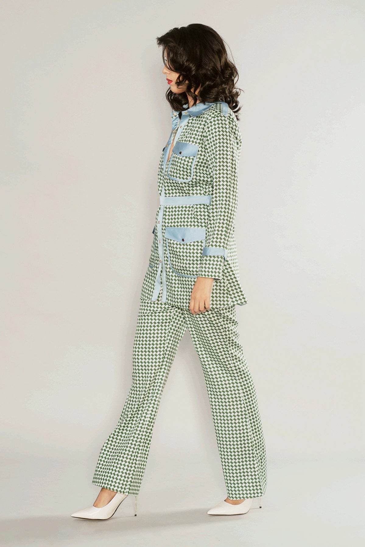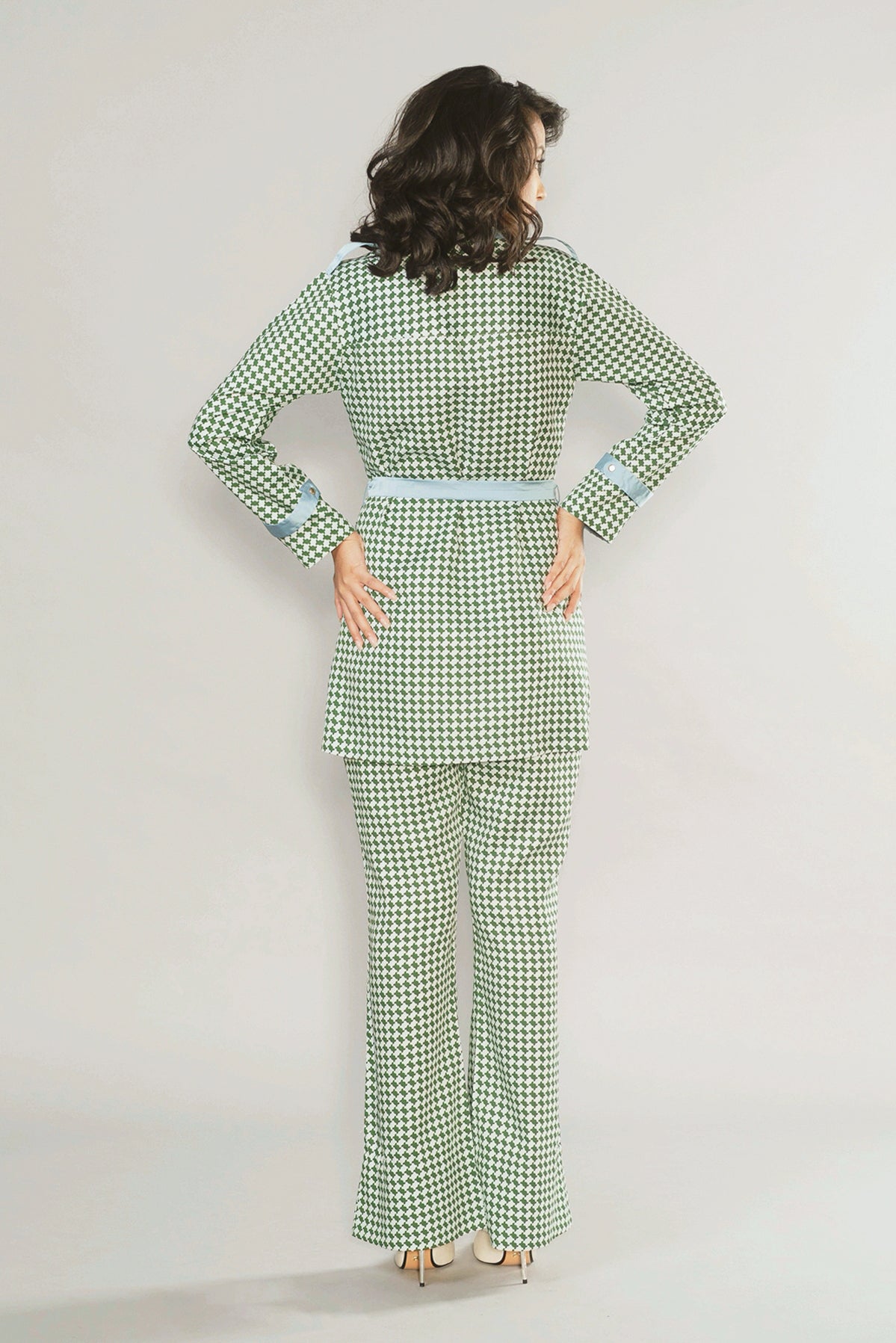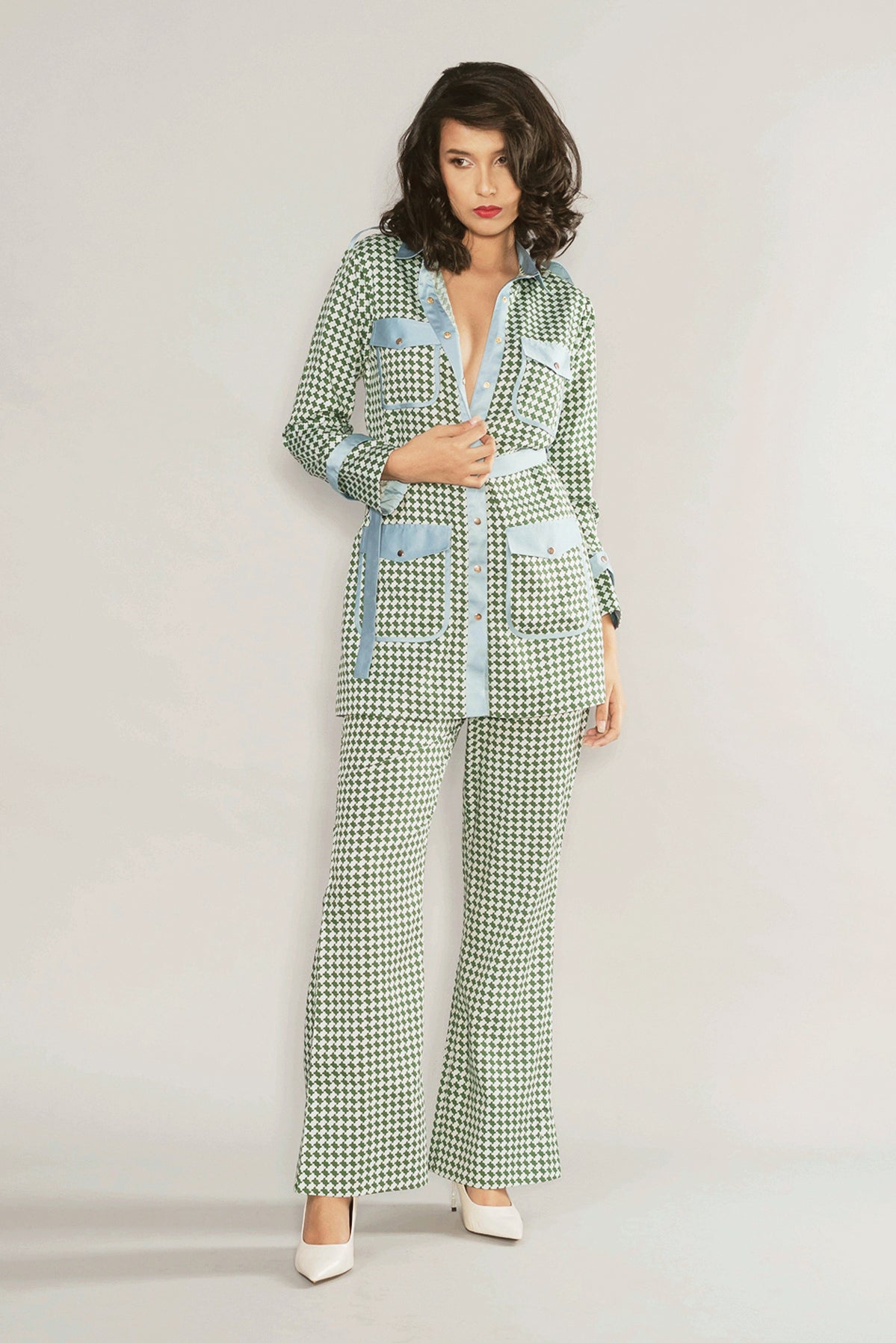 Meet your new statement co-ord: a tailored mid-length belted shirt and matching trousers designed for modern summer elegance. The vintage print, satin-contrast accents, and gold hardware create a look that’s polished, feminine, and irresistibly ethereal.