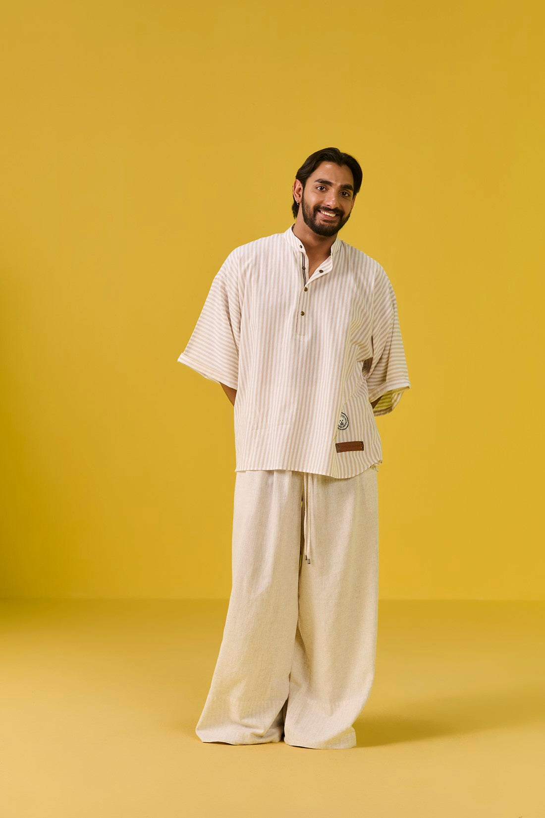 Designed with half sleeves and a sharp standing collar, this shirt features a half front placket for a minimal yet functional look. Hand machine embroidered patches on one side bring character, giving the piece a handcrafted feel with a contemporary twist.