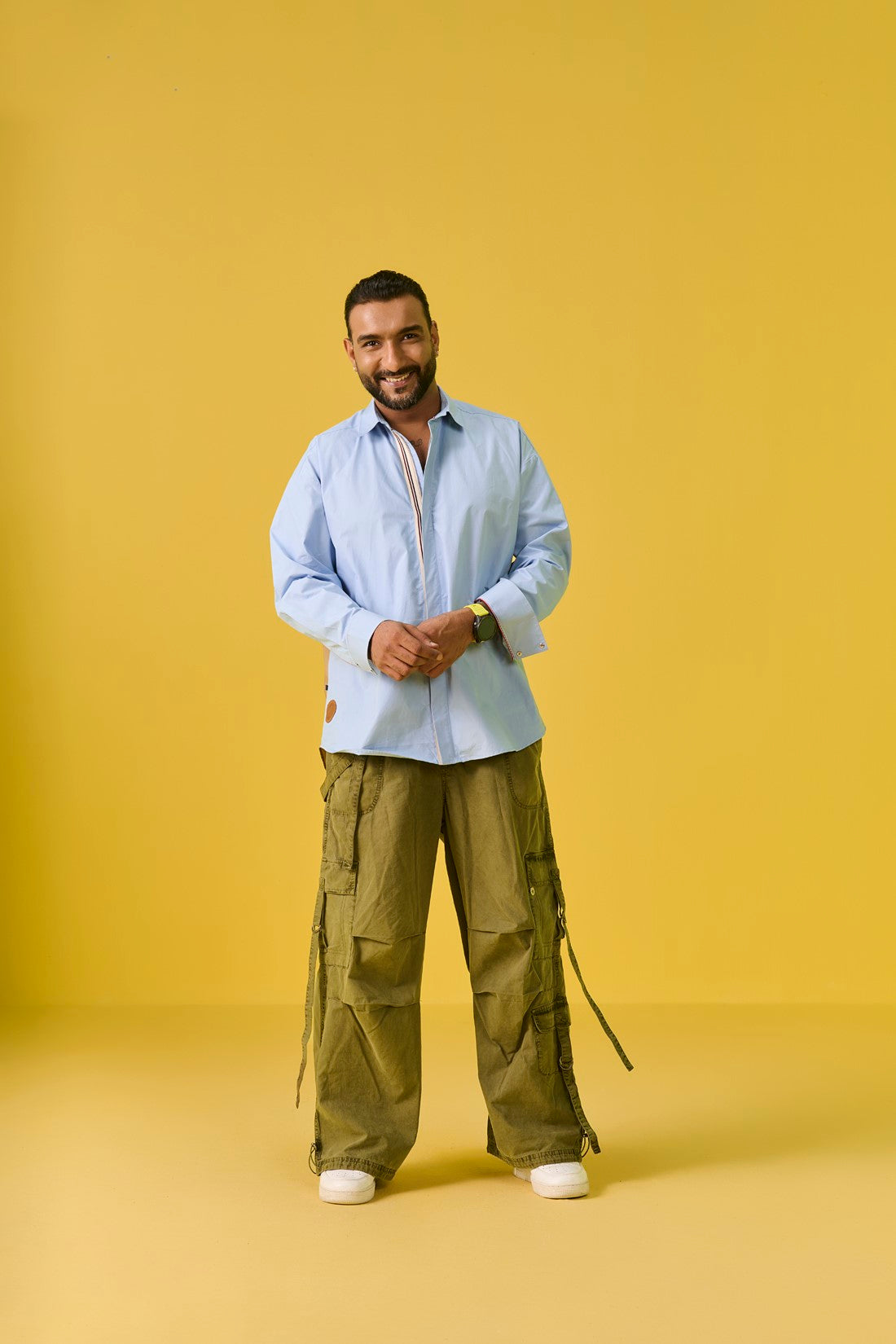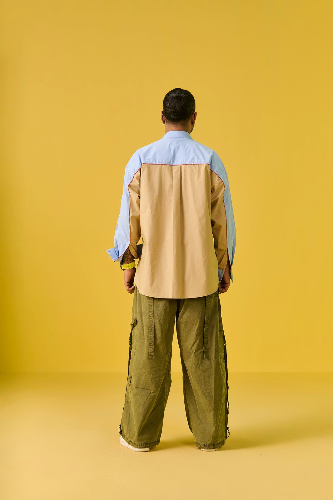 This colour-block shirt features a bold, modern silhouette with a front zip opening in place of traditional buttons. Multicoloured lace piping traces the back yoke and sleeve seams, offering a subtle contrast that elevates the shirt with unexpected details.