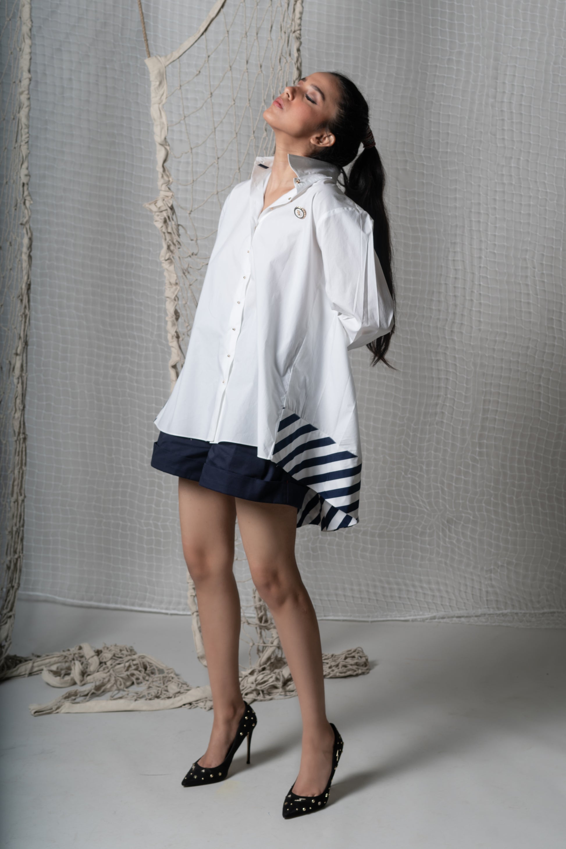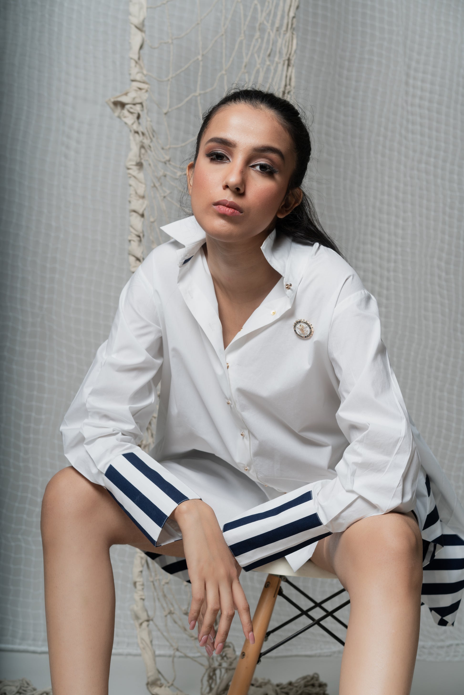 Shirt Dress with golden buttons, stripe Hem & Cuff, pleats on the back giving it a flowy and breezy look.