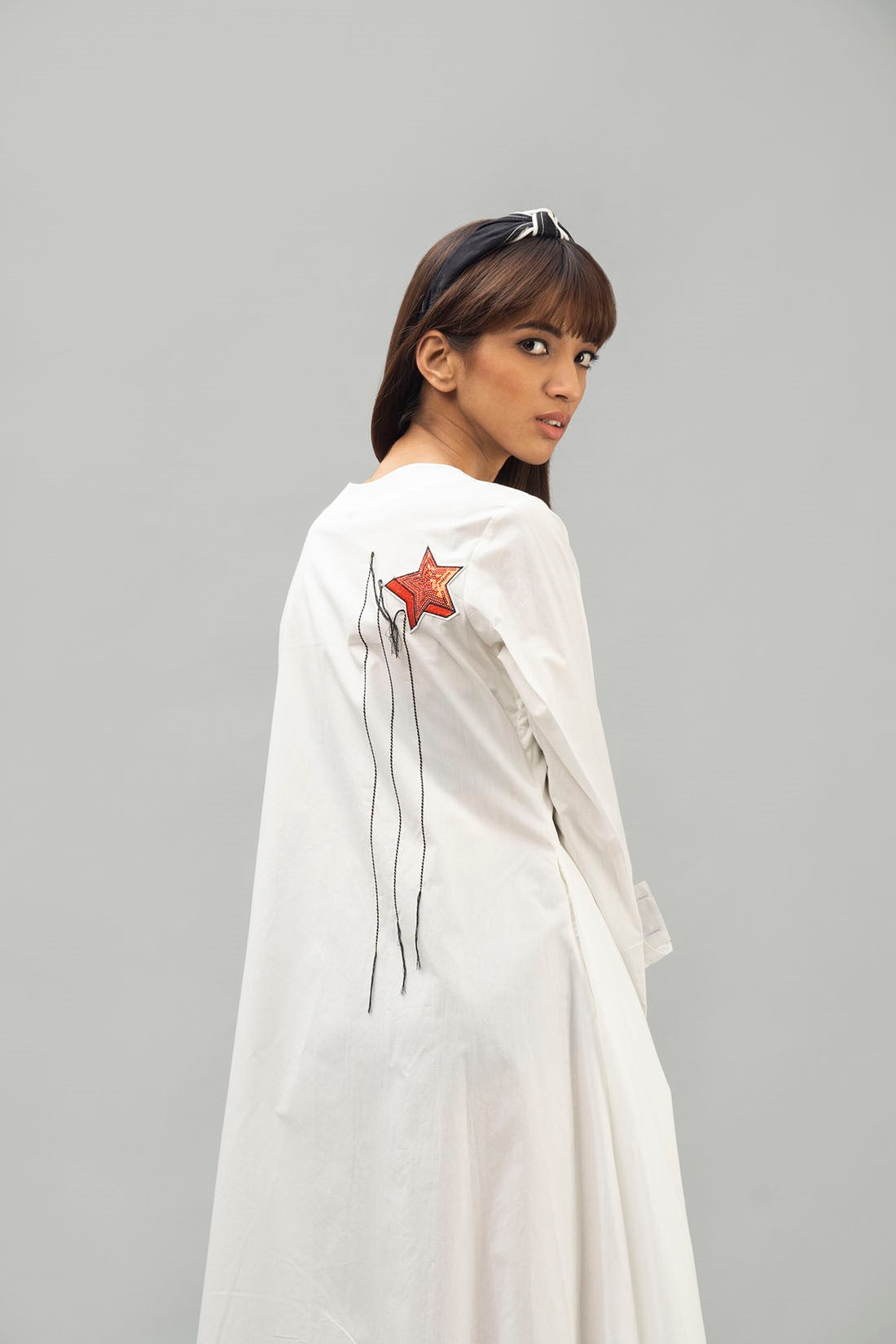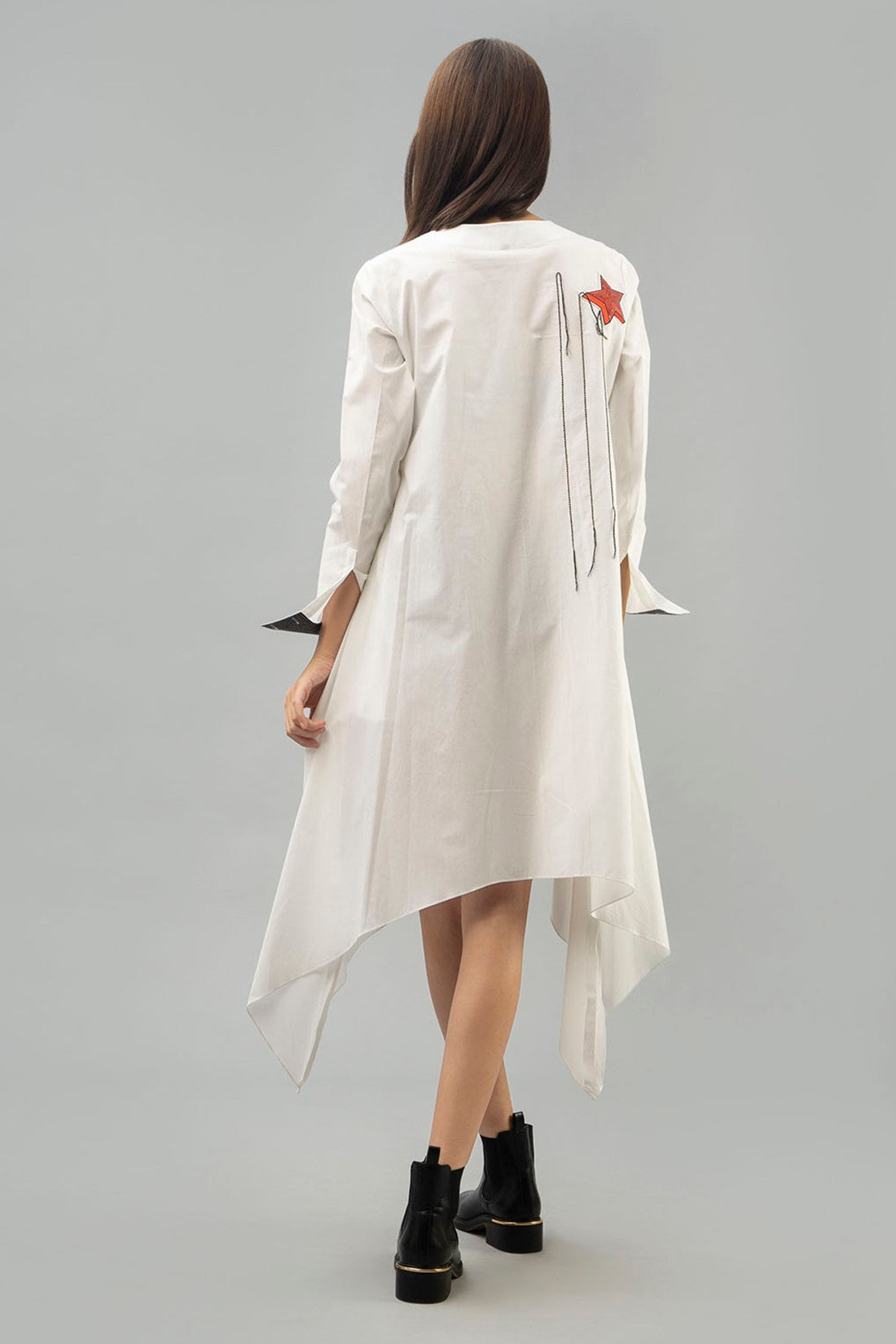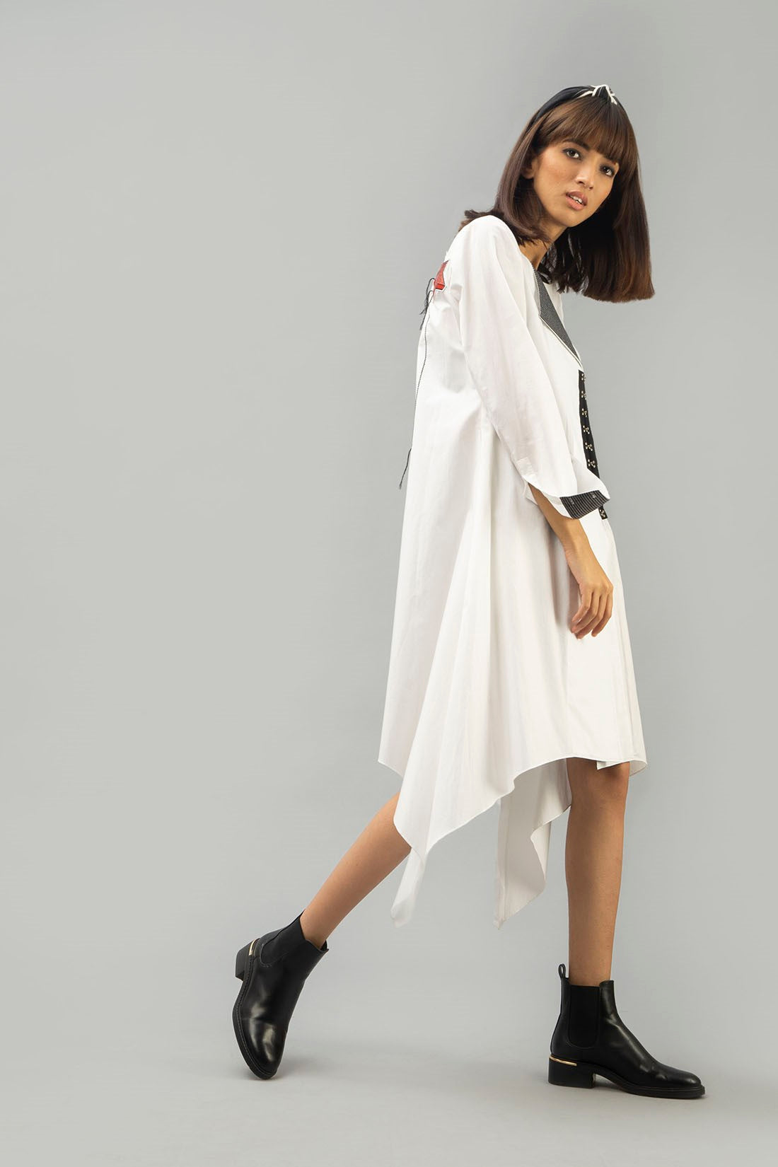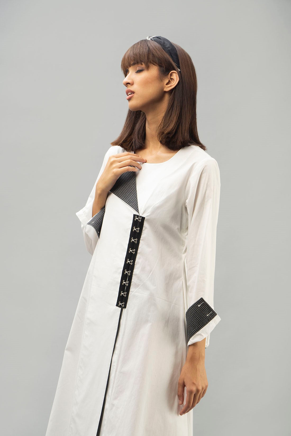 Mid length tunic/dress with metal hook fastener on the front which has longer length on side seams and contrast check facing details on front and sleeves