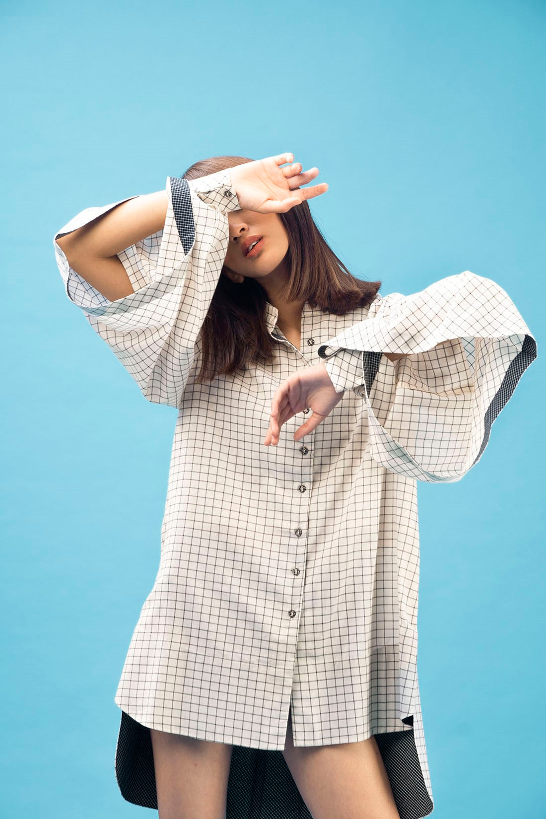 Kimono top with full front button closing and has a round collar with open slit detail on the sleeves completed with handmade buttons