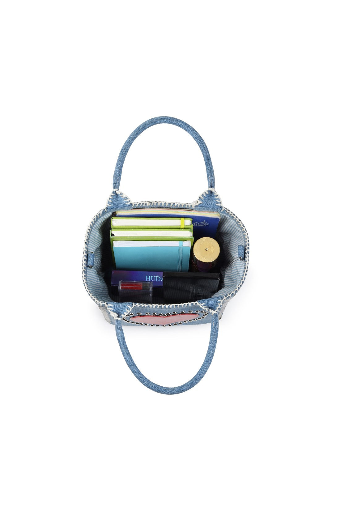A compact mini tote crafted in a textured black fabric, designed to stand out with bold red heart appliqués framed by metallic stud detailing. Finished with contrast stitching, sturdy top handles, and a soft drawstring fabric lining, this playful yet functional piece keeps your essentials secure while adding a fun, statement touch to everyday casual looks.
