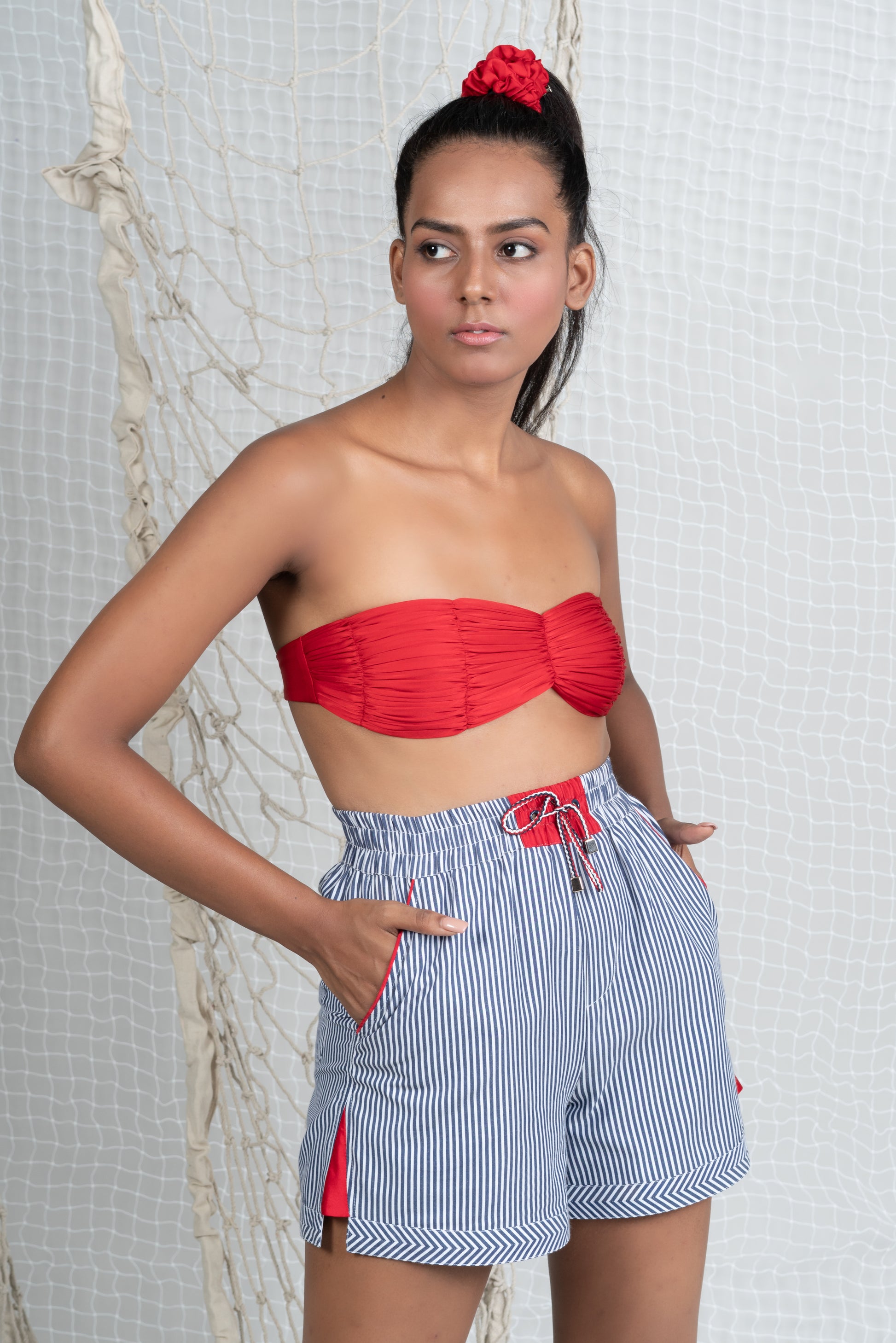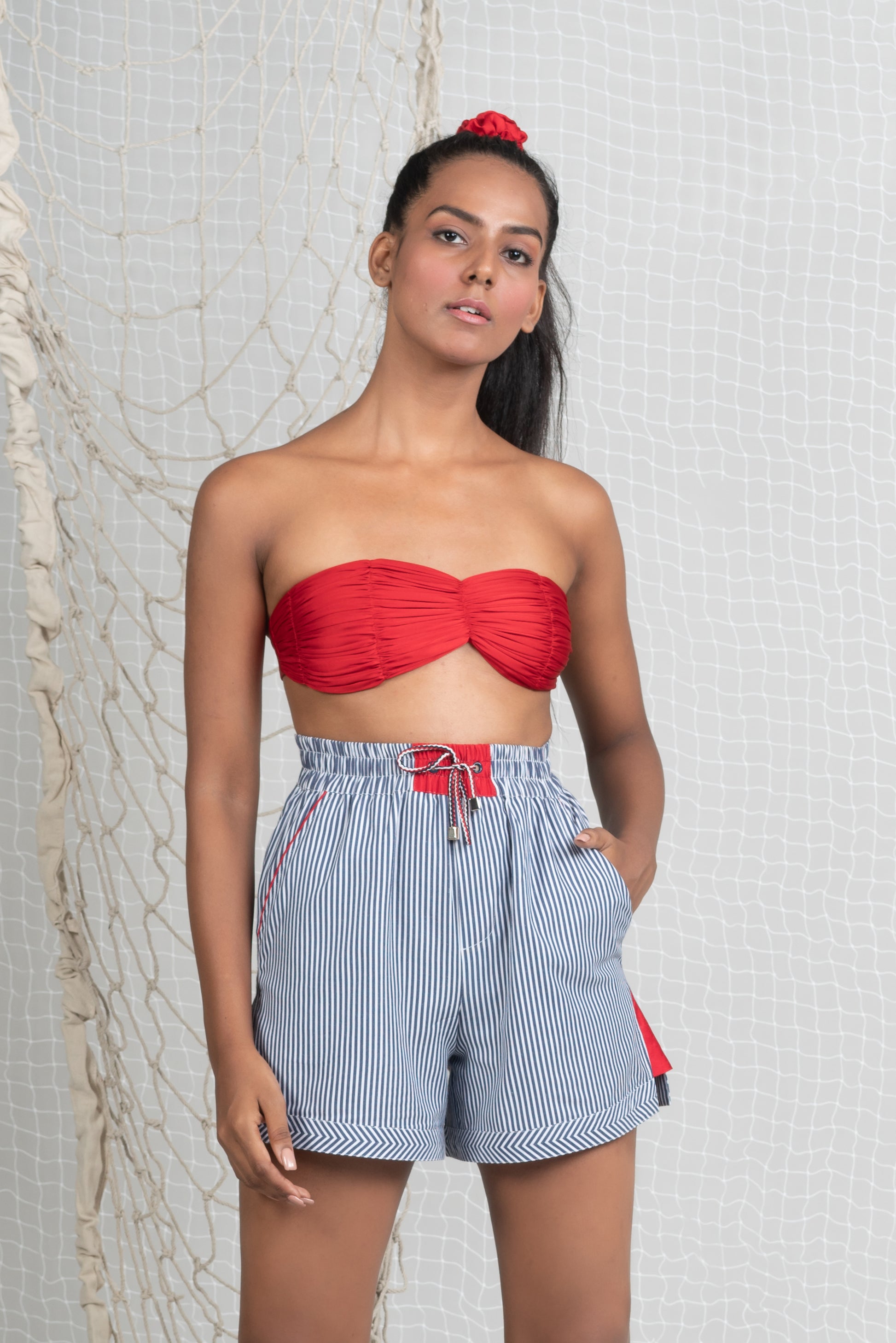 Striped shorts with curved dolphin hem in chevron pattern, slant pockets ,elasticated waist and contrast detailing