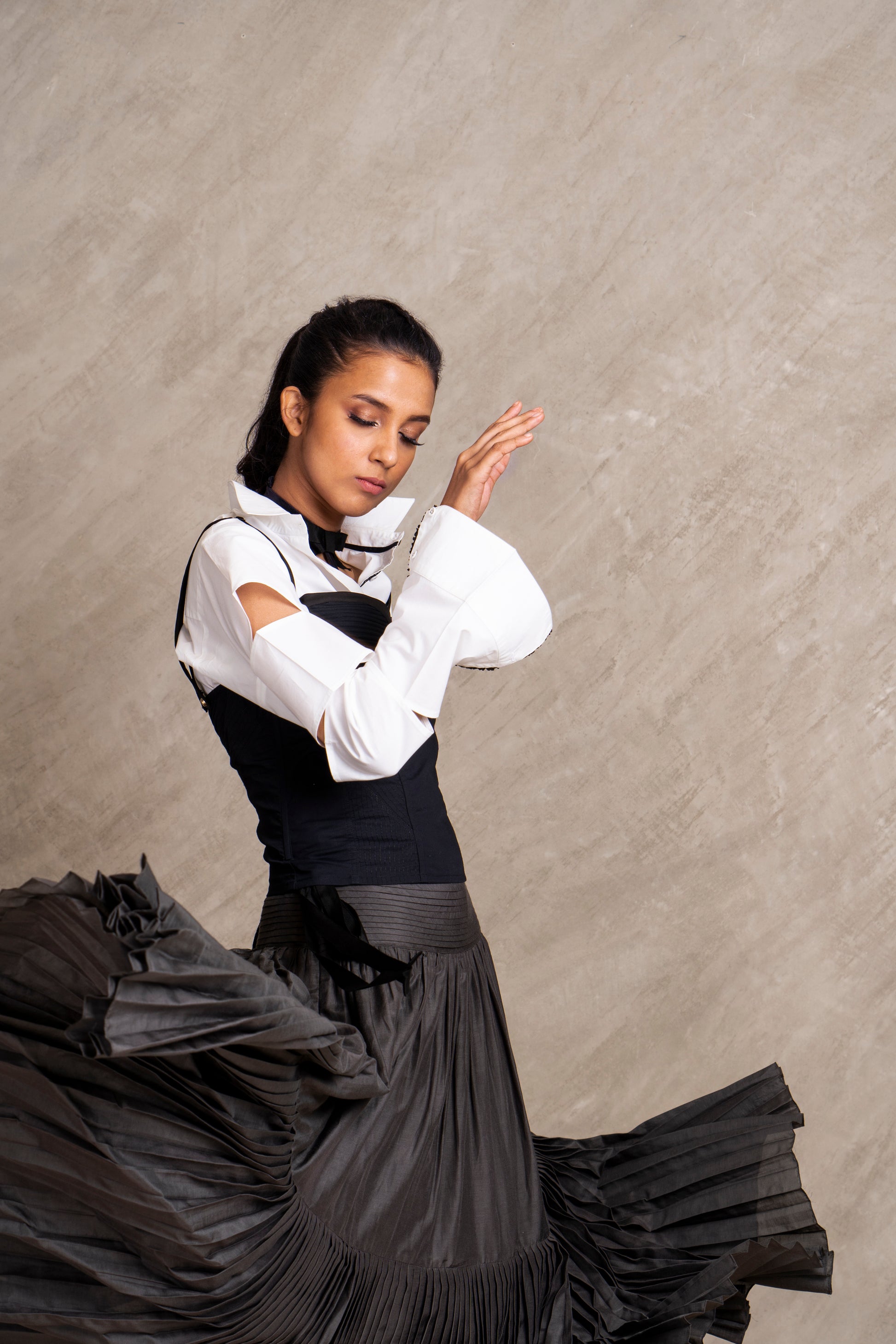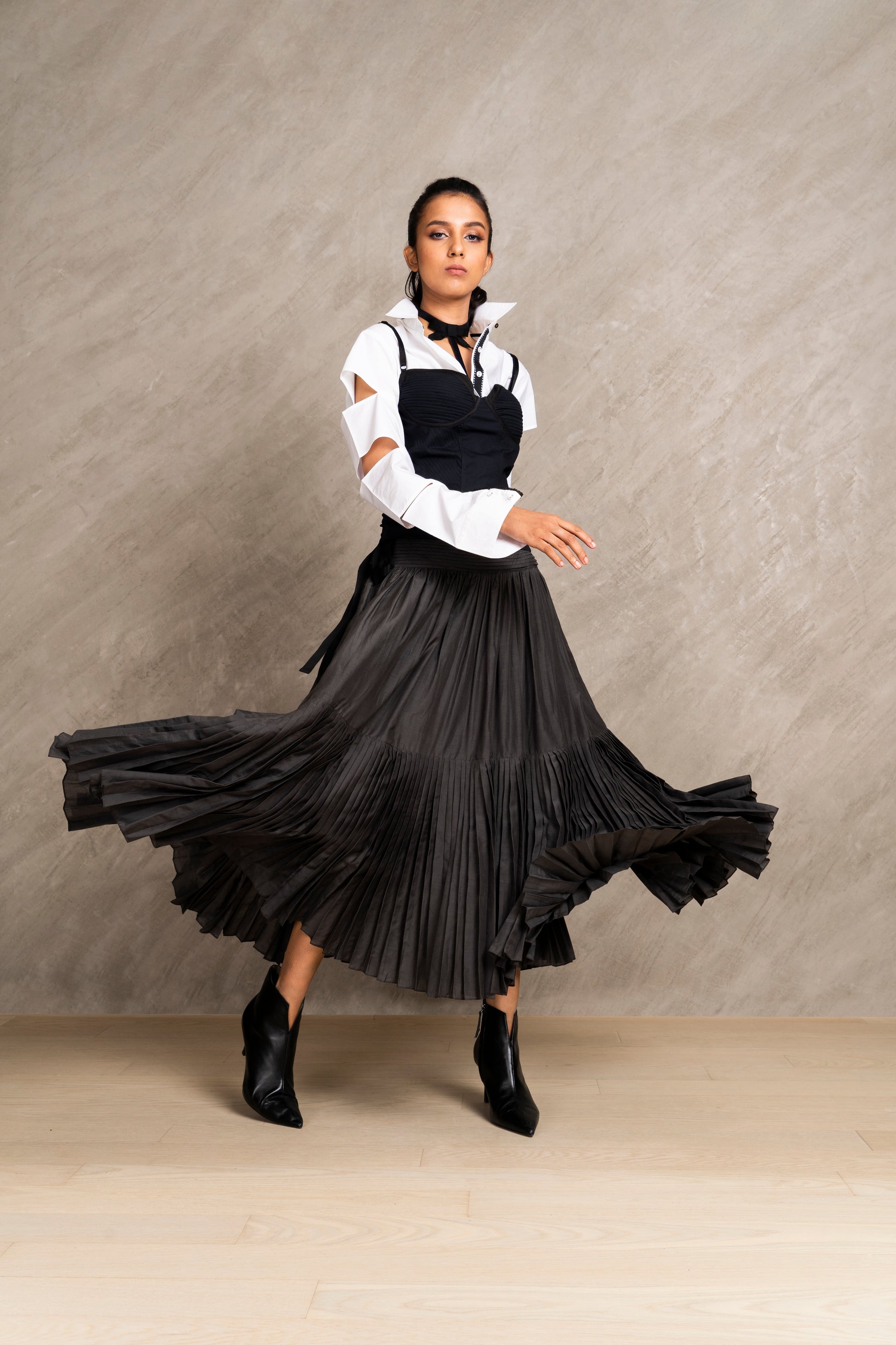 Long skirt with finely stitched pleating details all around featuring pleated cummerbund and black ribbon tie up on the waist; and pleats at the bottom to add a dramatic flair.