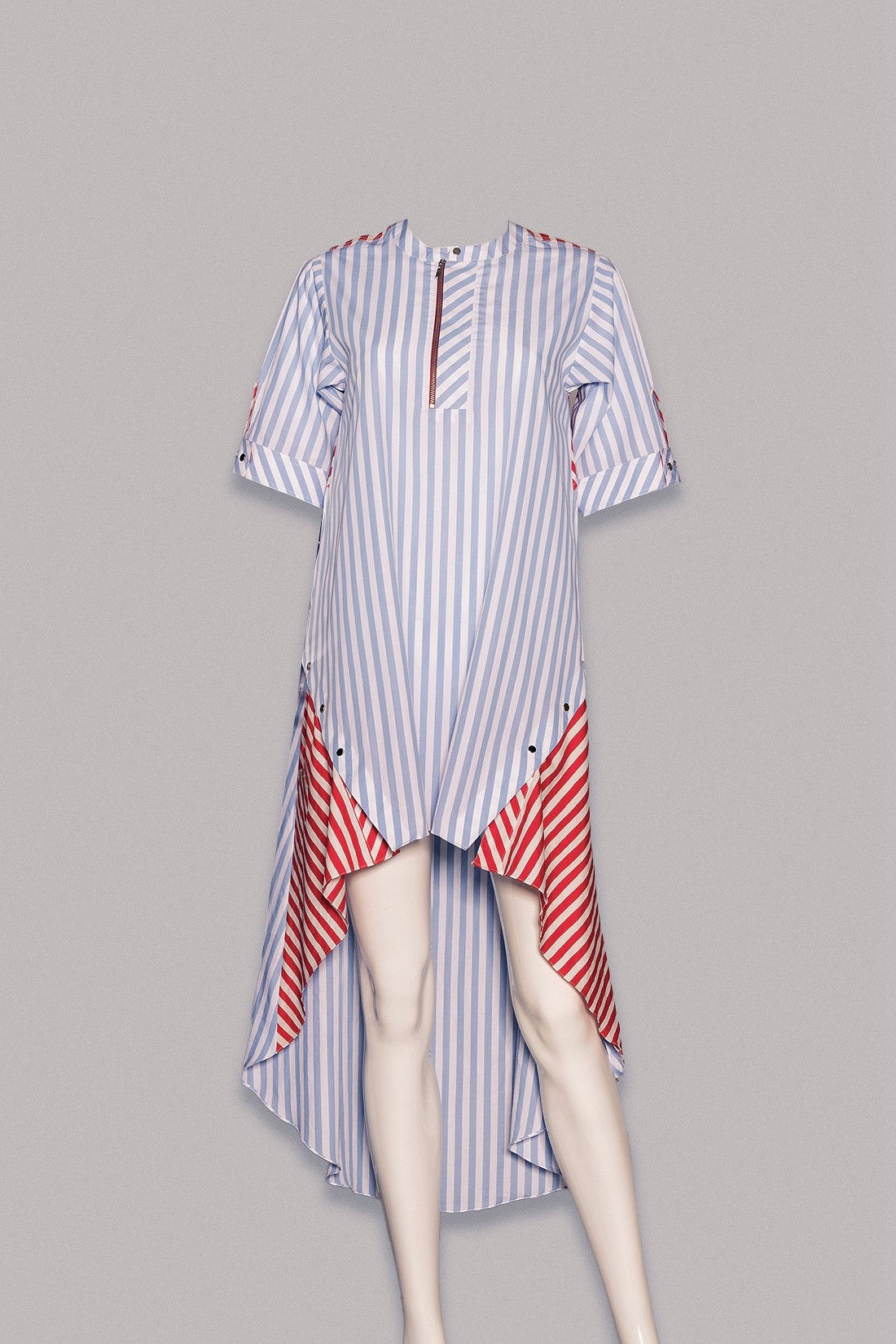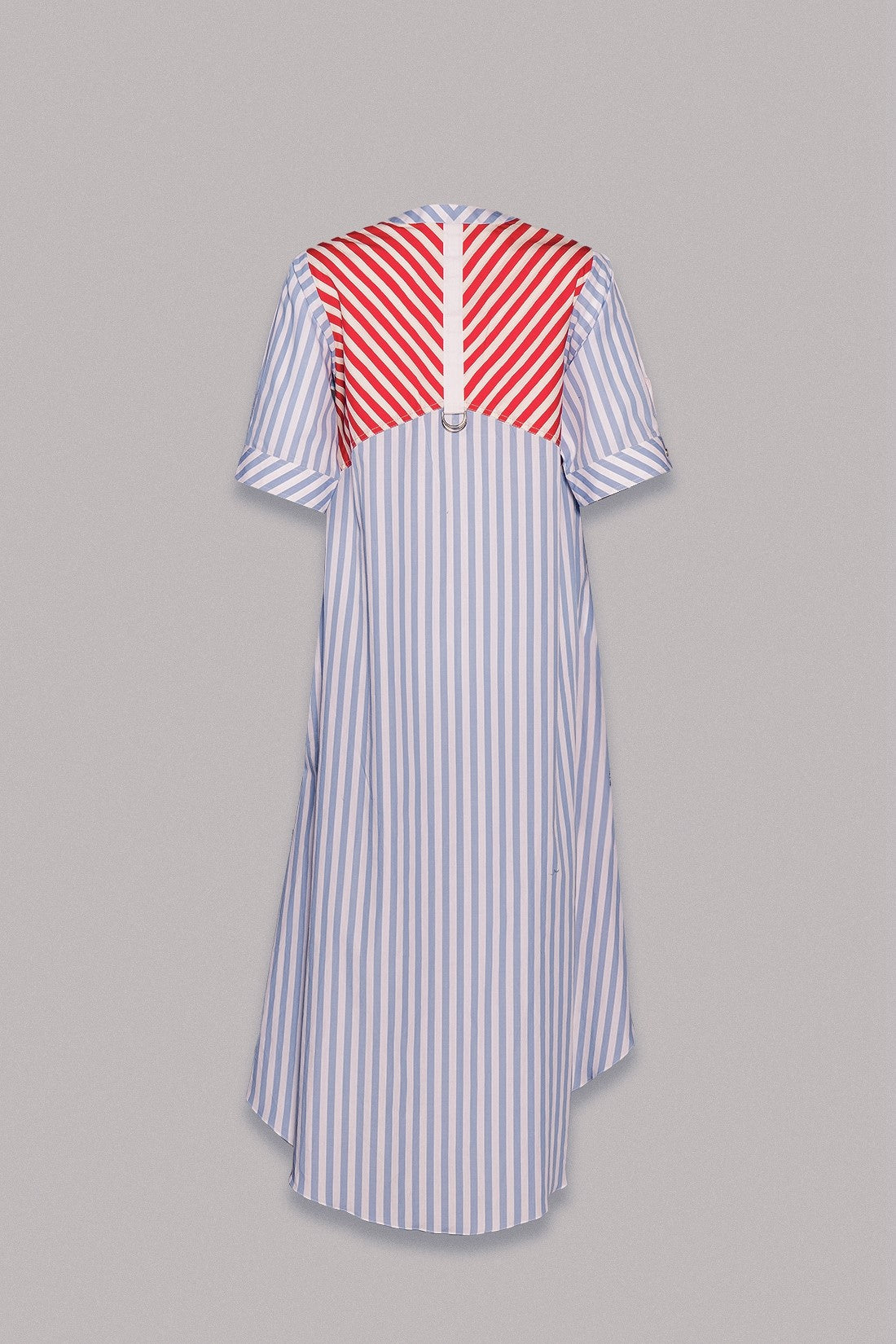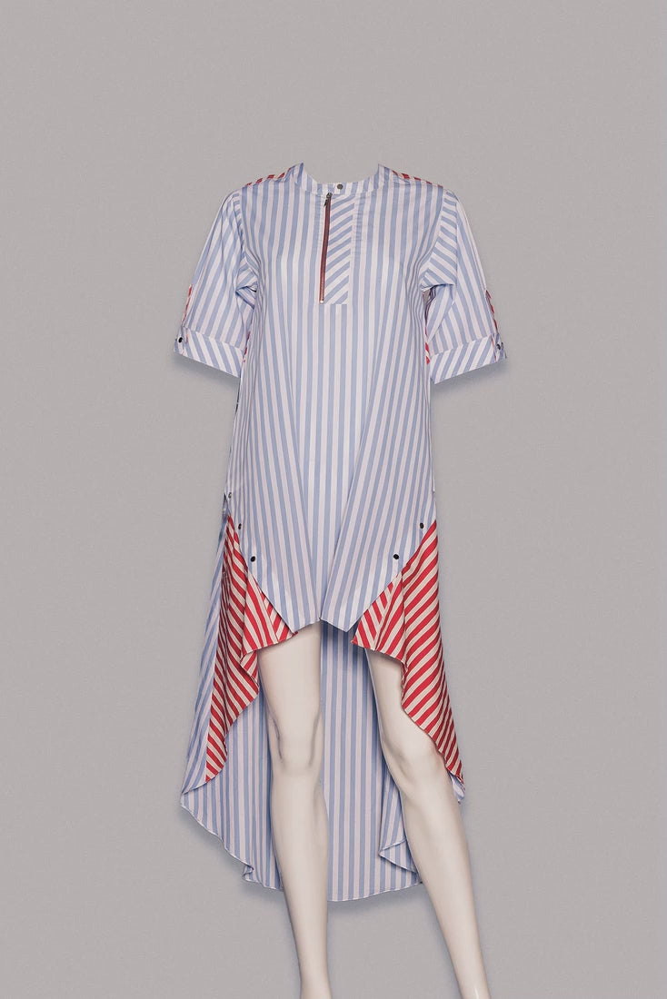 This long, laid-back dress has all the essentials: an asymmetrical hemline, stripes, slits, and metal buttons.
