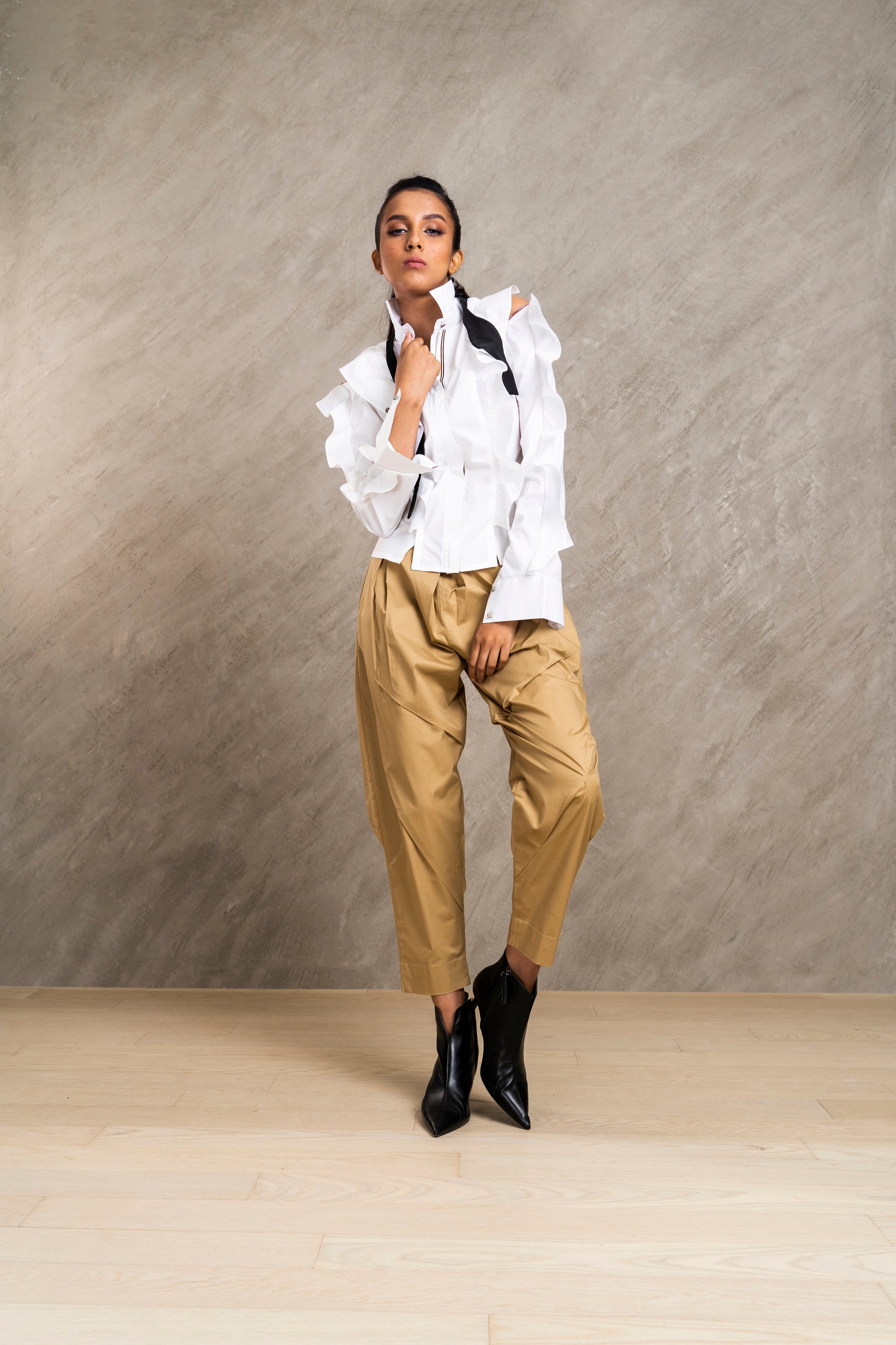 An extremely comfortable high-waisted pants with deconstructed pleats and fold details held to the back with handmade button fastener