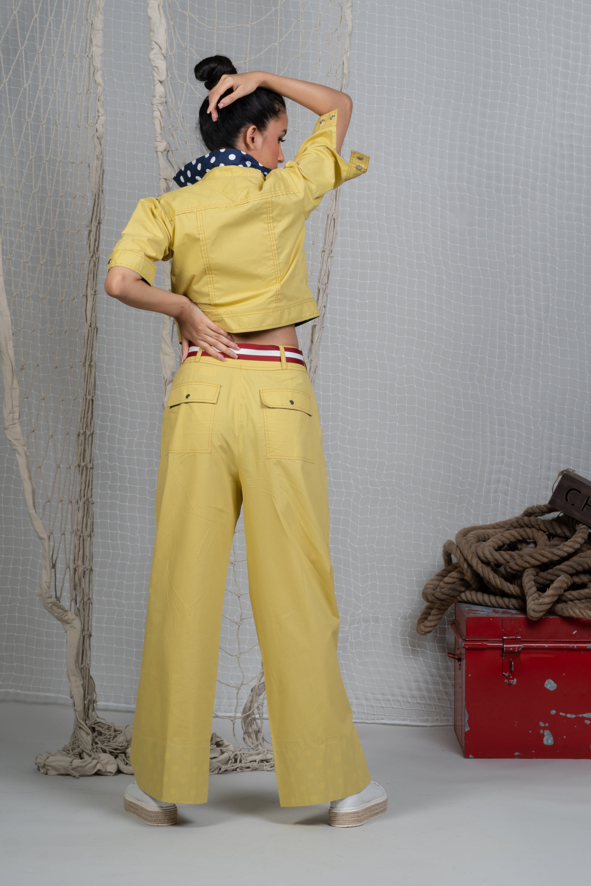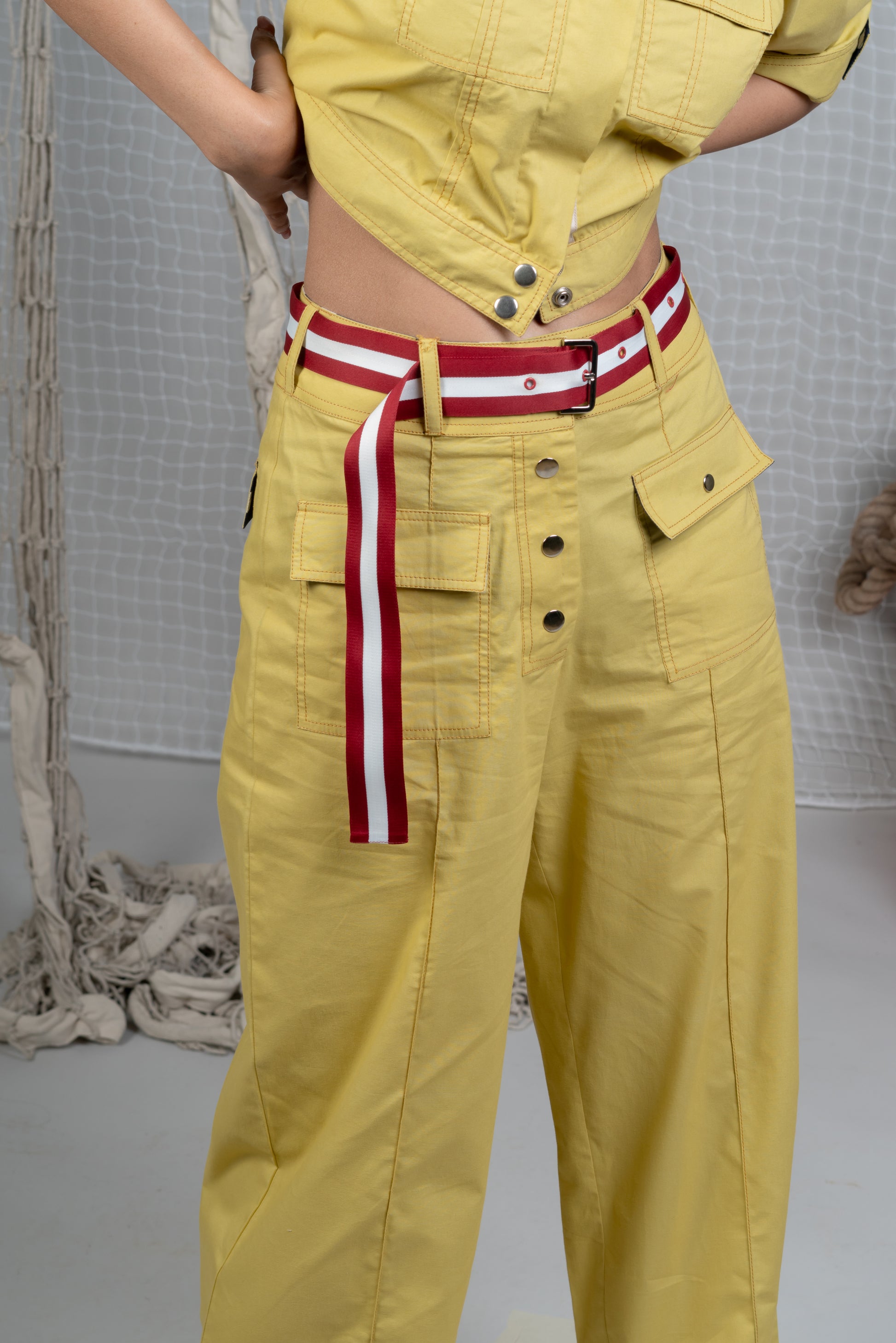 Button down fitted pants with front & back flap pockets & contrast detailing across the waist & hem.