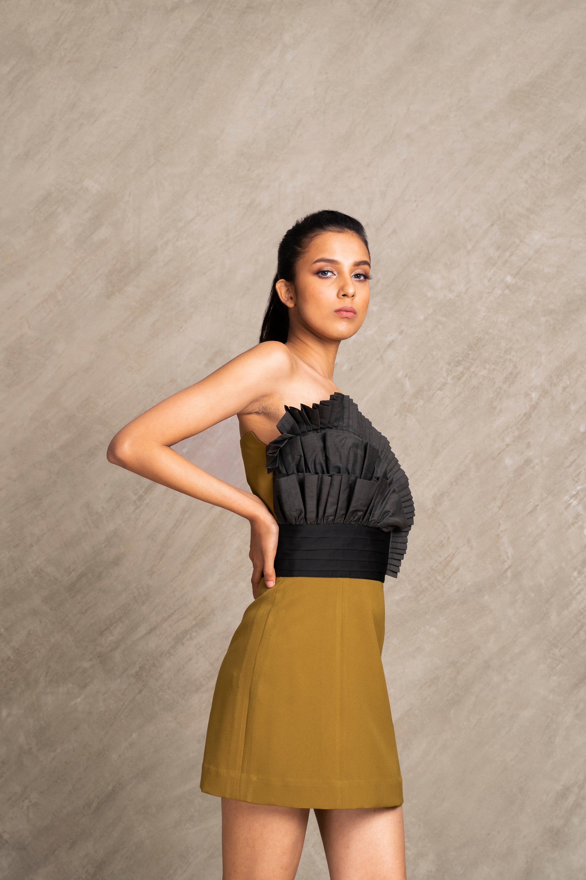 Slay your fashion game in our one piece off shoulder dress, impeccably crafted with fabric manipulation on the front and a satin cummerbund detail on the waist, completed with metal zipper at the back from top to bottom for that edgy vibe.