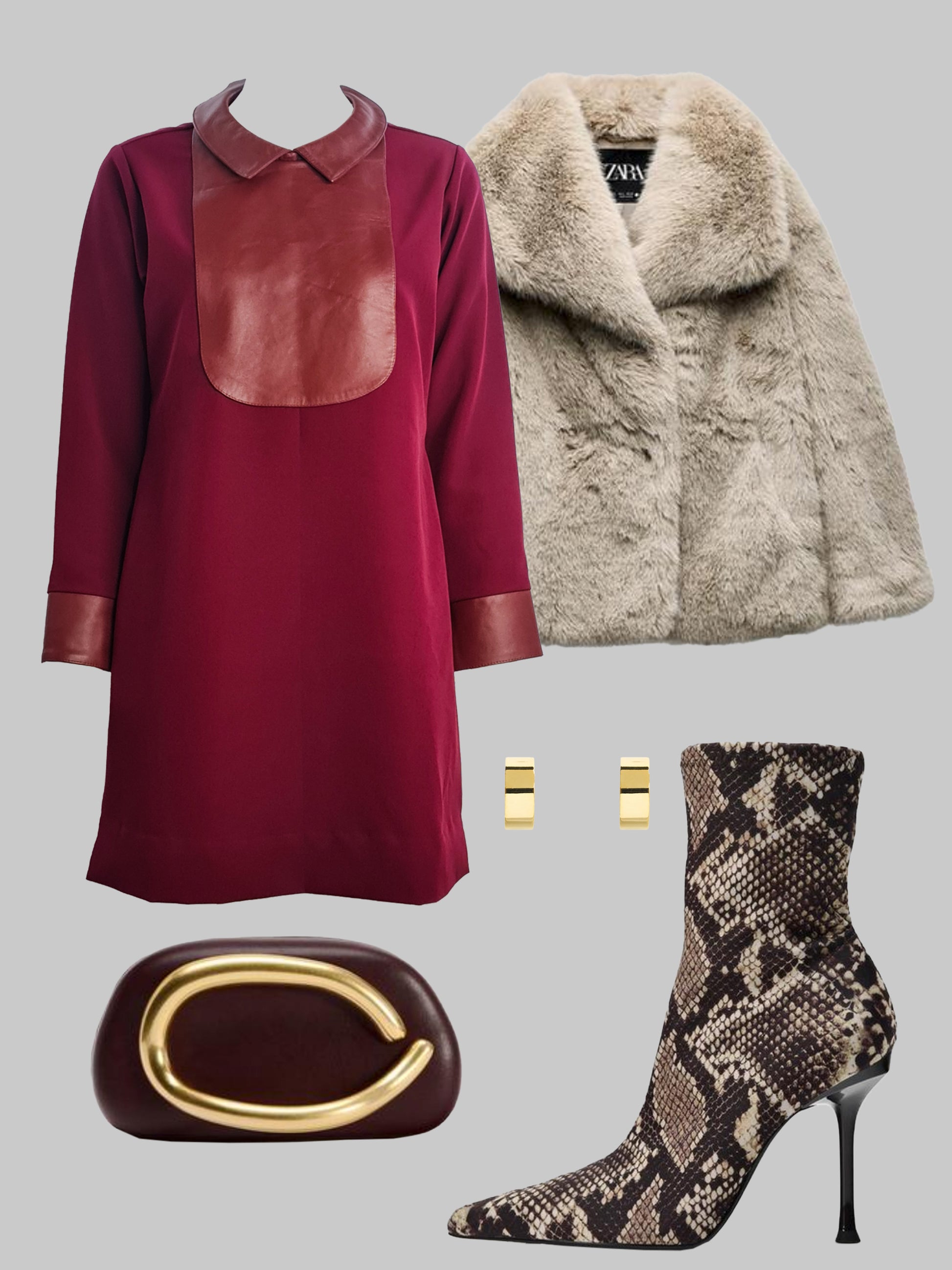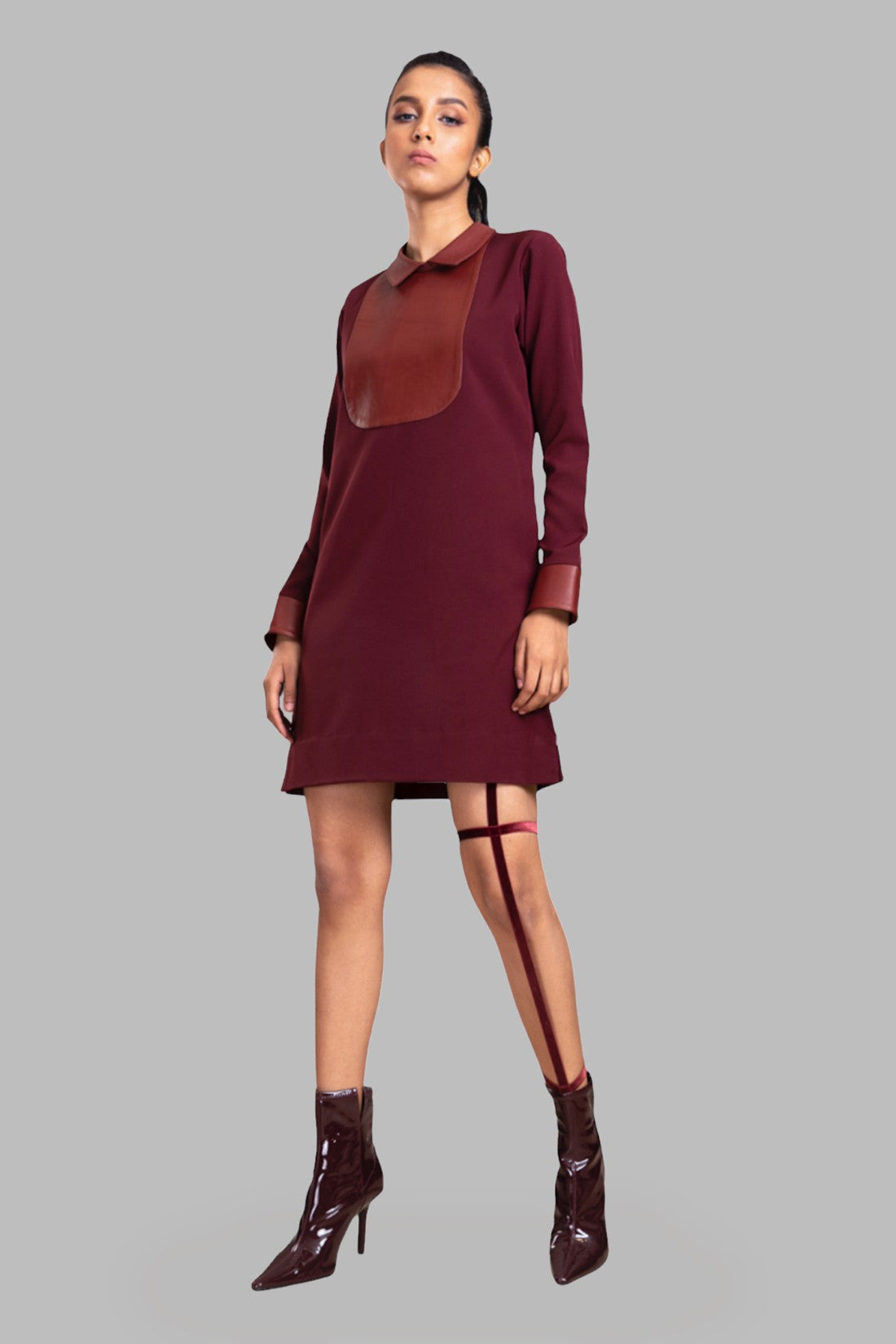 Lucy is a classic and smart dress with leather yoke and detachable leather collar fastened with beige tie up ribbon; luxurious cream satin lining the side pockets and mini slits on the side, finished off with beige lacing on the inside