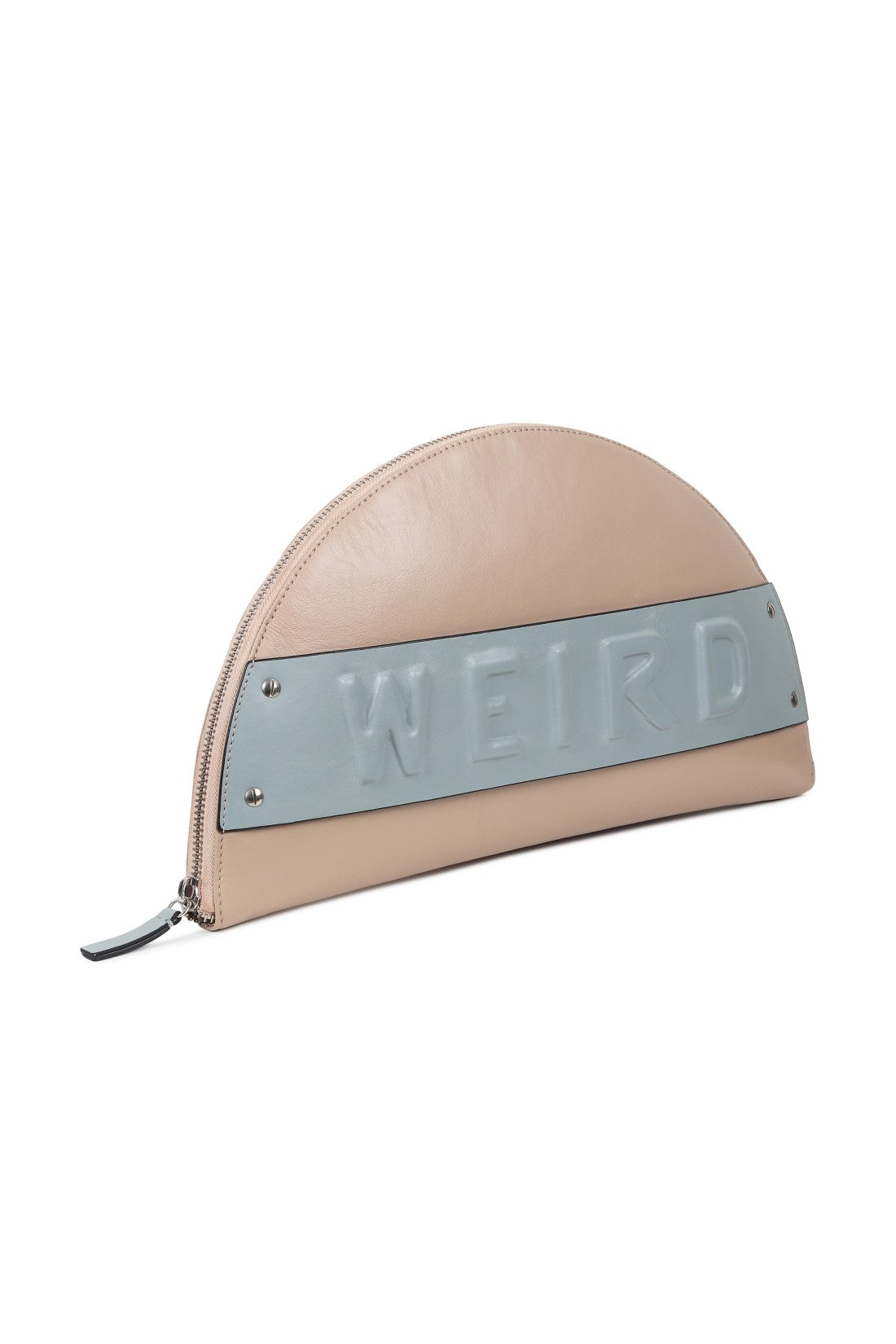 A bold half-moon clutch with a clean, structured form. It features an embossed statement detail across the front, subtle rivet accents, and a sleek zip closure—designed as a modern, playful statement accessory.
