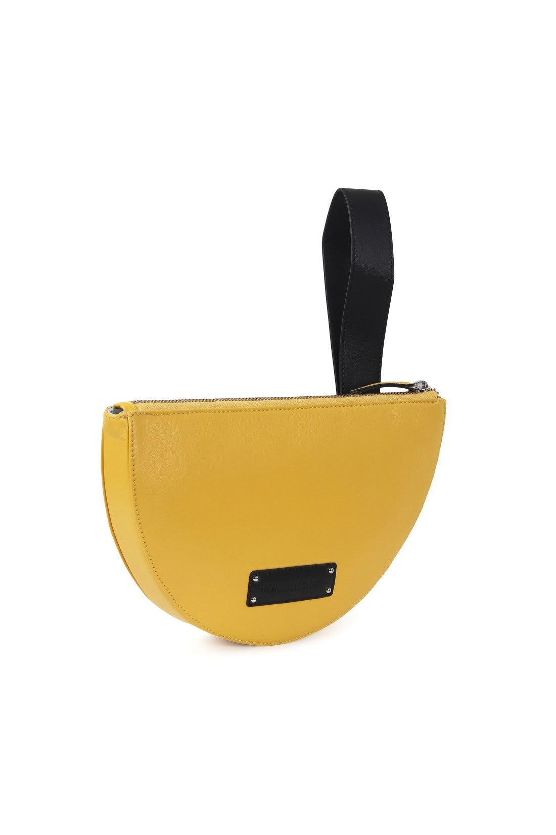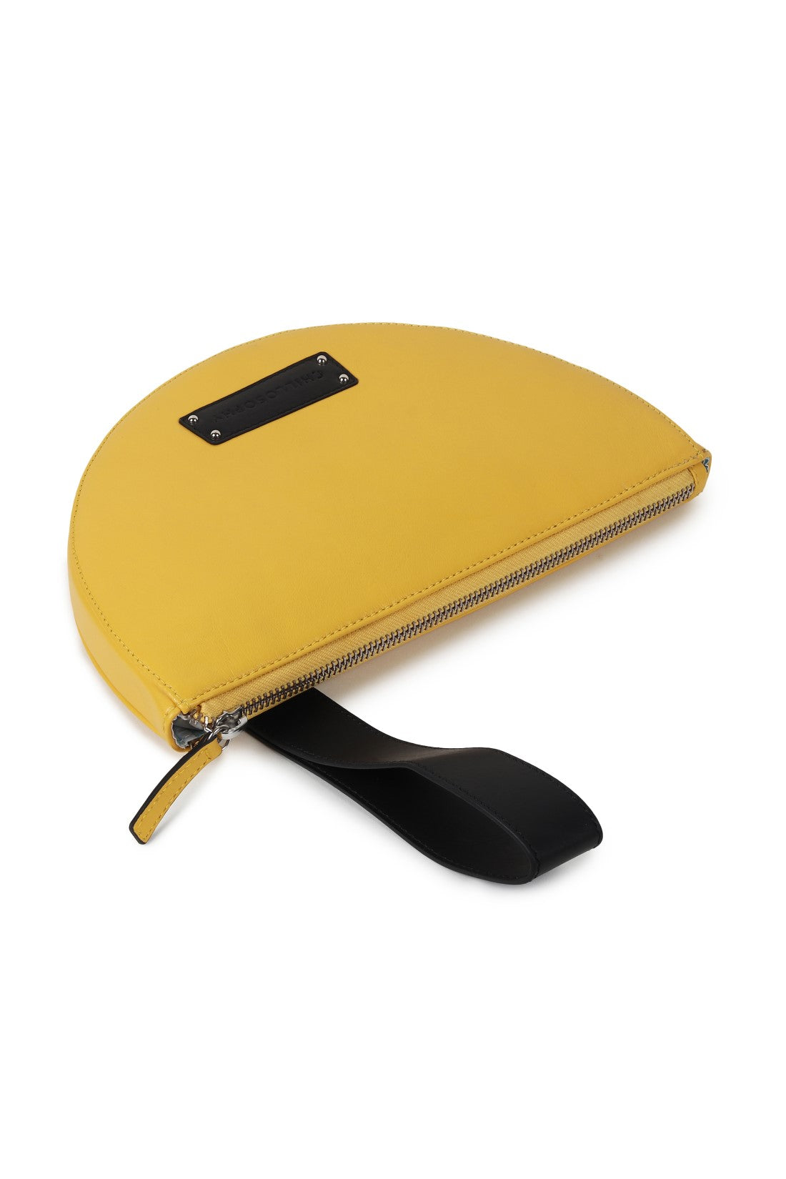 A sleek half-moon clutch with a minimalist profile. Designed with a subtle brand plaque, a clean zip closure, and a structured wrist strap, it’s a refined yet playful statement made for effortless day-to-night styling.