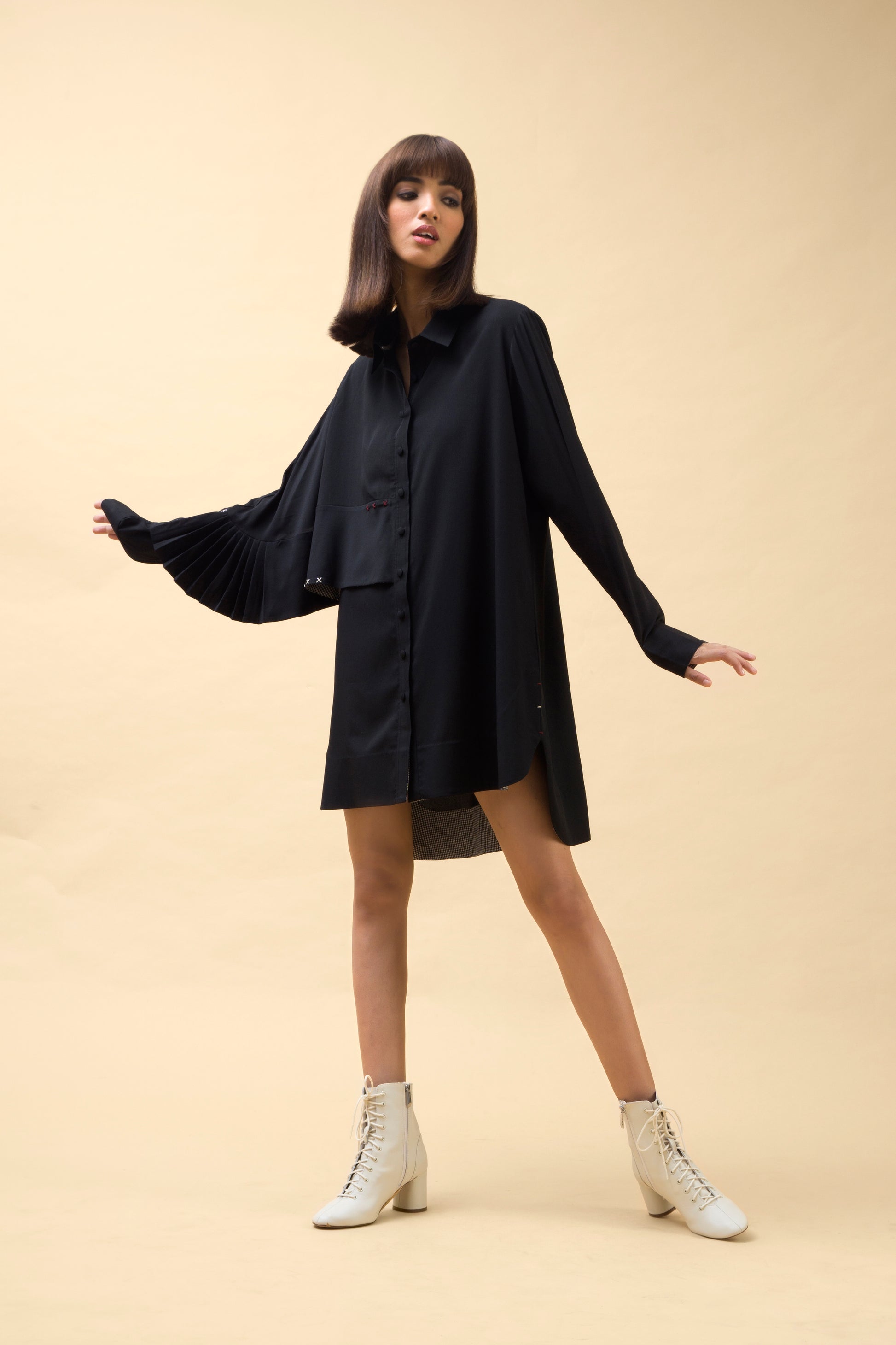 A full front buttoned shirt dress with cape wing sleeve details that features check facing on one side, military accents and handstitch details