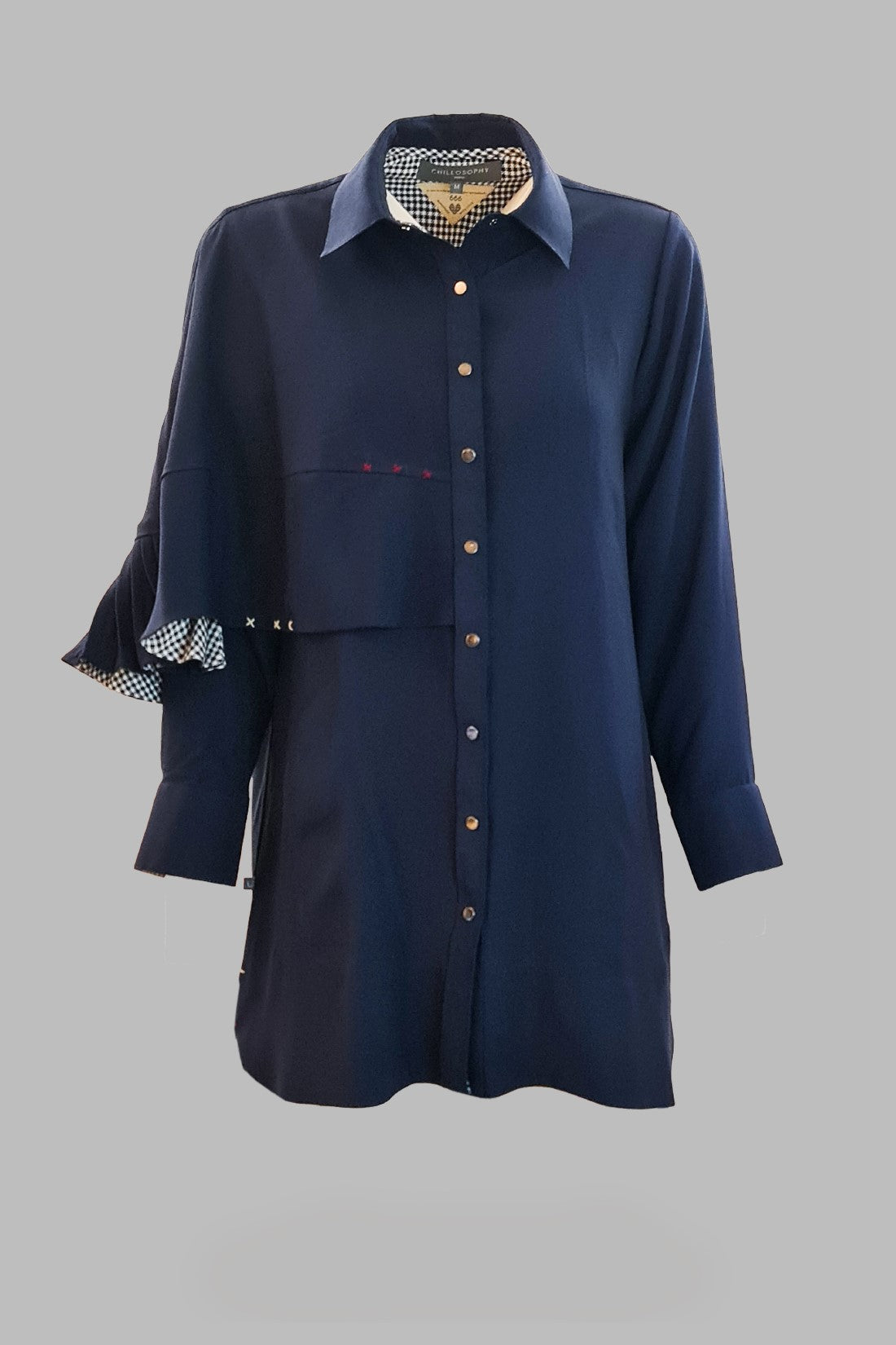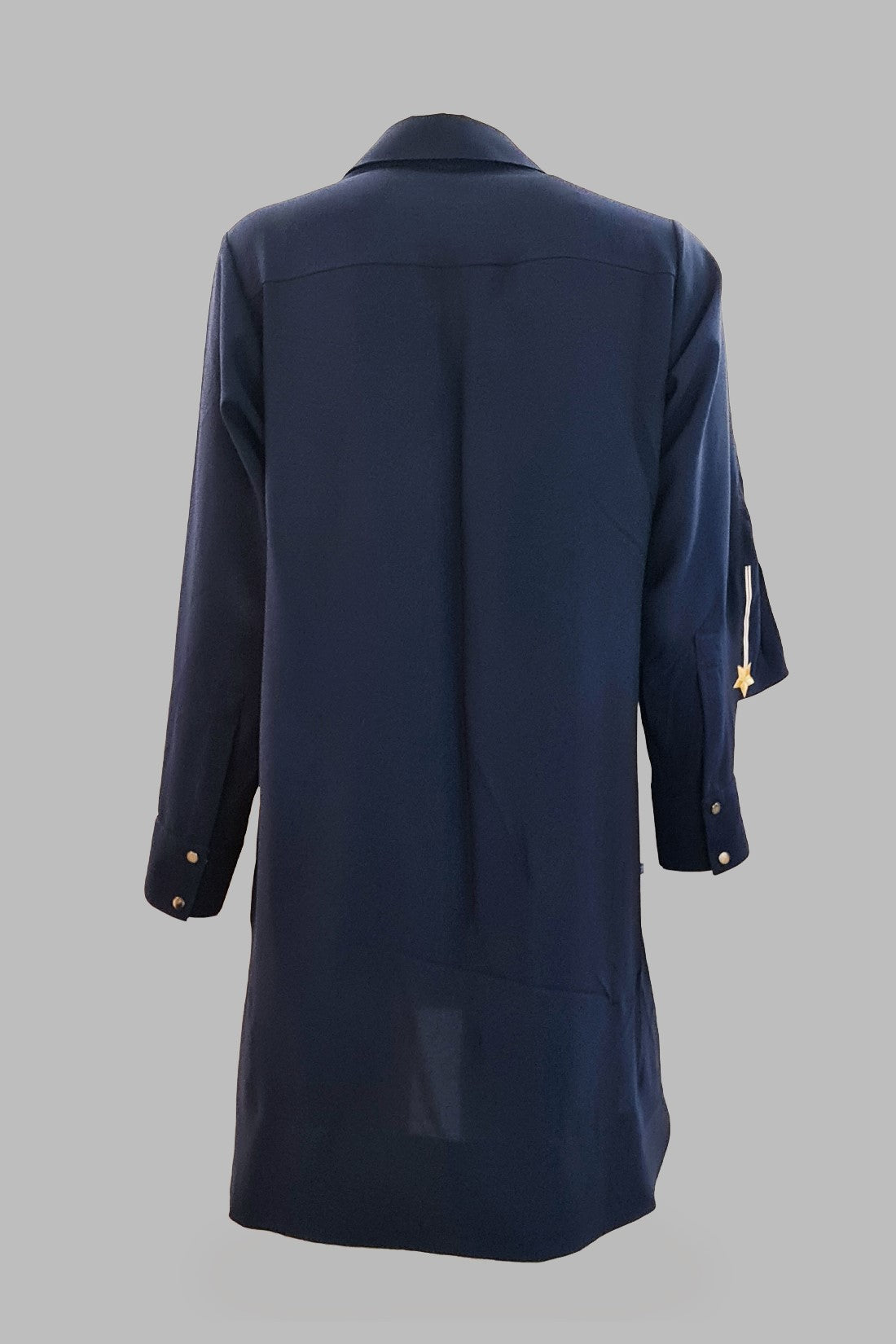 A full front buttoned shirt dress with cape wing sleeve details that features check facing on one side, military accents and handstitch details
