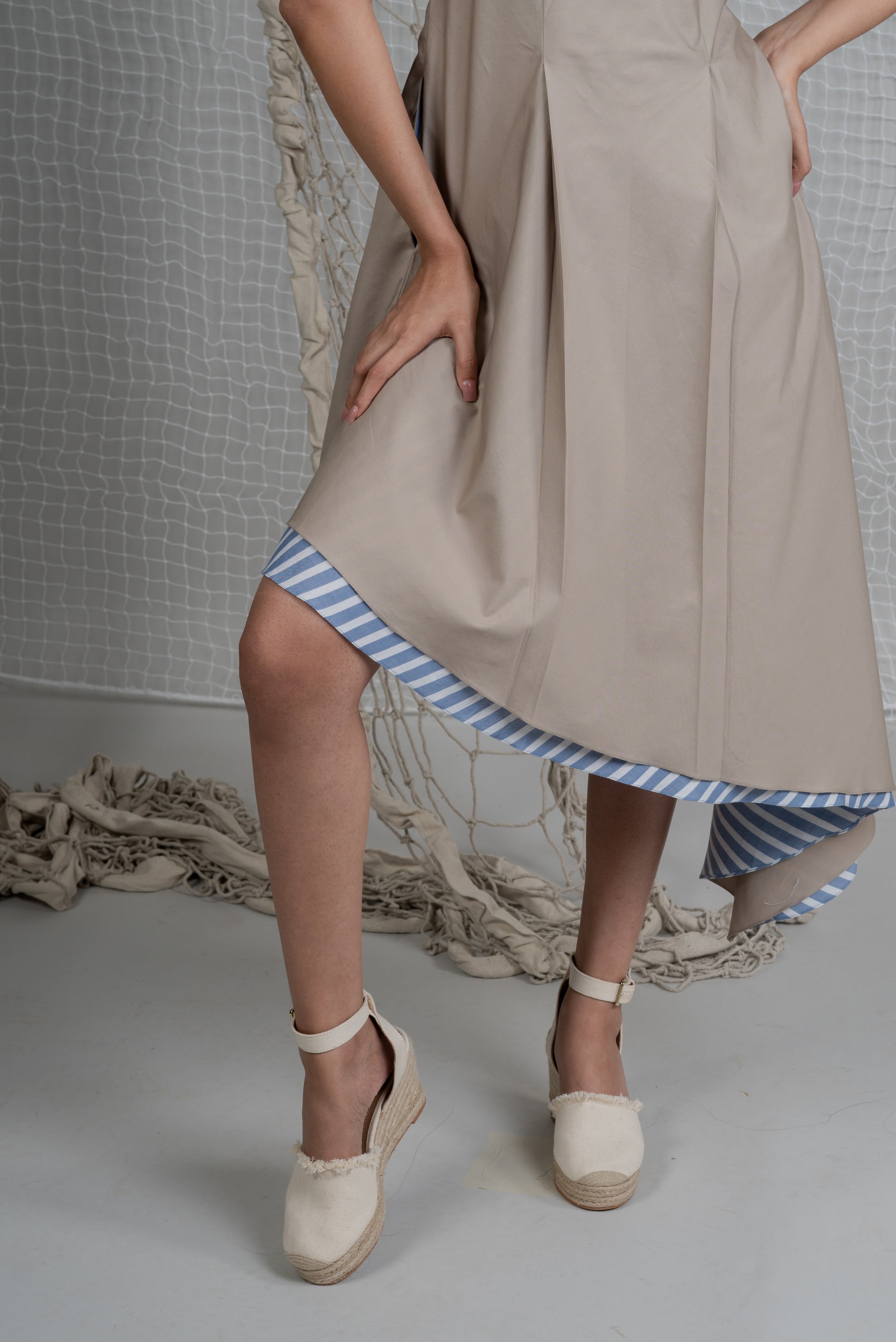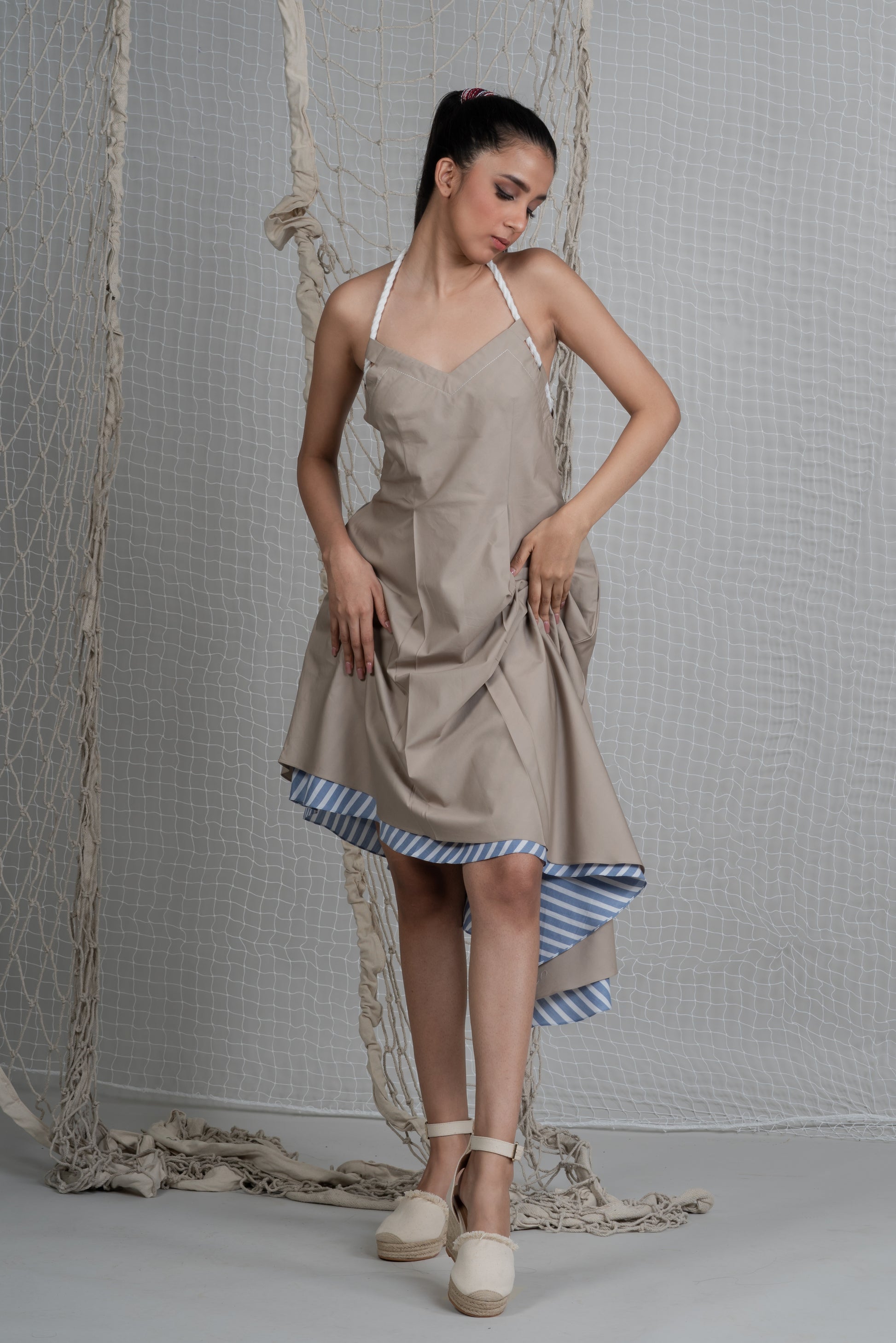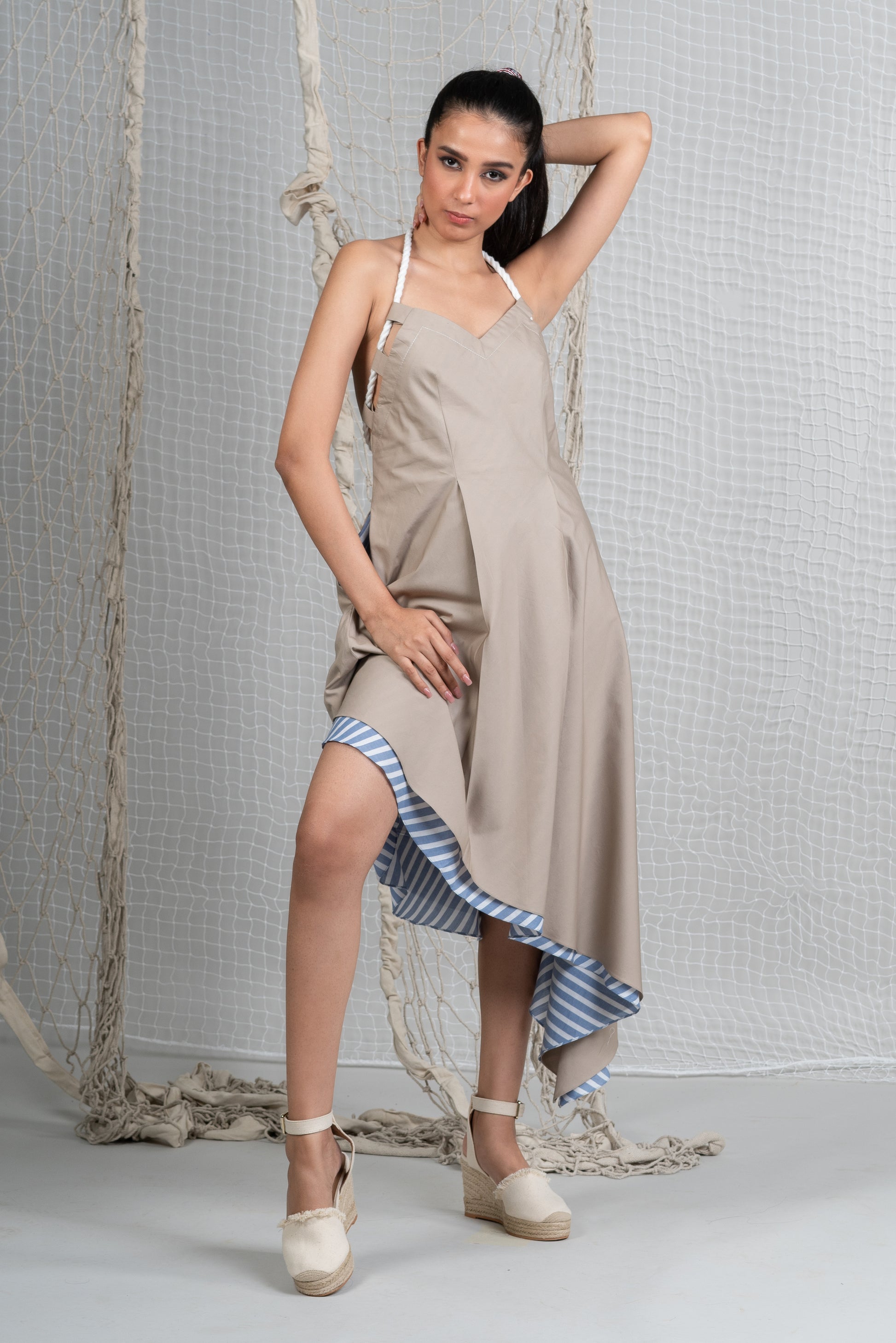 Halterneck bare back dress in Sand Beige Poplin Cotton with adjustable rope tie holding the silhouette for perfect fit, pockets in light blue stripes lining with soft flowy, asymmetrical hem.