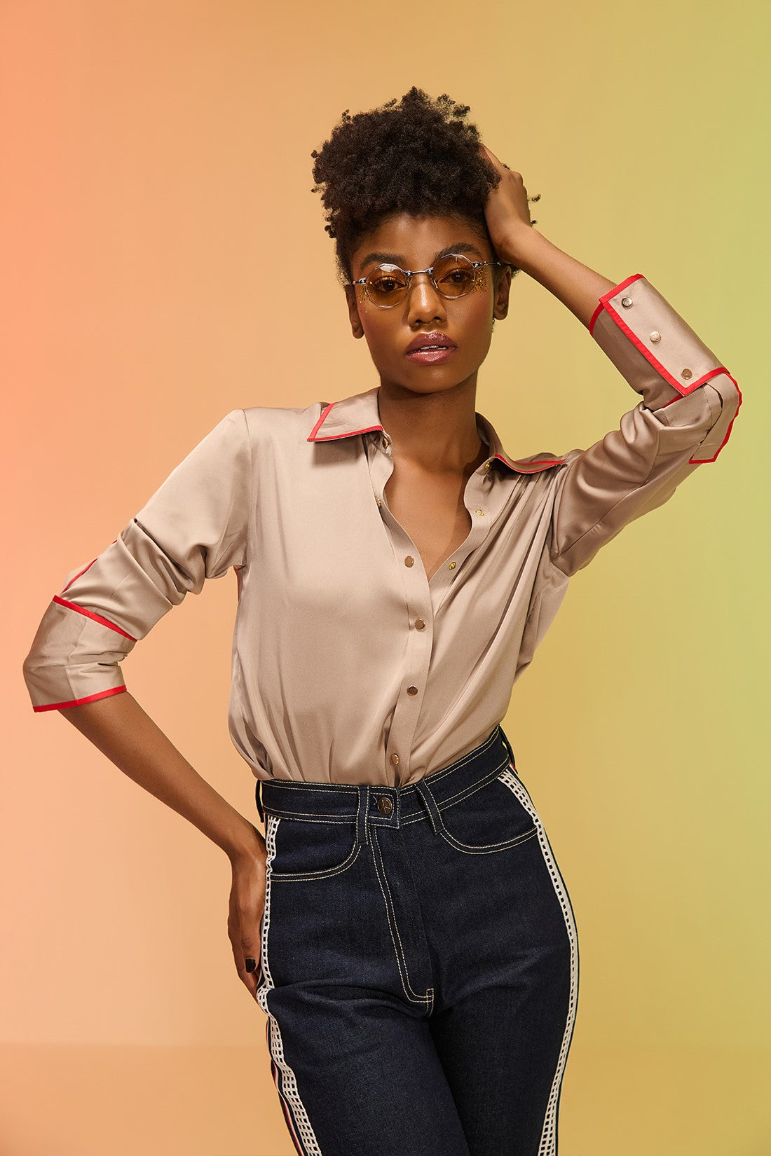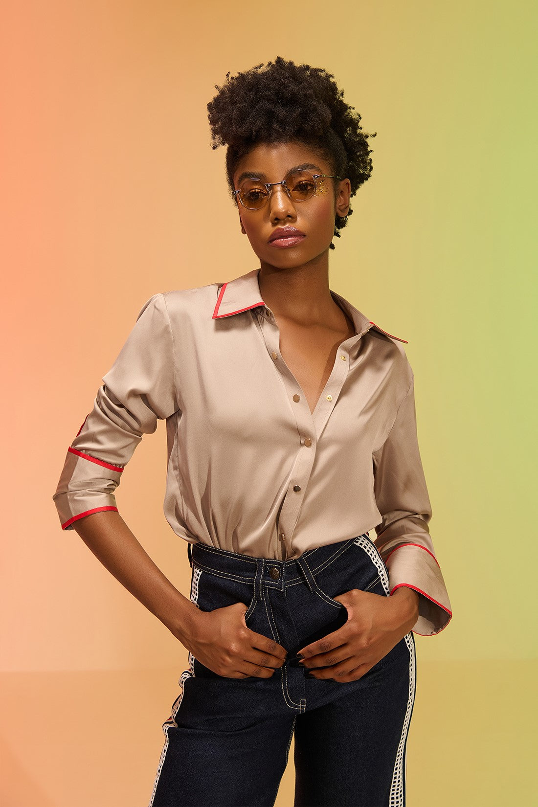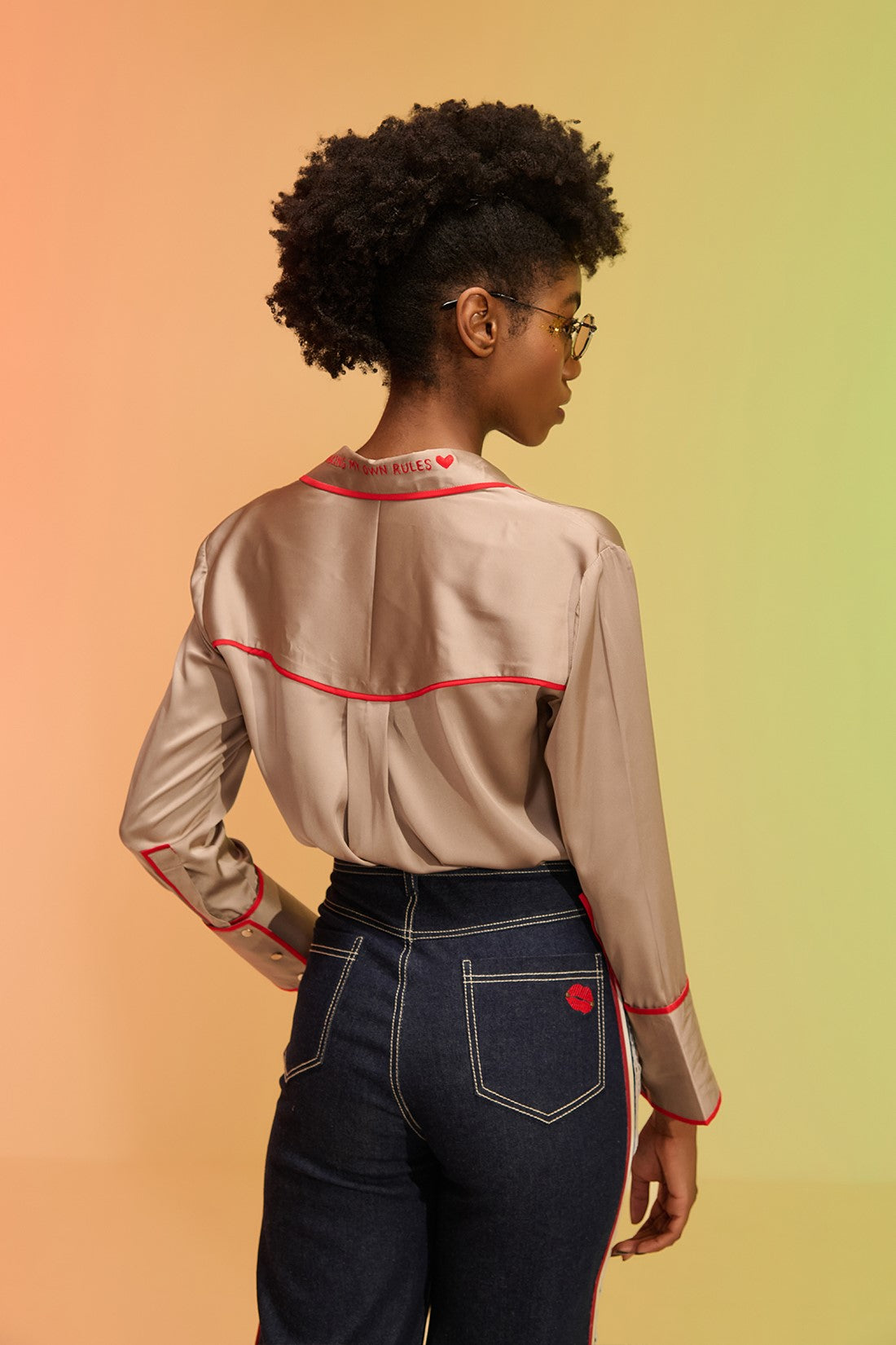 A chic satin shirt with bright contrast colour piping, metallic buttons and an inspiring quote to rock your look.