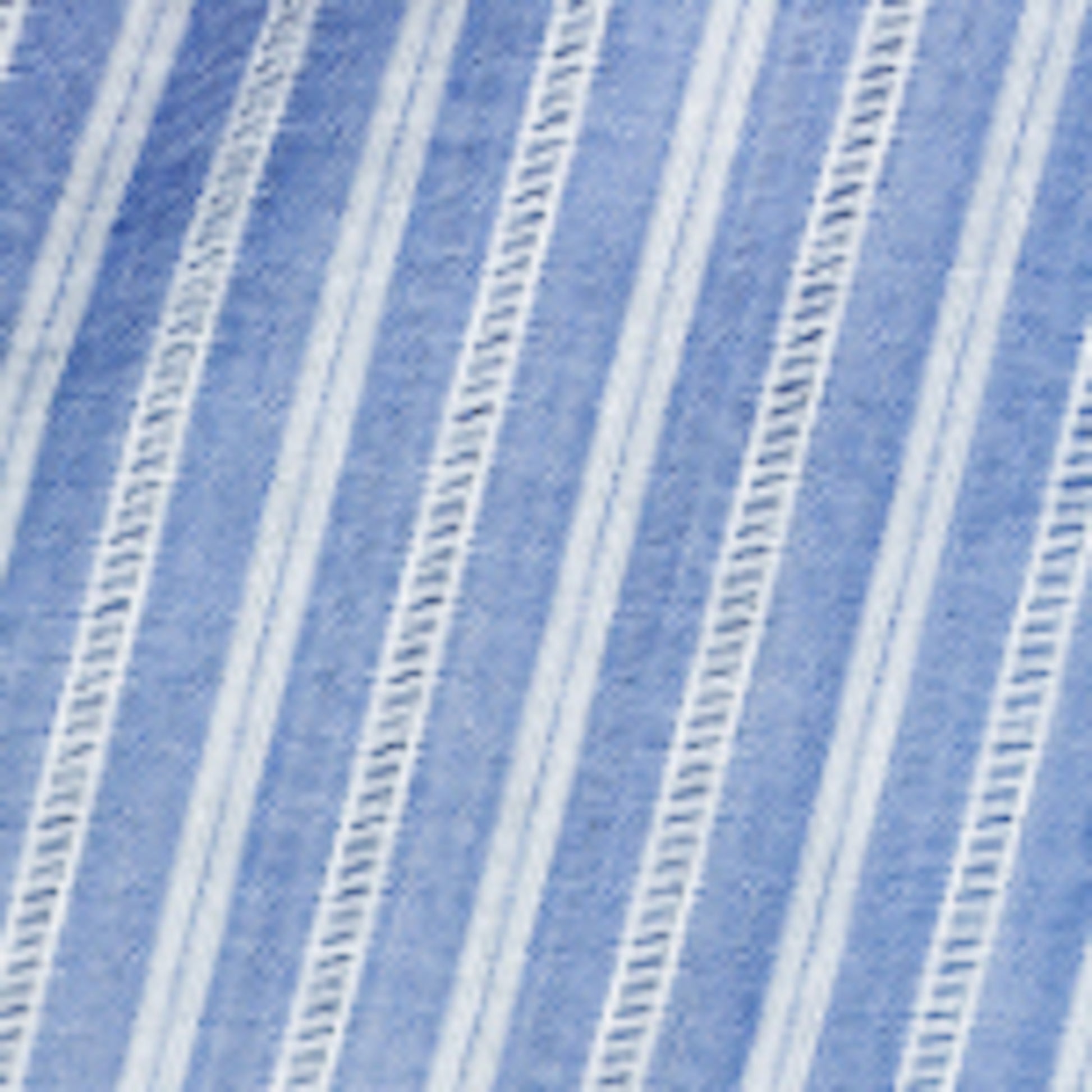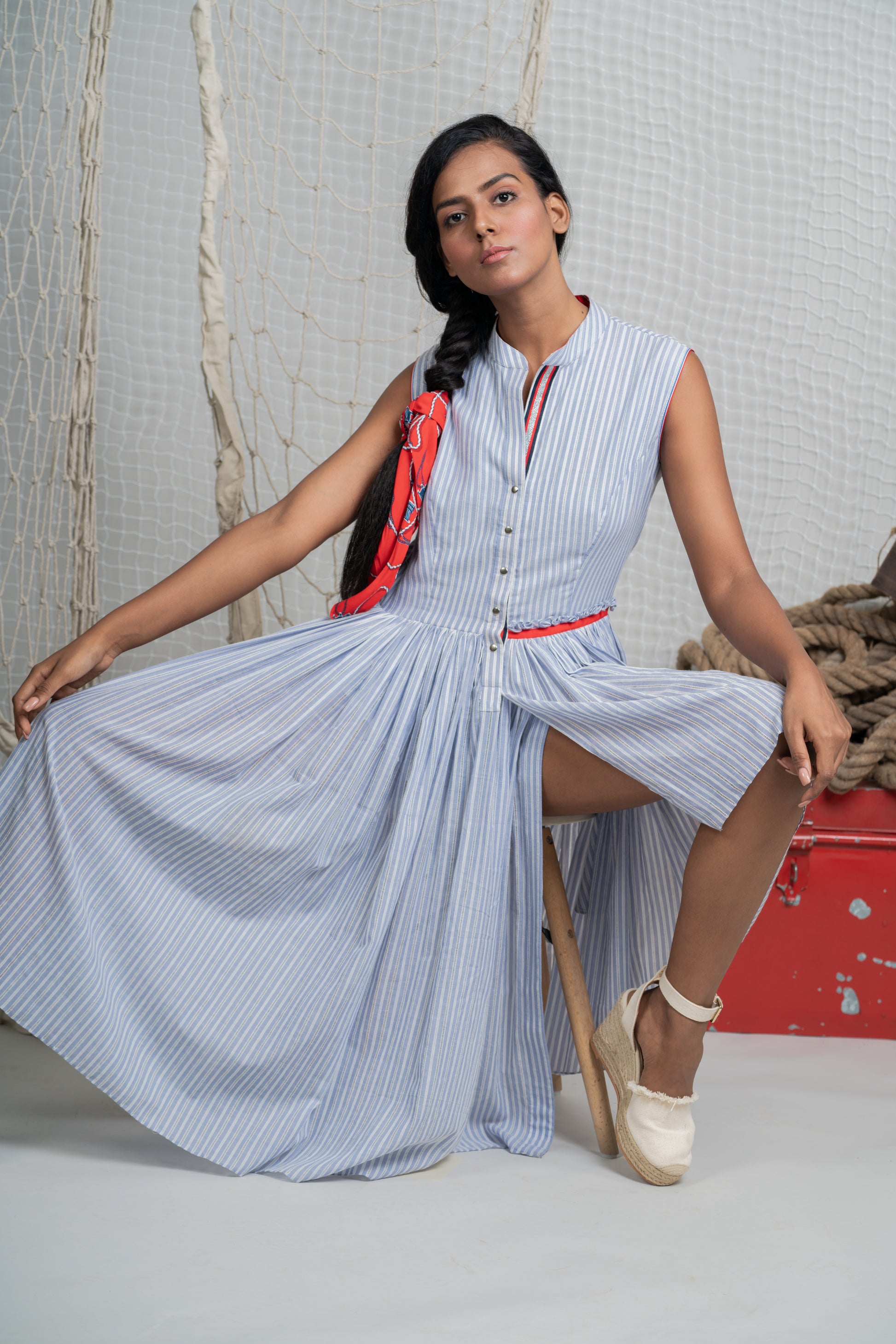 Sleeveless beach dress with stand round collar and stripes detailing on the front buttons and pleated details to create an asymmetrical hem completed with a red belt accent