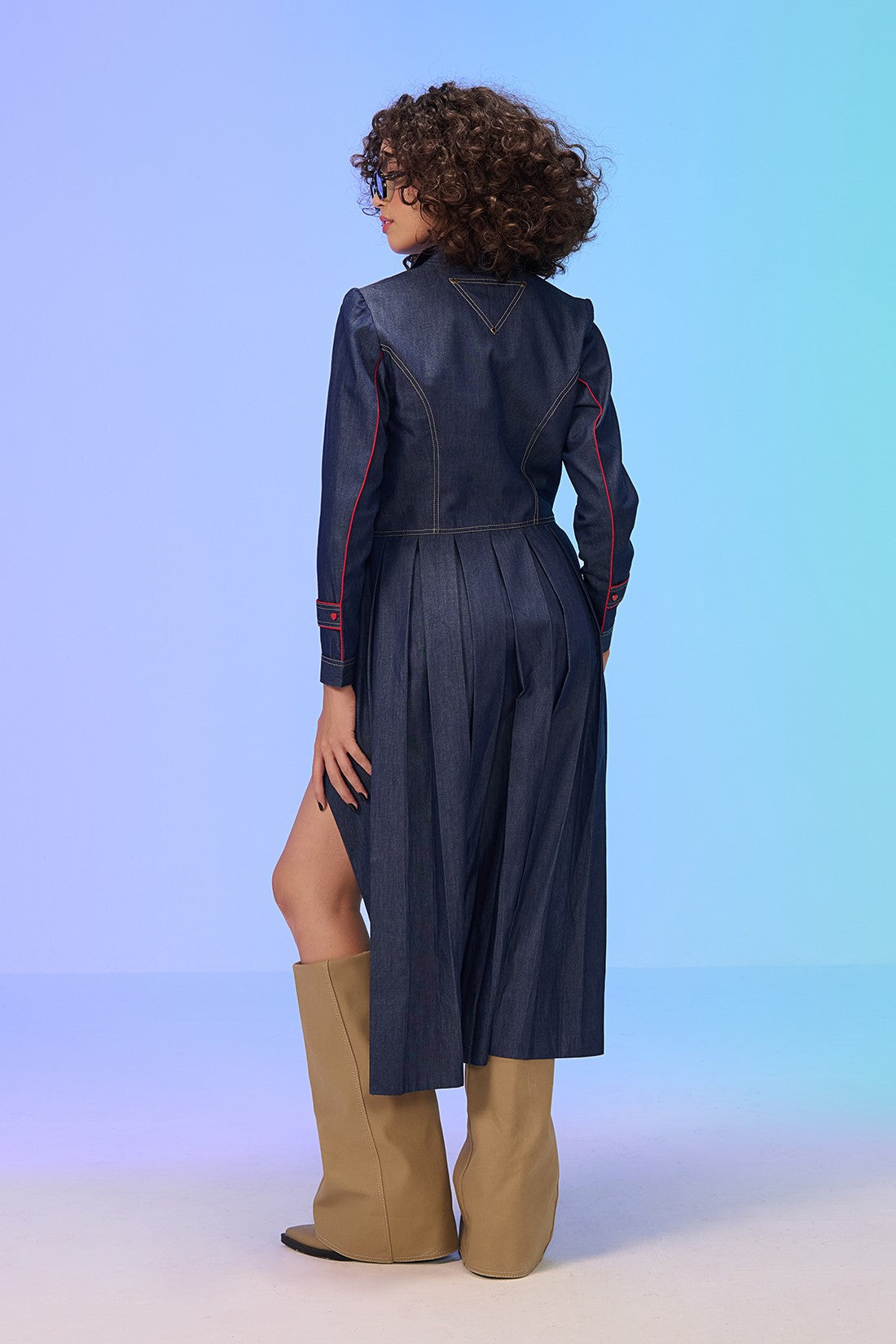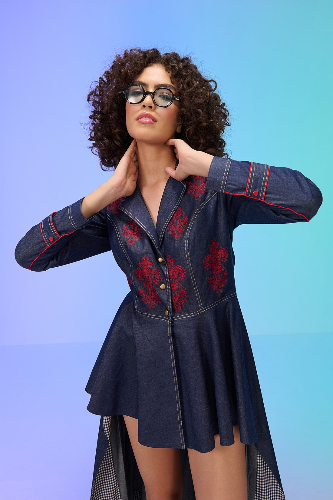 Ultra stylish shirt dress with peplum style front and a cascading pleated back. This dress features unique embroidery with contrasting stitching details on the bodice.