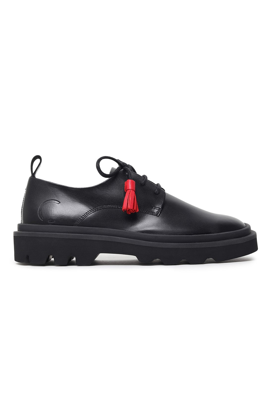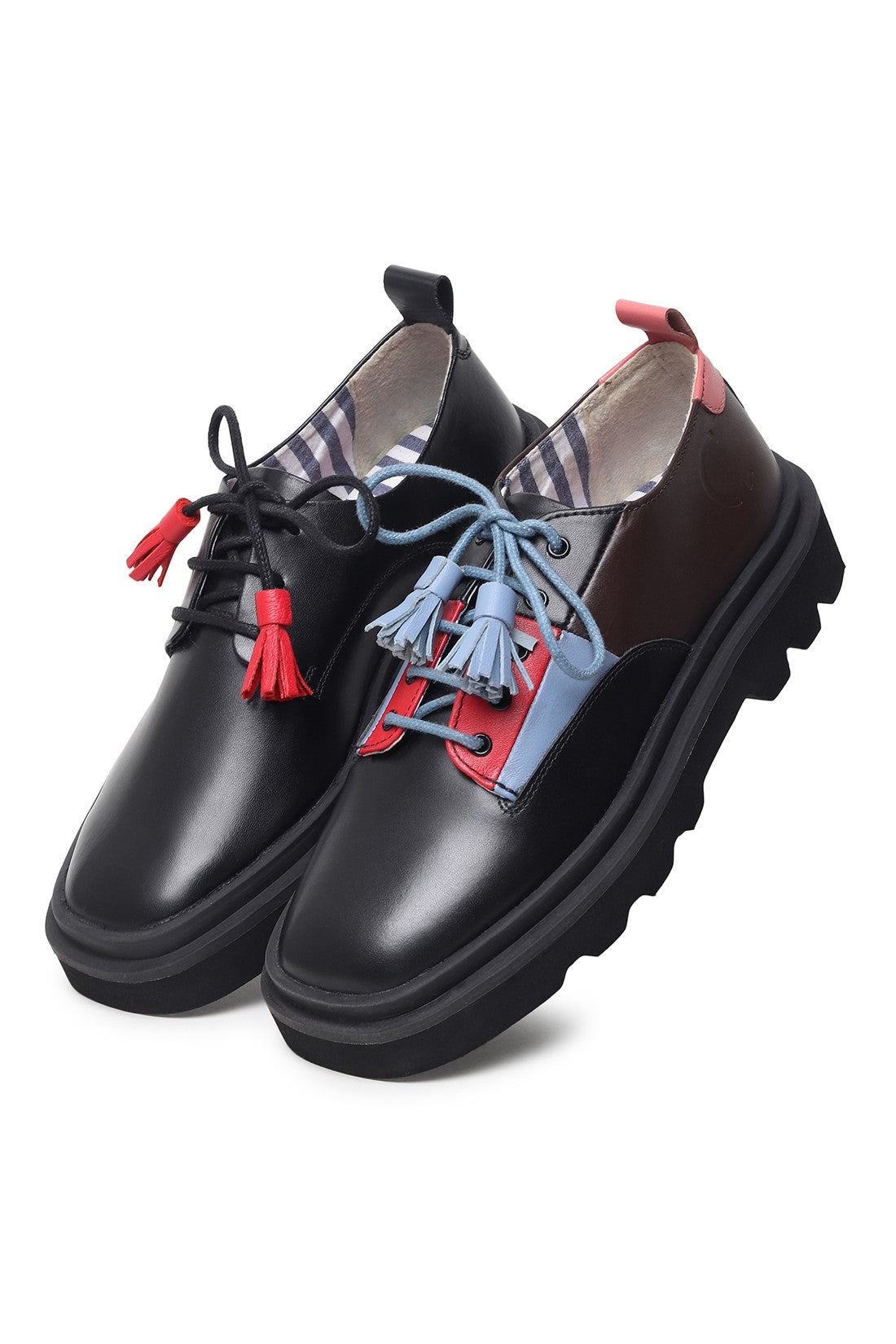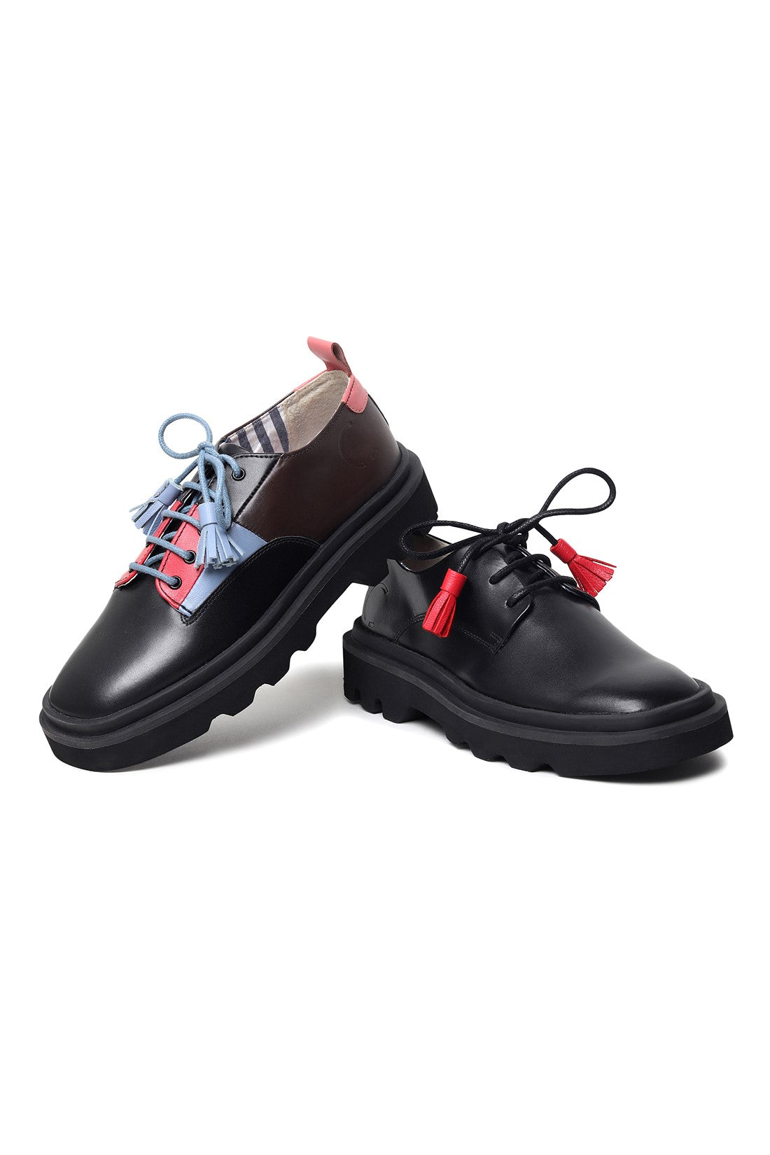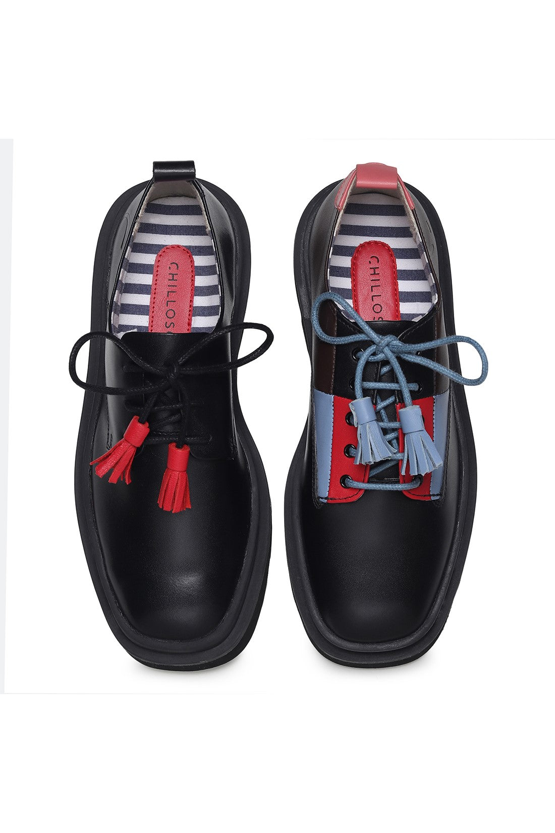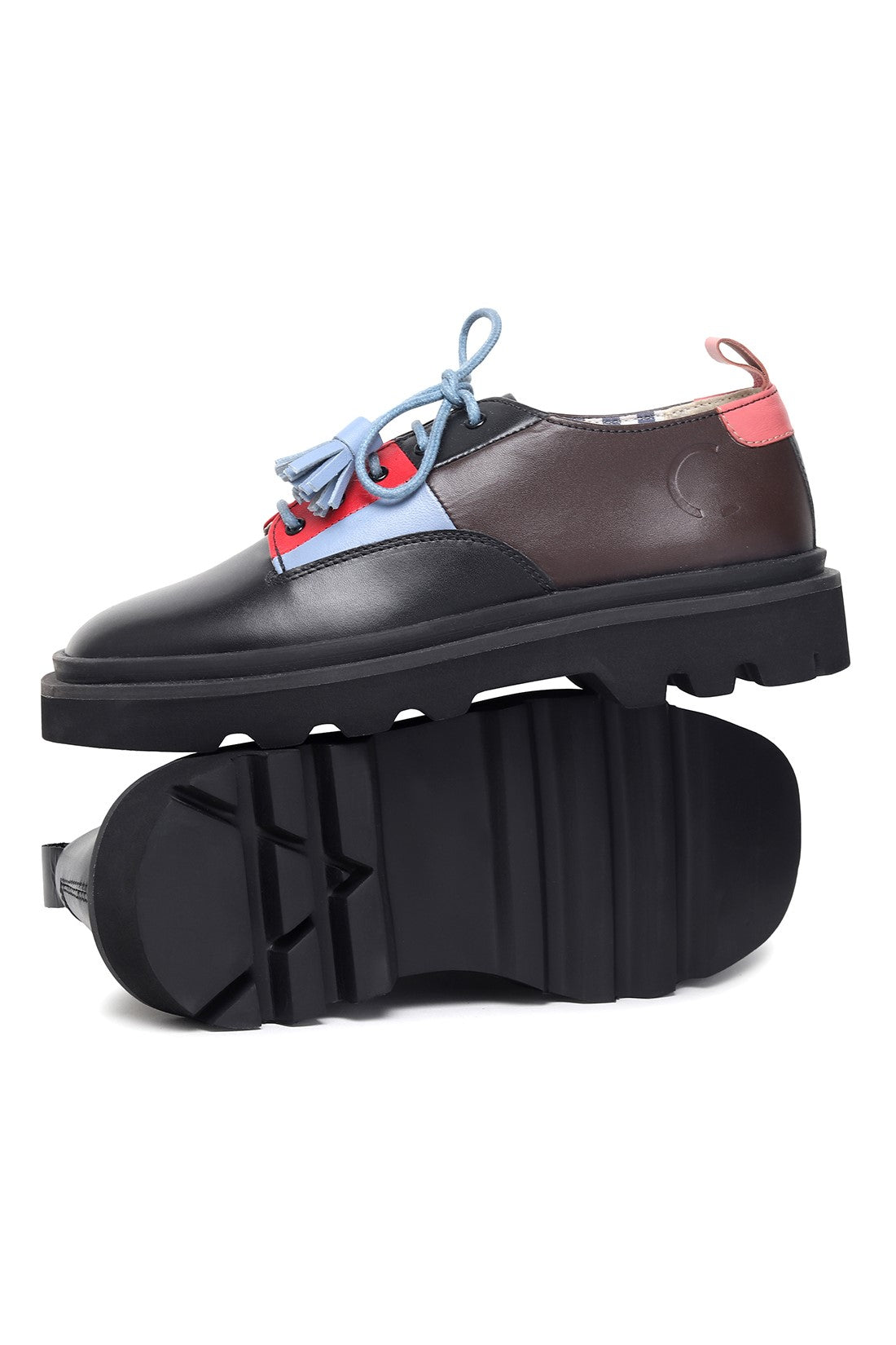 Designed to break symmetry, this intentionally mismatched pair brings bold individuality to classic lace-ups. Featuring contrasting lace colours, tassel details, and asymmetric panel accents, the sleek black silhouette is grounded by a chunky sole for everyday edge and comfort. Unconventional by design, these shoes are made for those who dress with confidence and never match by accident.