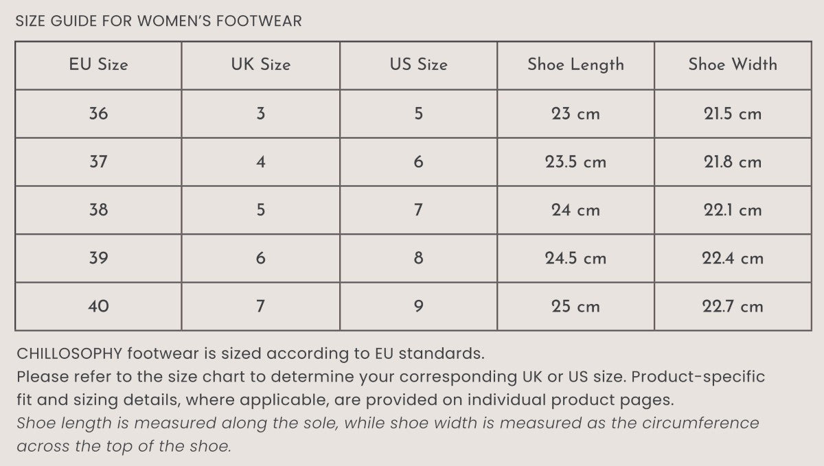 Please refer to the size chart to determine your corresponding UK or US size. Product-specific fit and sizing details, where applicable, are provided on individual product pages.