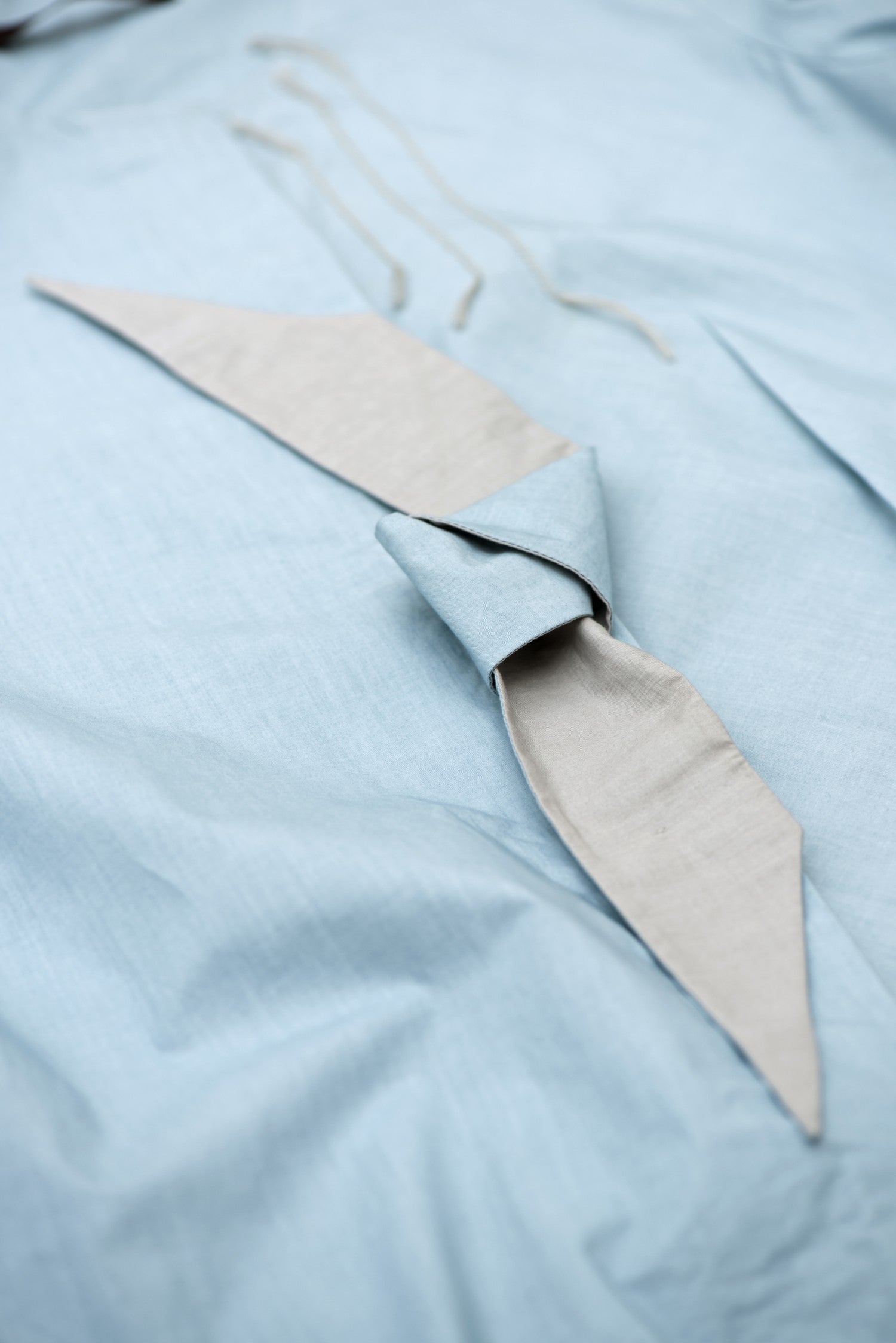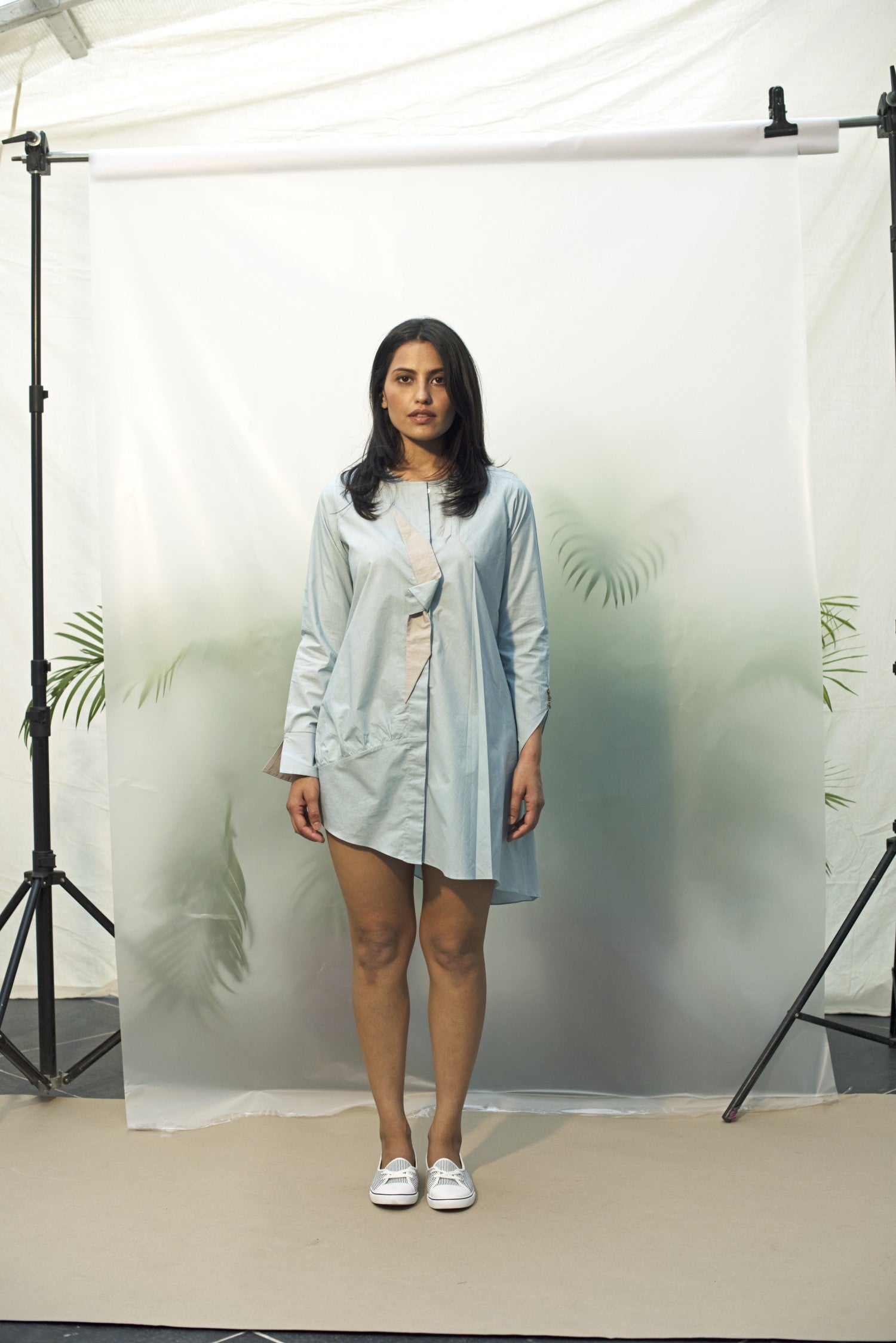 Mid length tunic with asymmetrical cut and front knot details that has different sleeves details