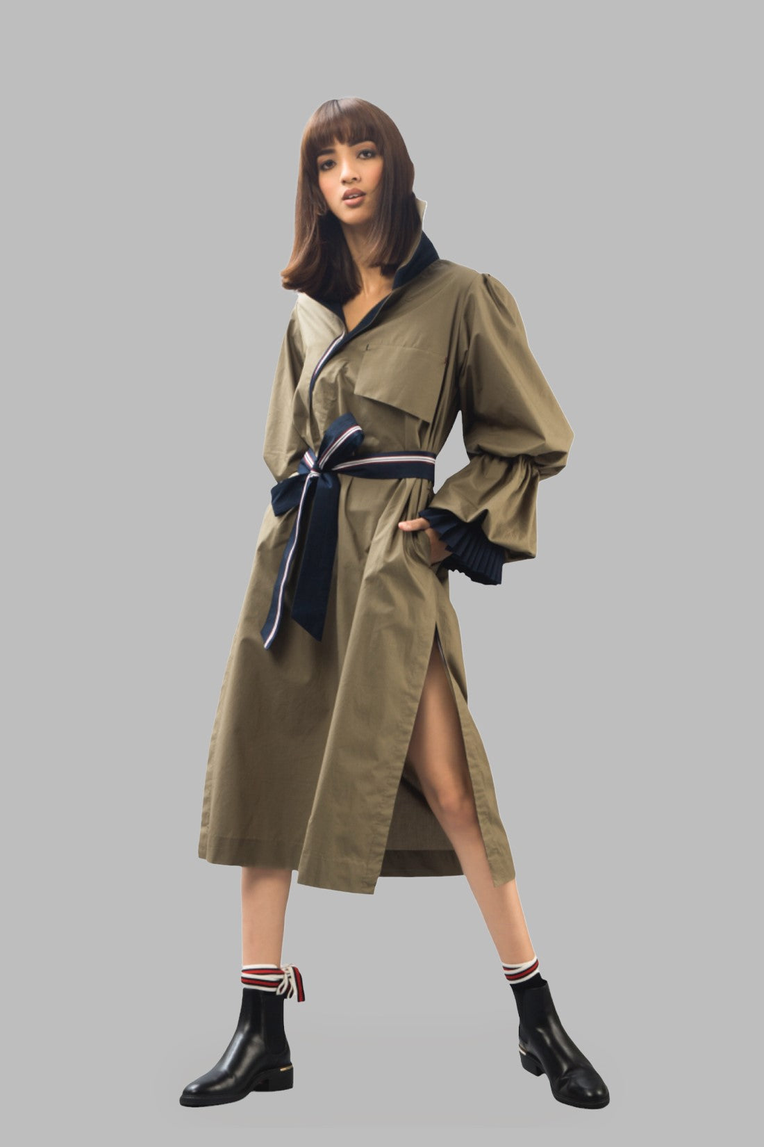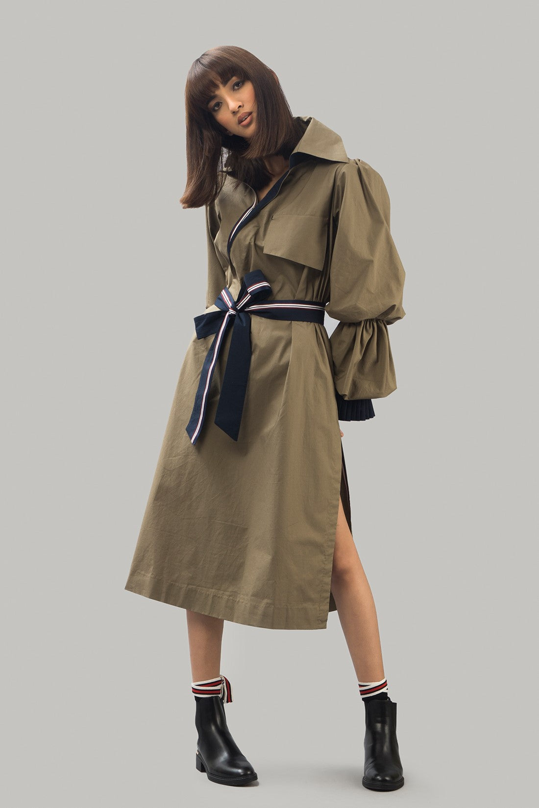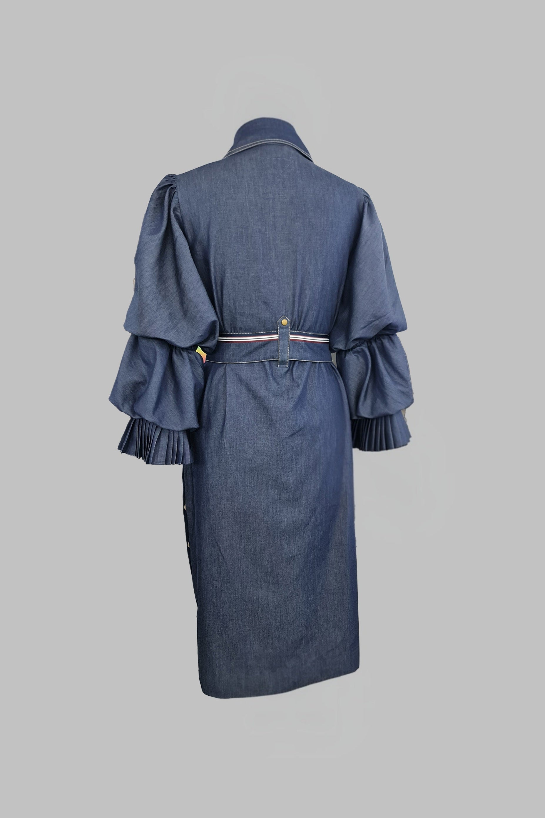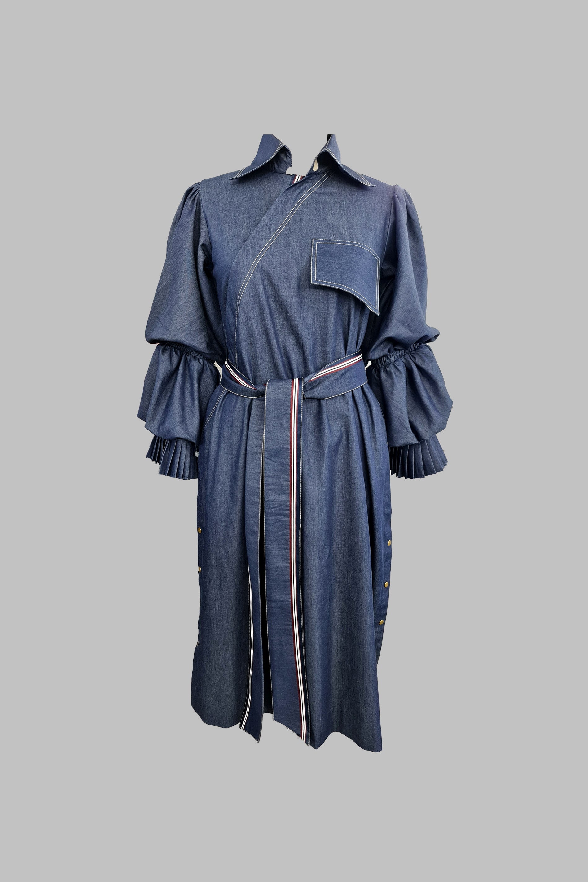 Long trenchdress with statement puffed sleeves with wraparound tie belt and large front pockets
