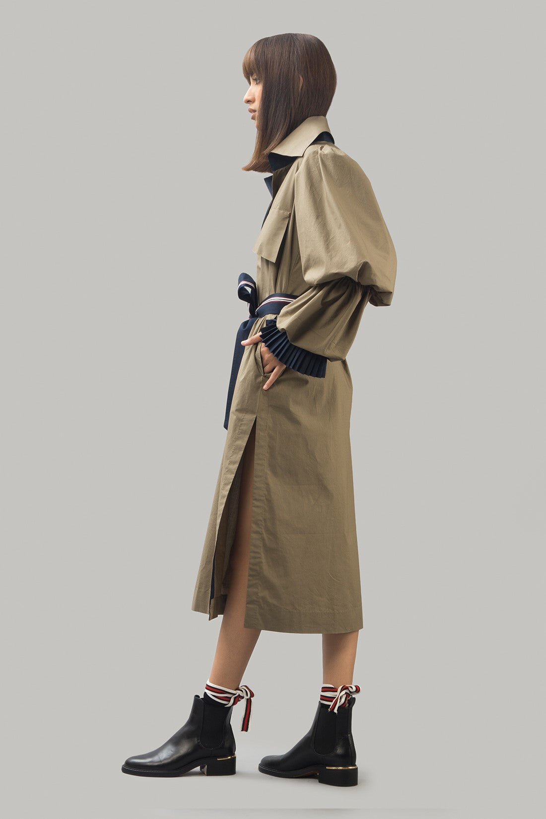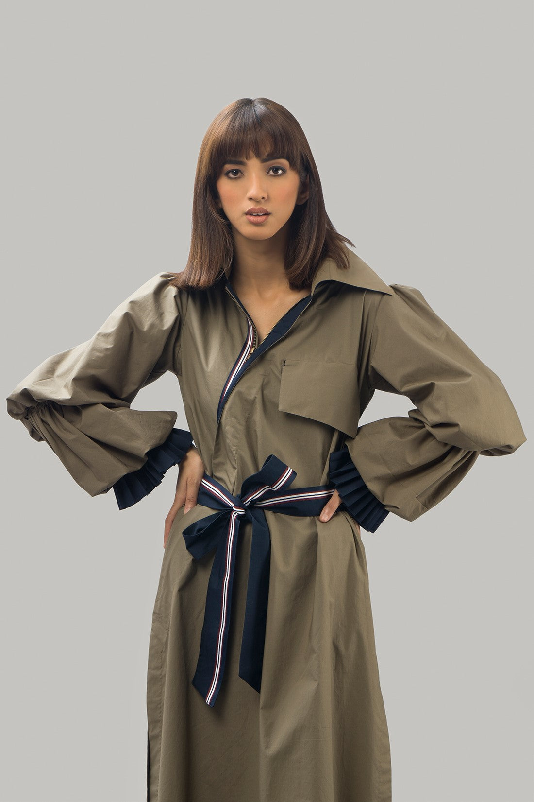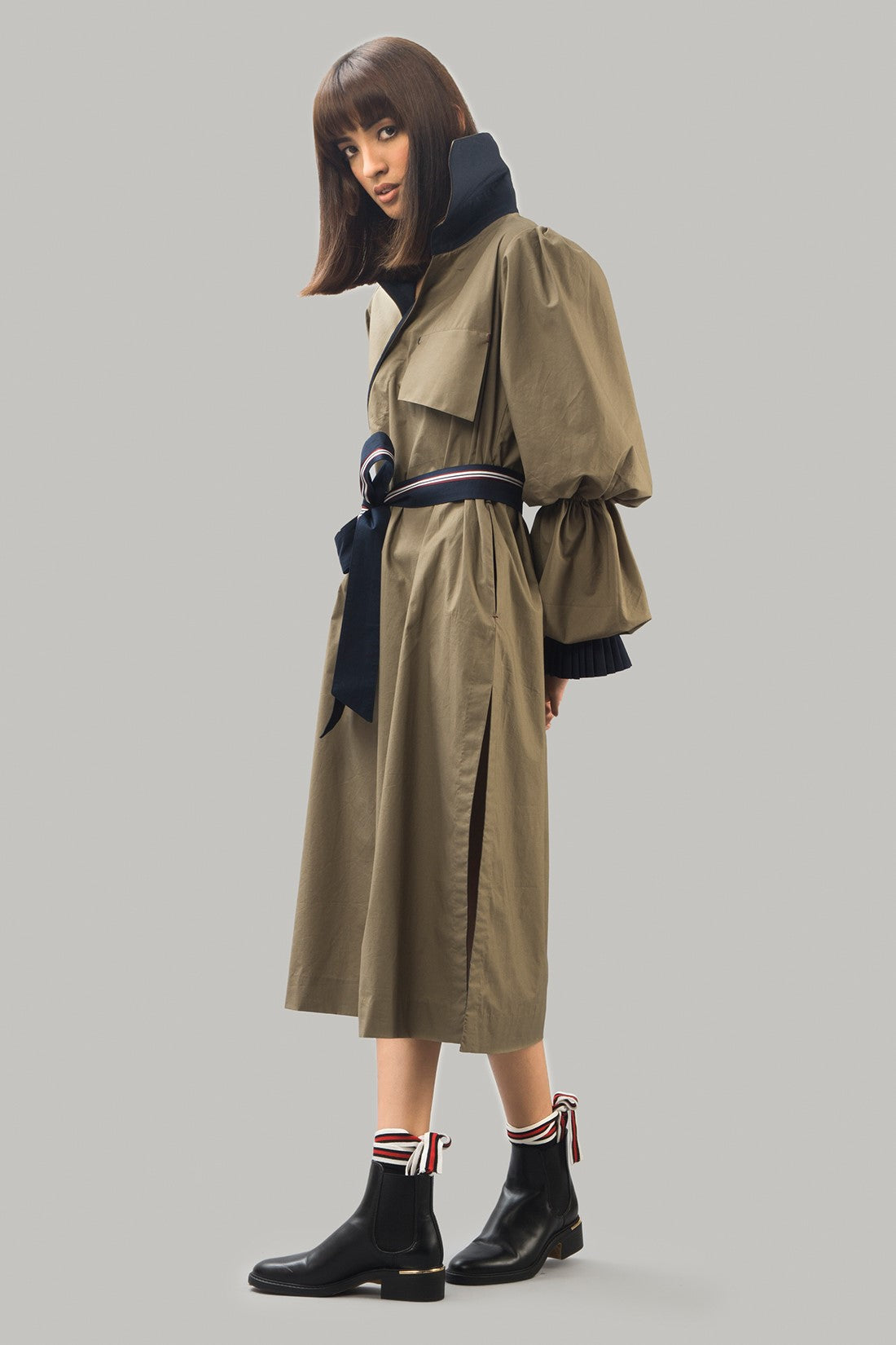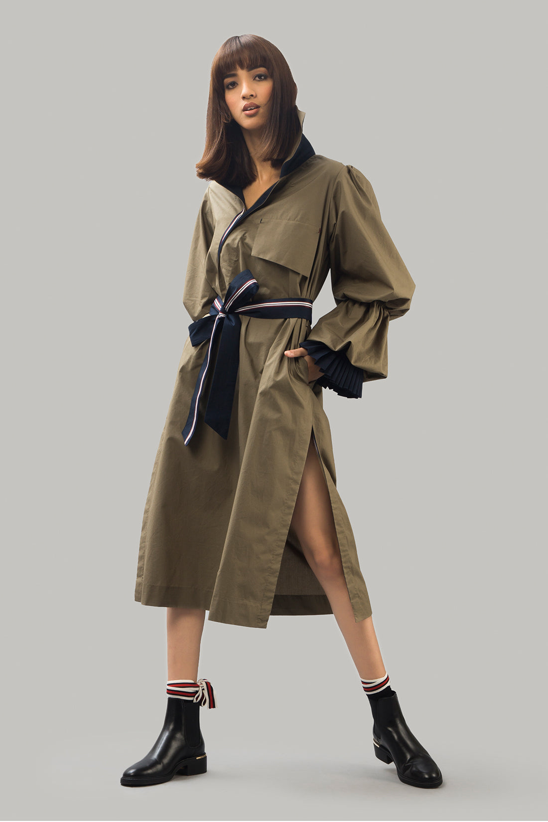 Long trenchdress with statement puffed sleeves with wraparound tie belt and large front pockets
