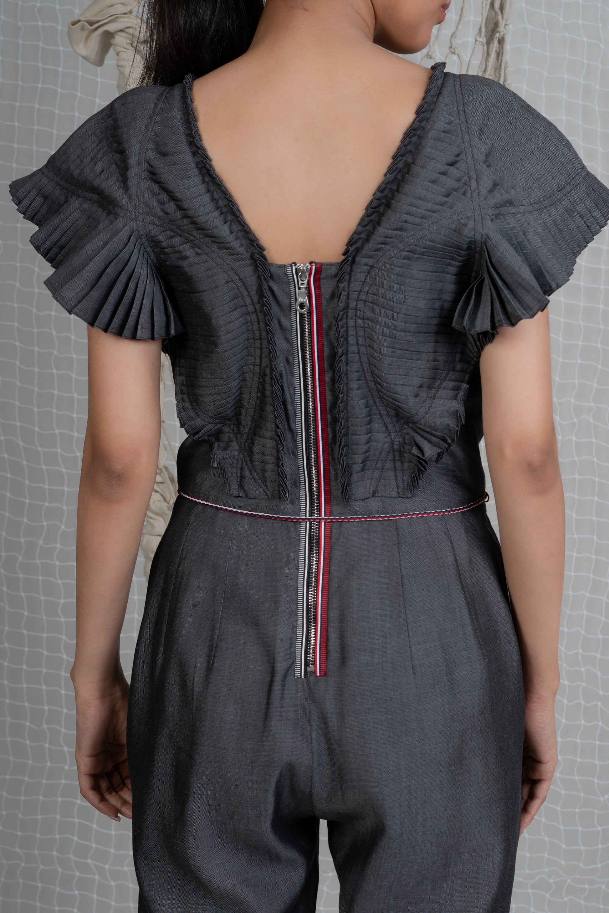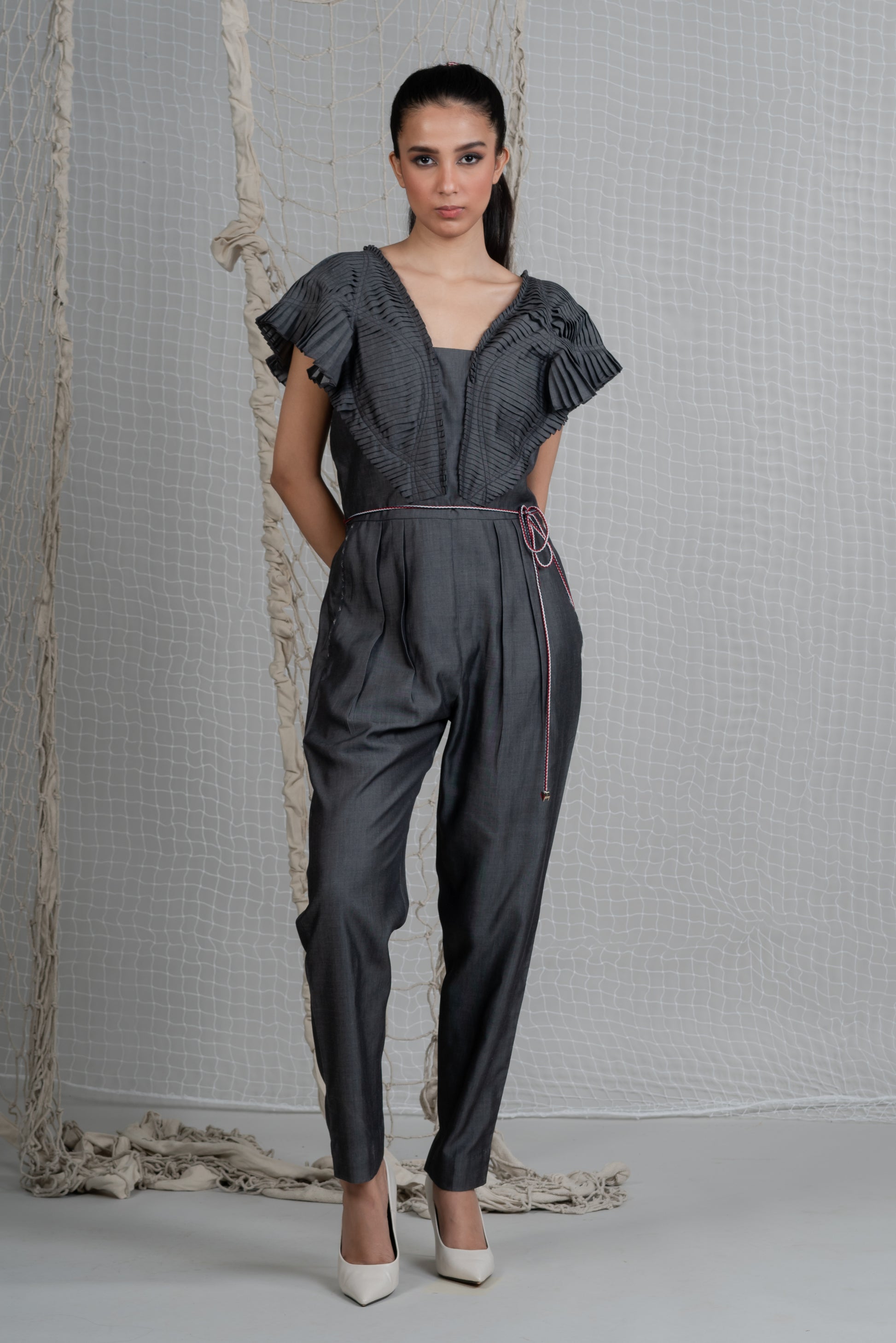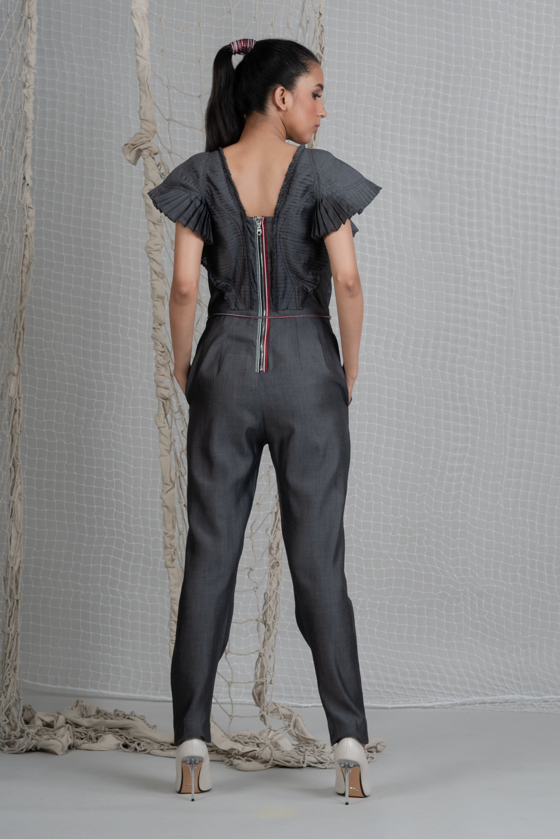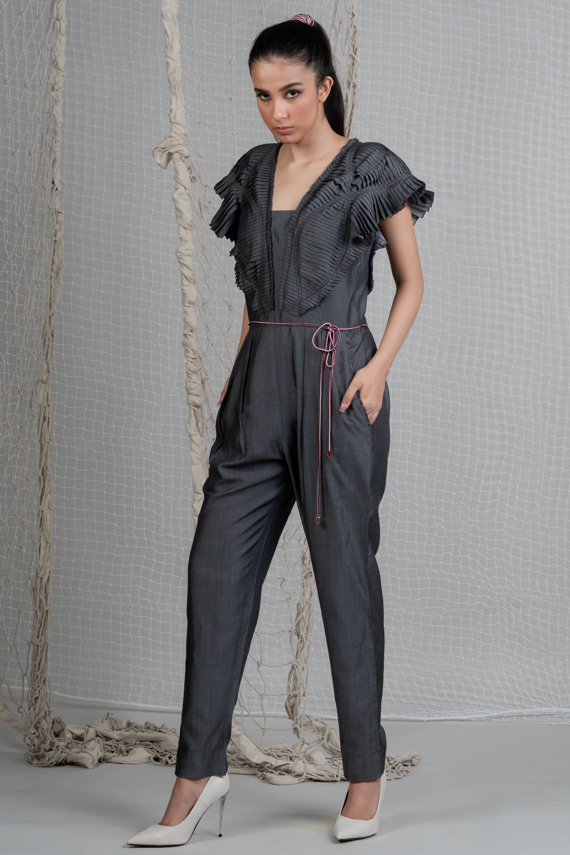 A statement jumpsuit crafted in chambray voile featuring fabric manipulation detail from sleeves to neckline. Designed with a contrast red back zip, red-and-white cord tie at the waist, side pockets, and a tapered ankle fit.