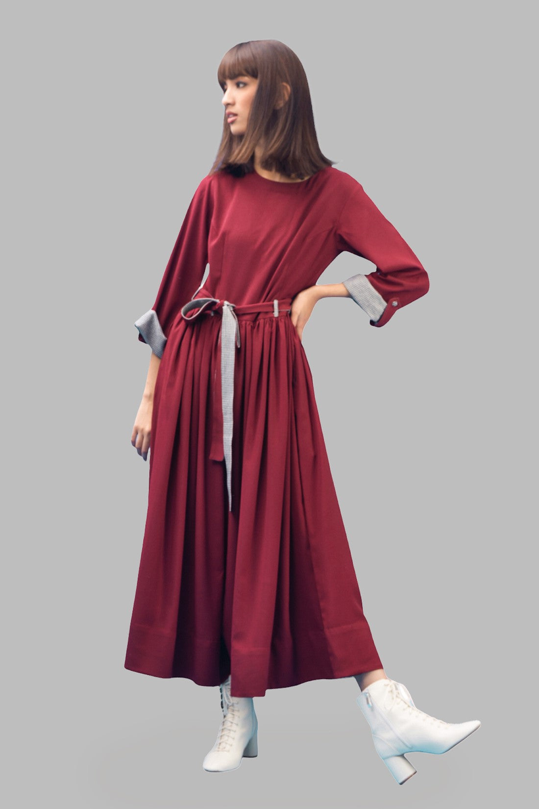 A long relaxed fit dress with folded check facing sleeves and tie front belt