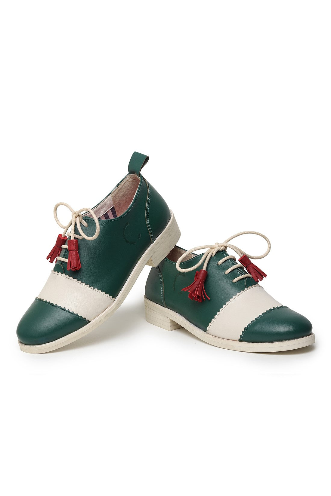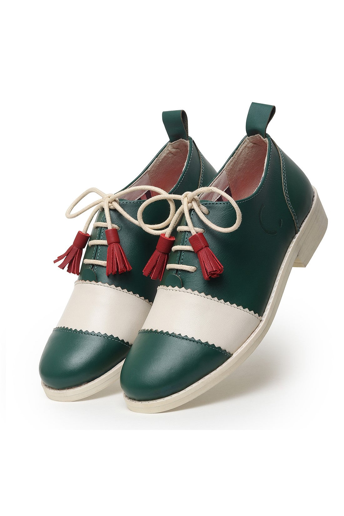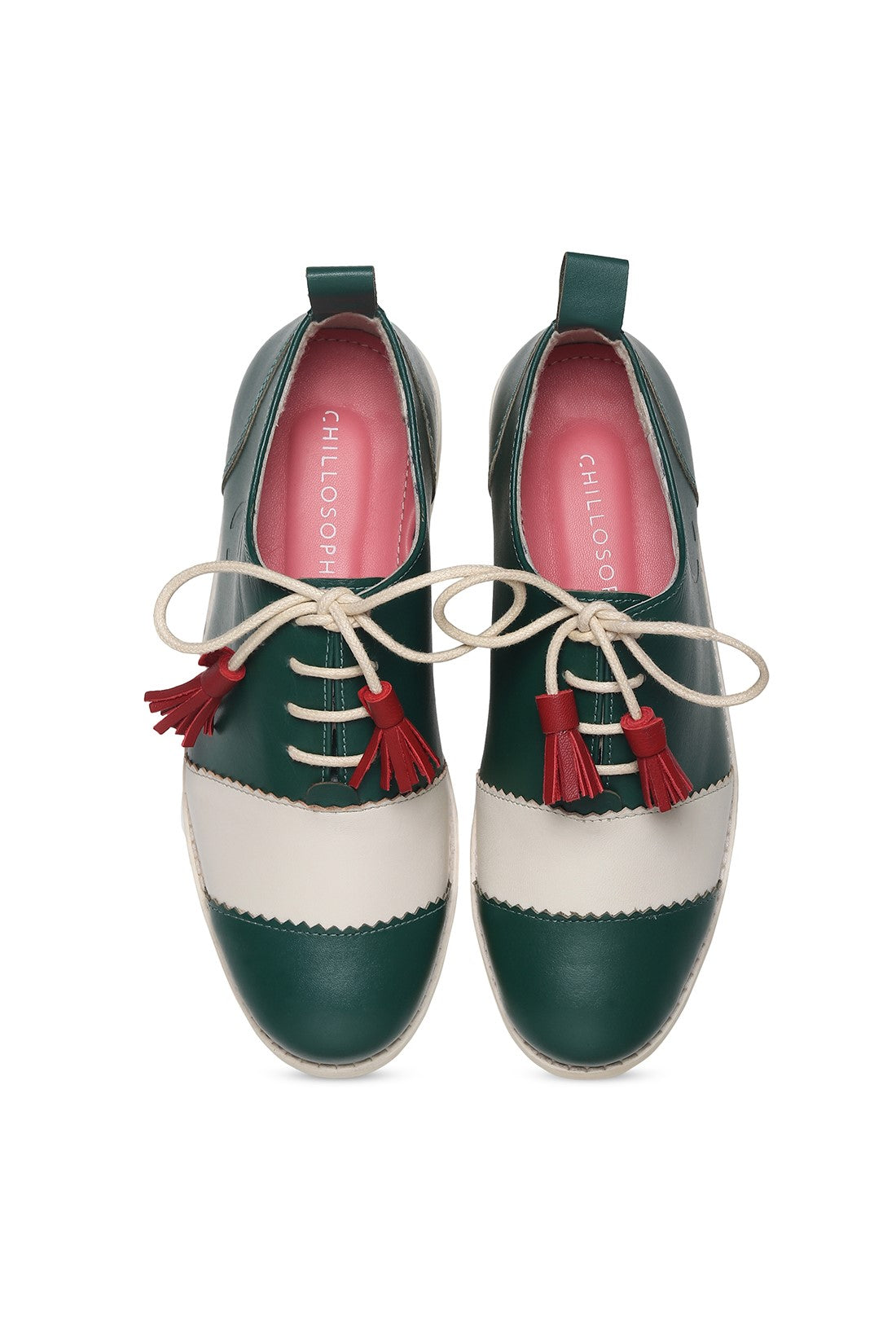 A fresh take on everyday lace-ups, these shoes feature a rich green upper contrasted with a cream panel and playful red tassel details. Designed with a comfortable low heel and clean silhouette, they strike the perfect balance between classic structure and Chillosophy’s signature quirk—ideal for effortless, all-day wear with personality.