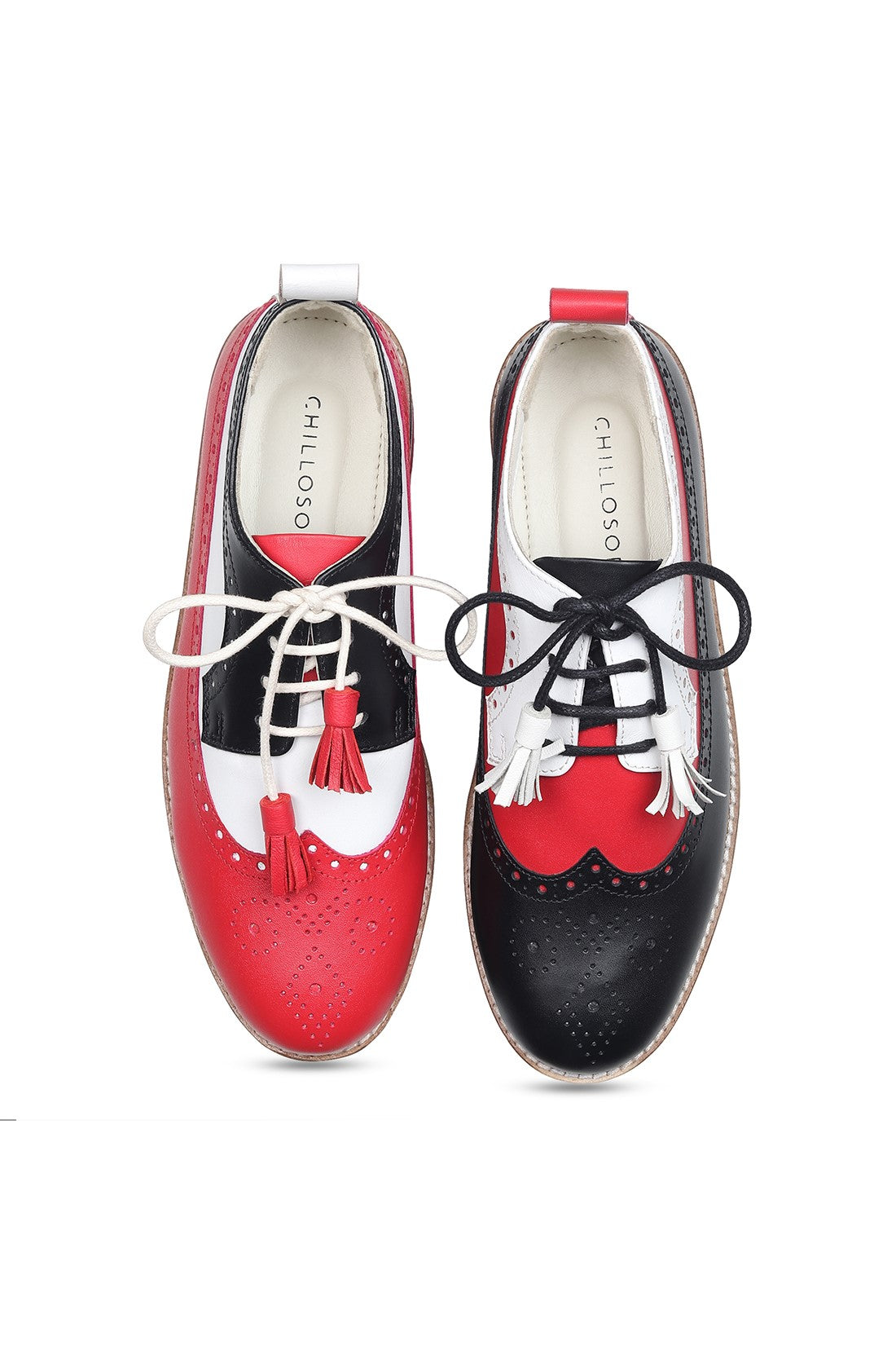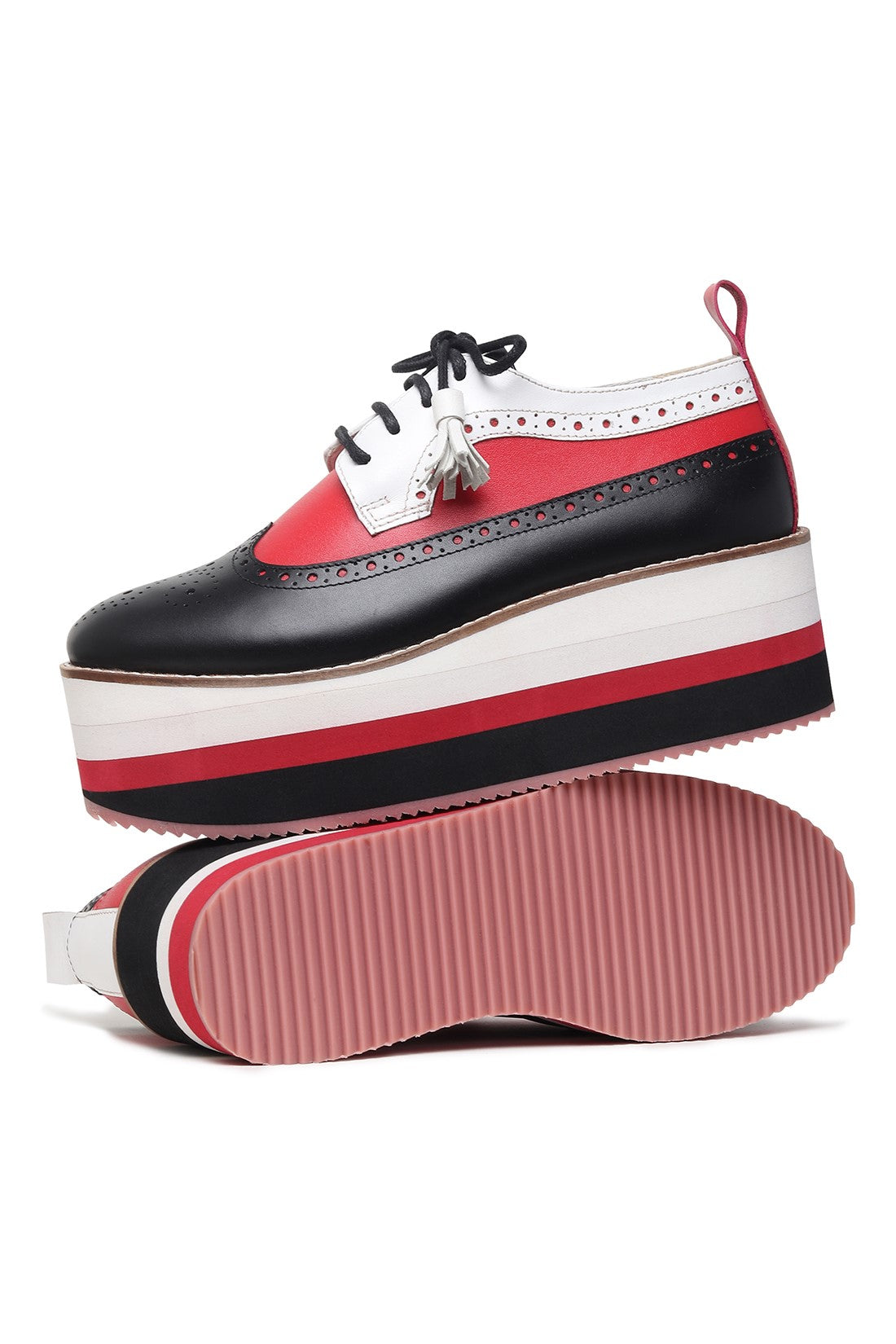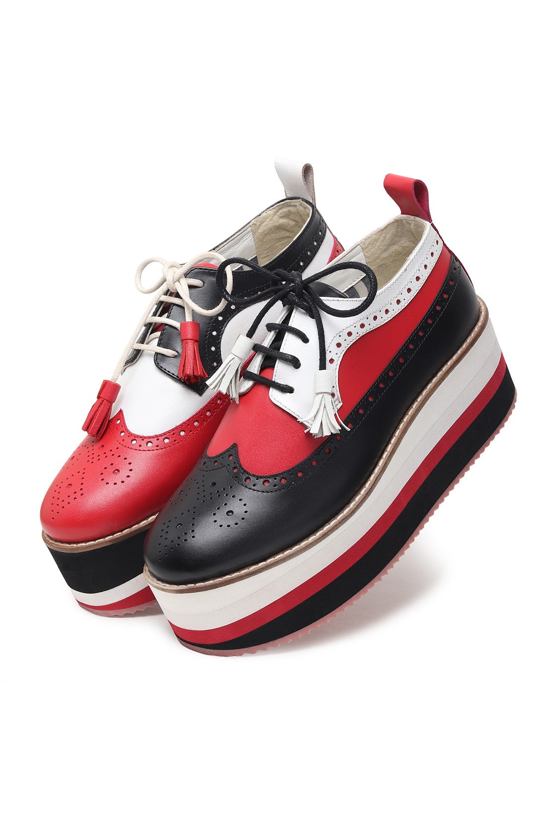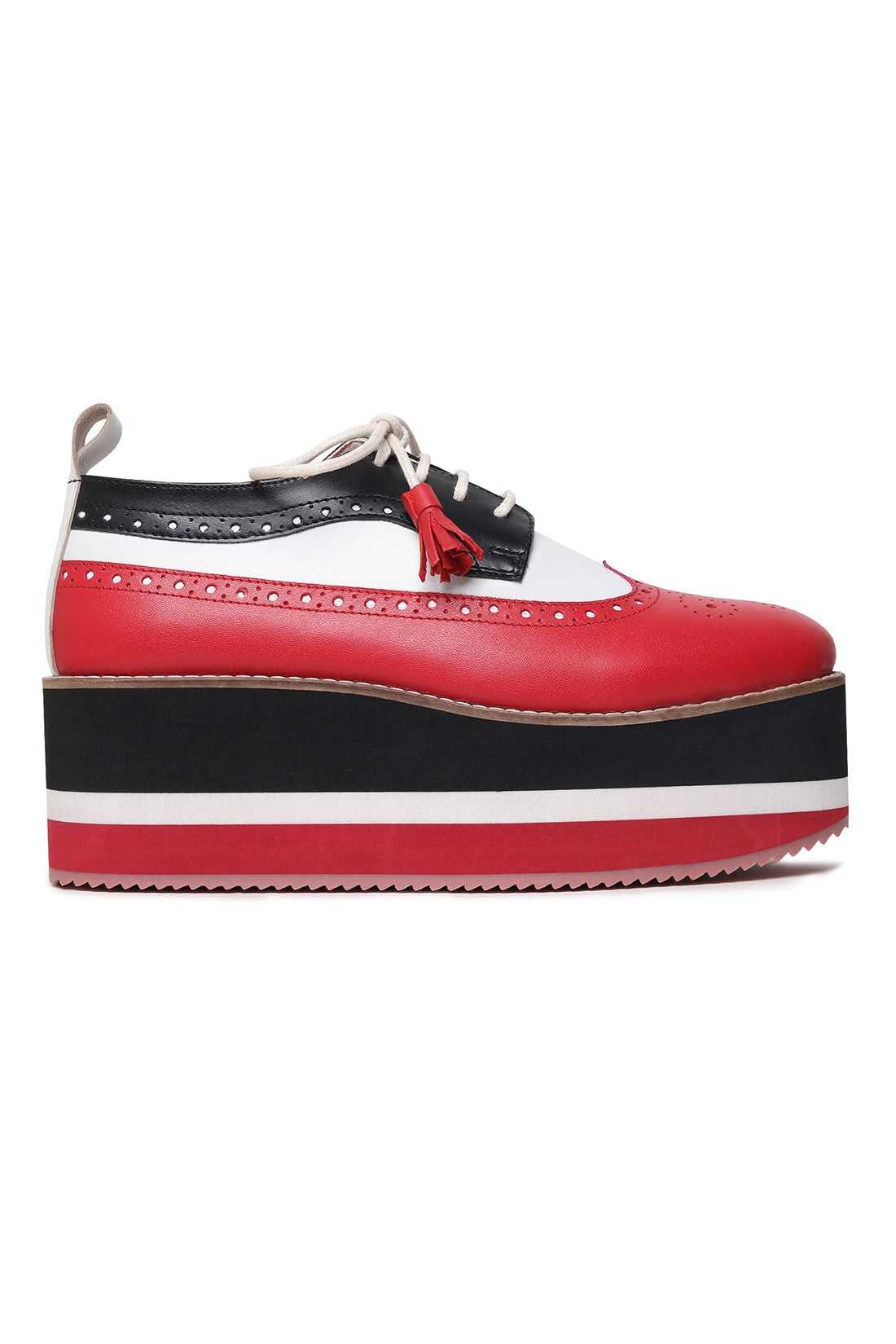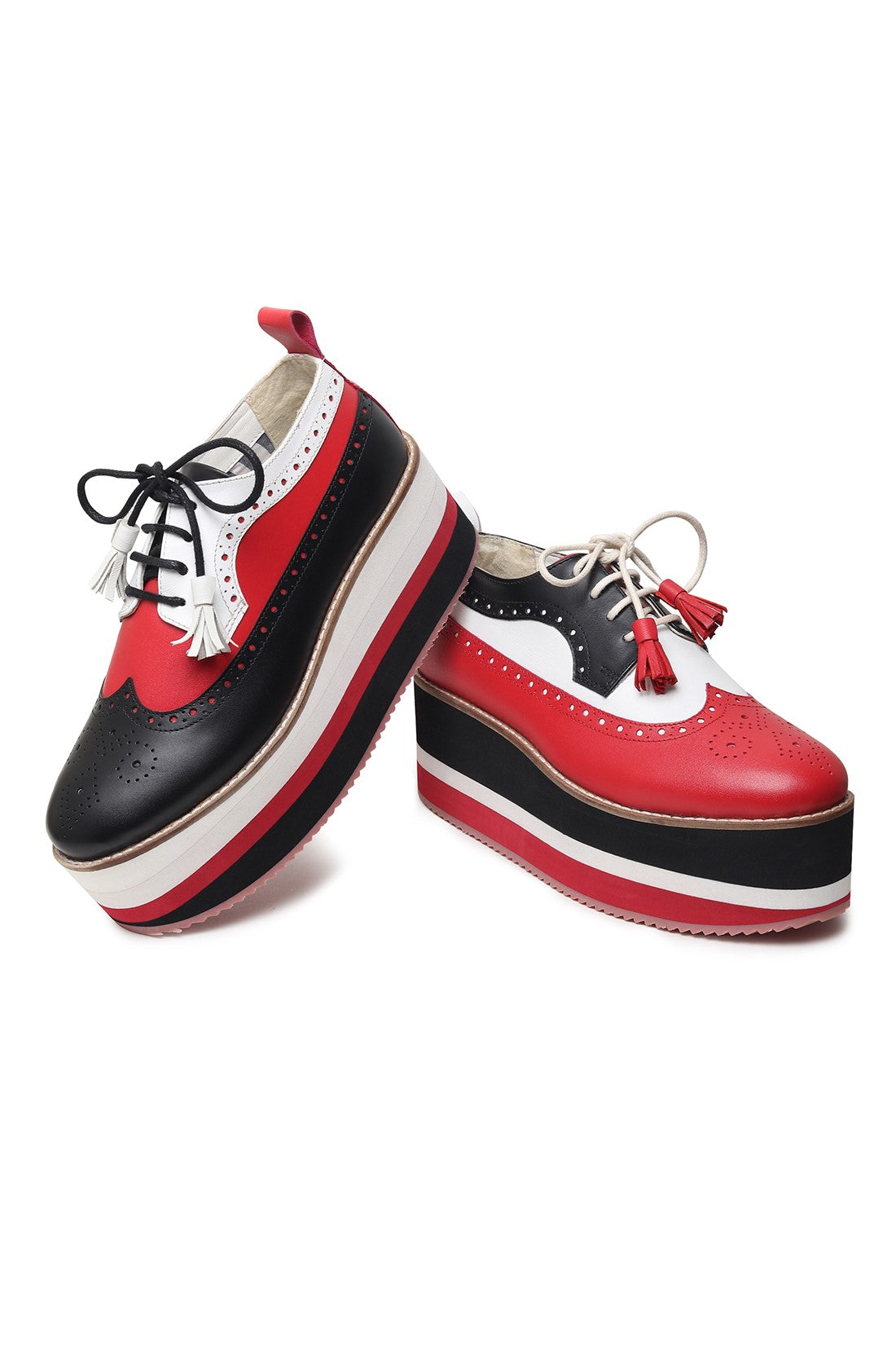 Bold, rebellious, and impossible to ignore. This mismatched pair features asymmetric detailing across each shoe, combining high-contrast red, black, and white panels for an intentionally offbeat look. Finished with classic brogue perforations, tassel laces, and a chunky striped platform sole, they’re designed for unapologetic dressing, made to stand out, not blend in.