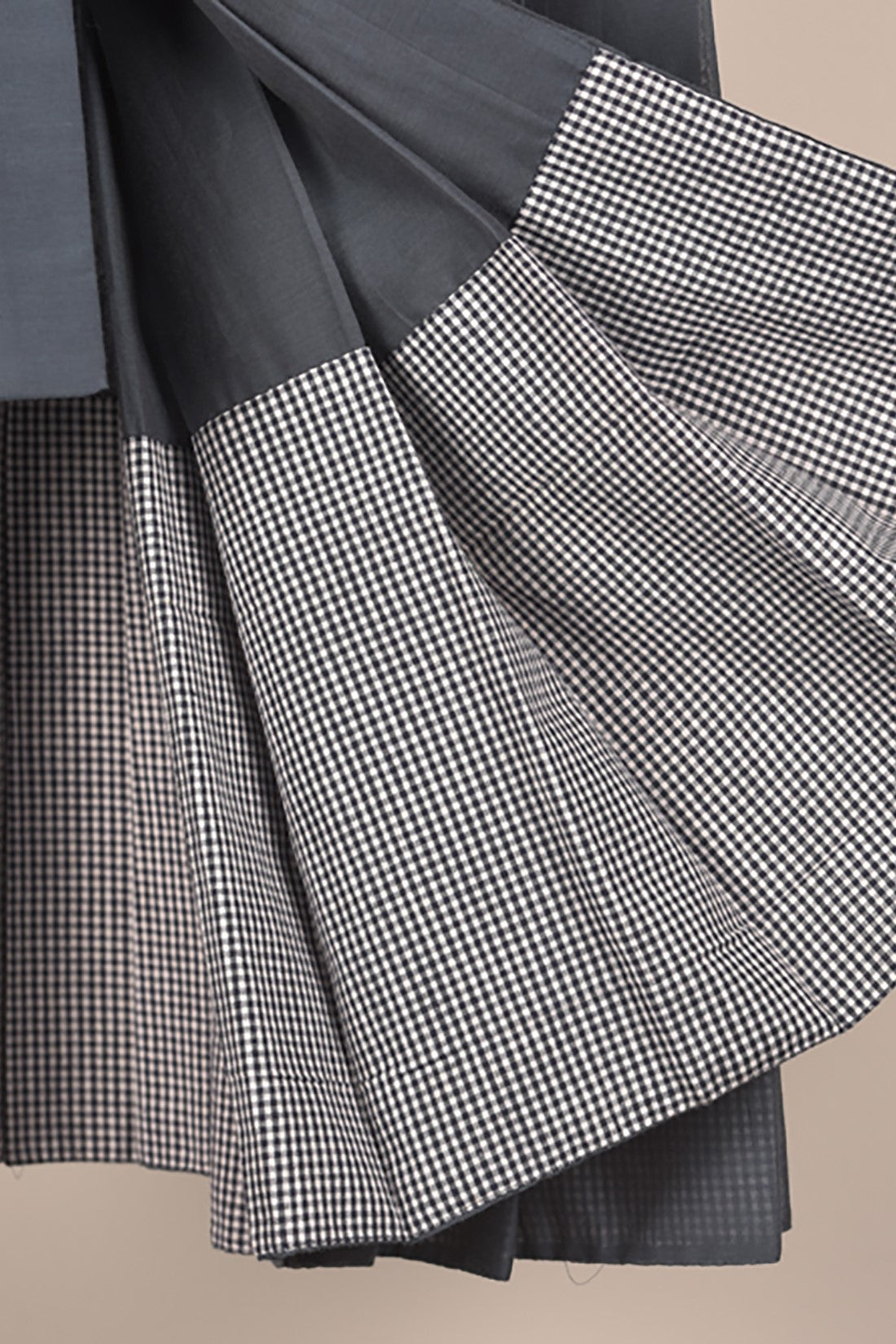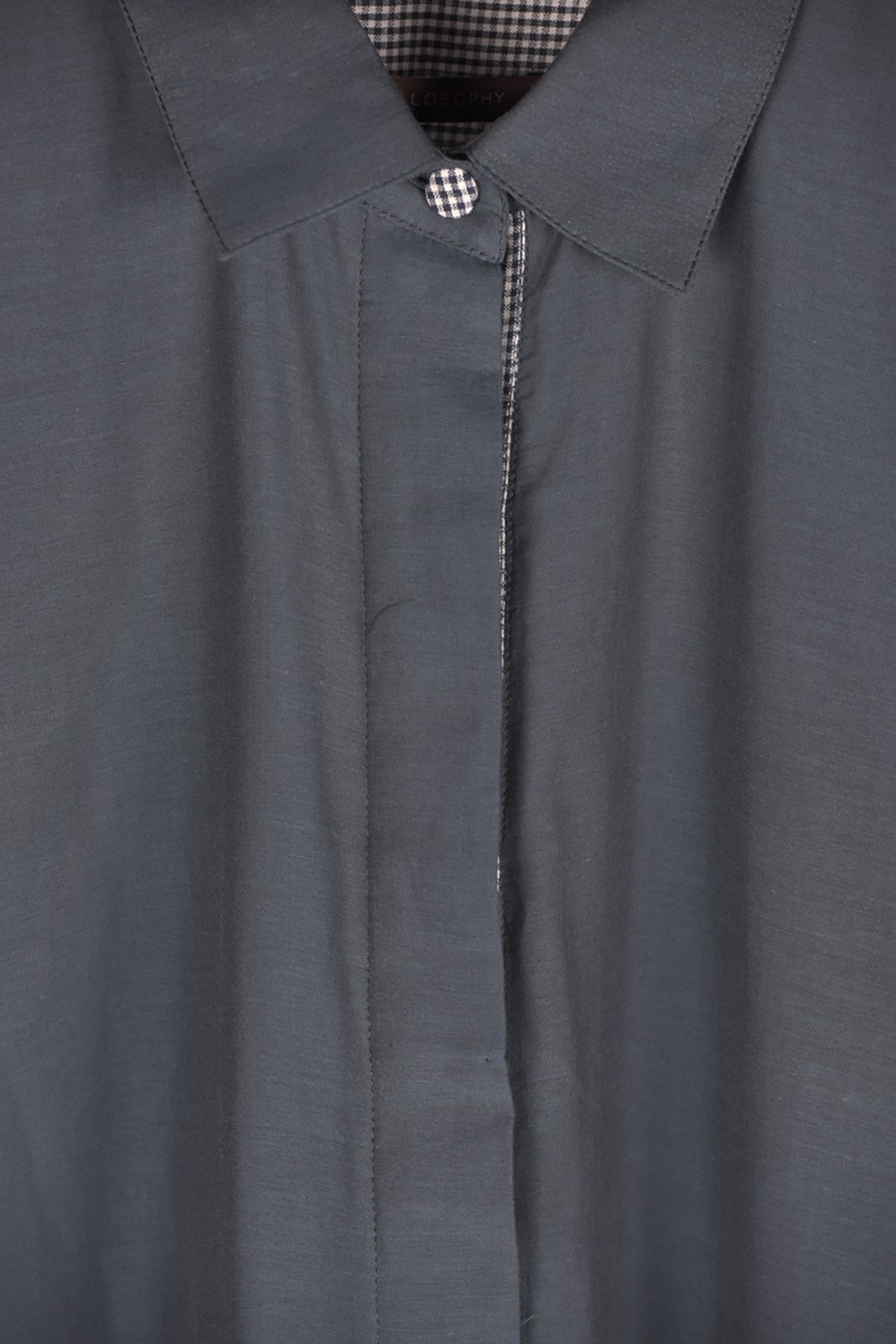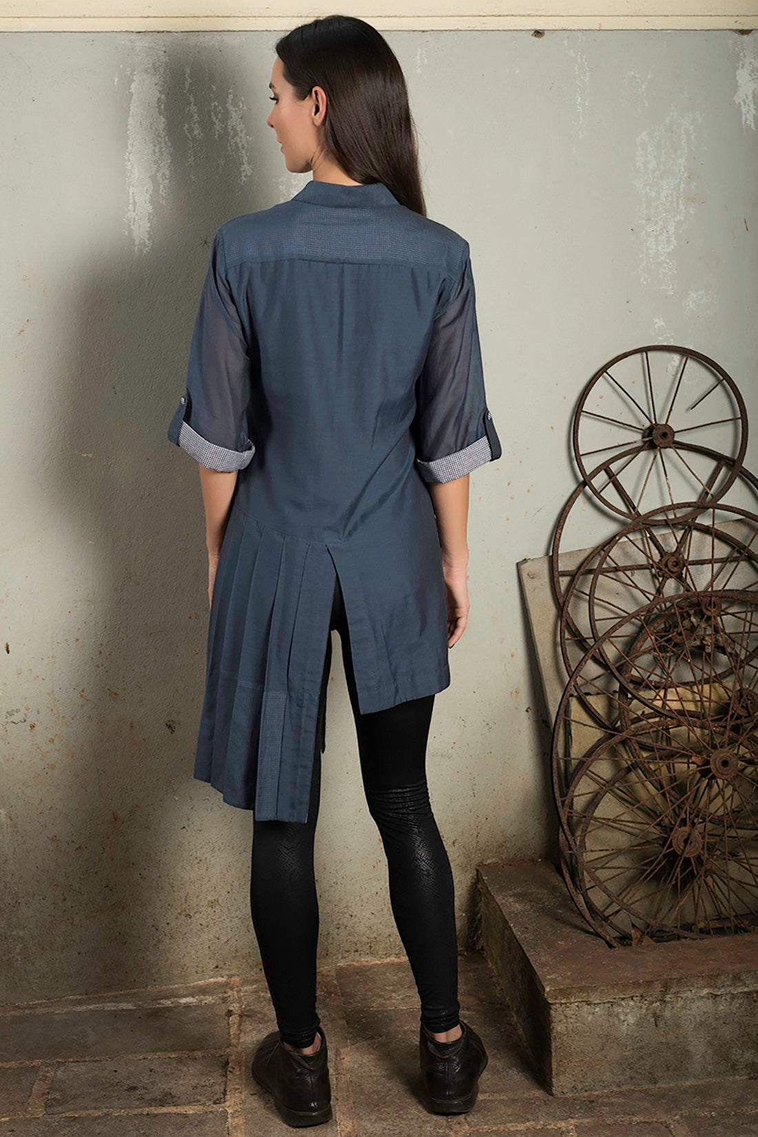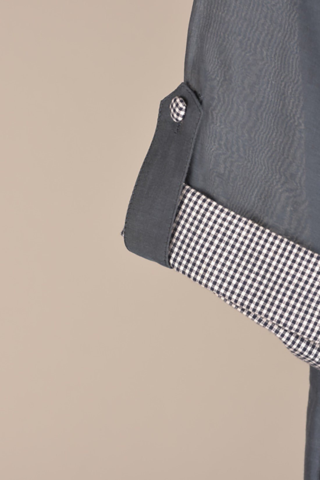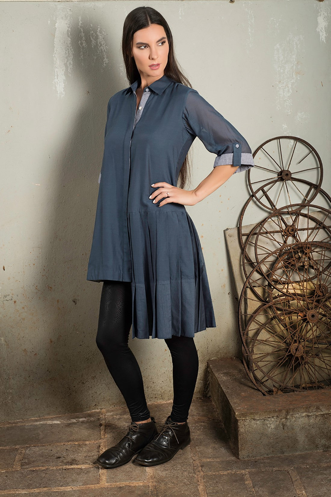 Asymmetrical shirt dress with pleats and blue micro checks, 3/4 sleeves with folding sleeves detail and blue micro checks