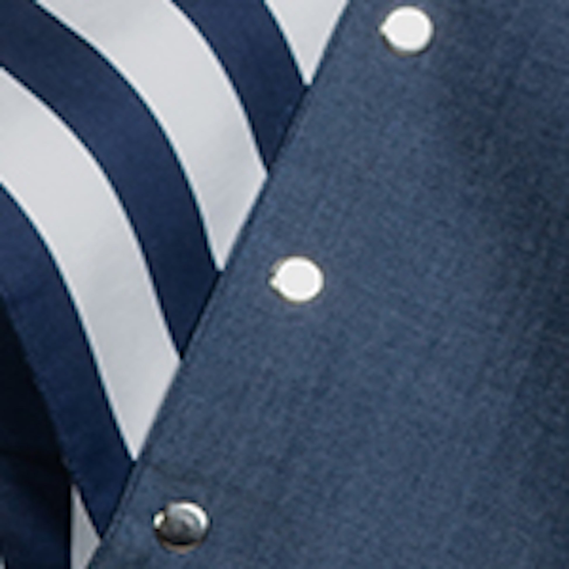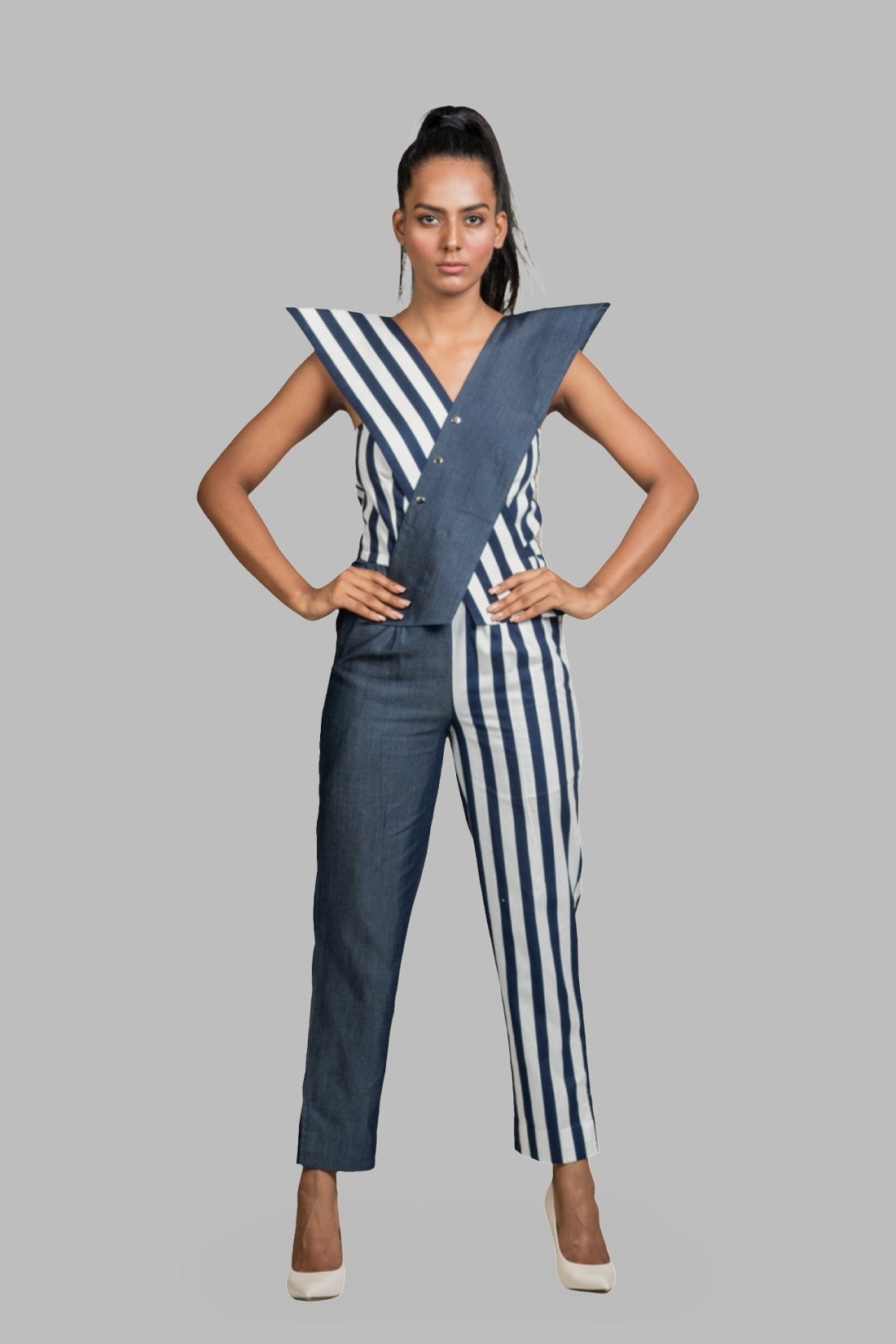 Statement jumpsuit in Denim and Navy white stripes, corset body fit with crossbody shoulder lapels, metal zip on the sides and front snap buttons for ease of fit