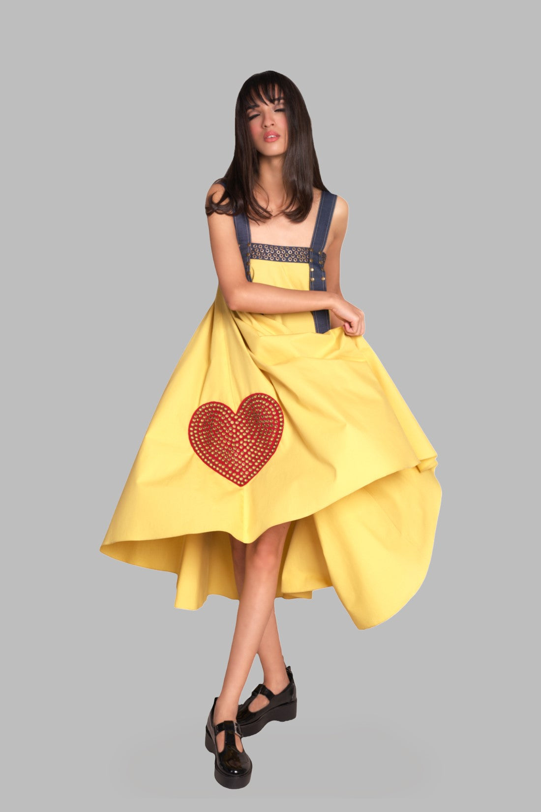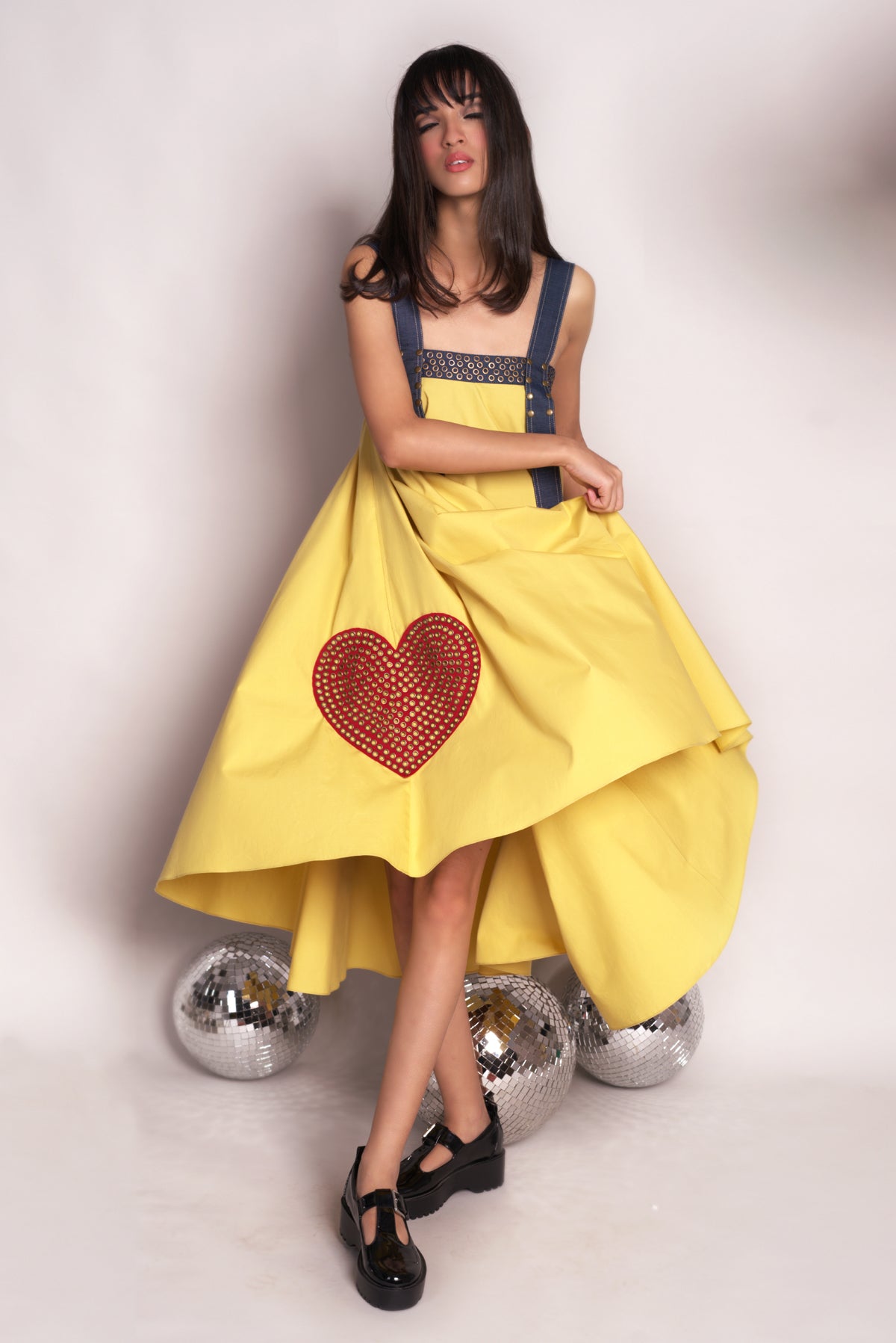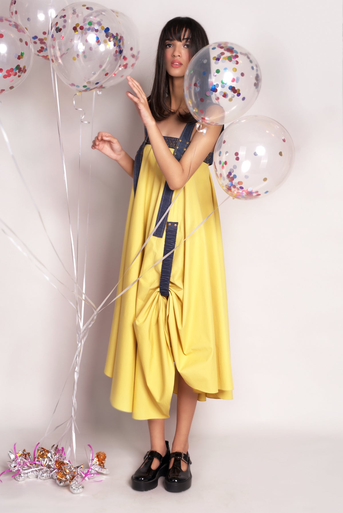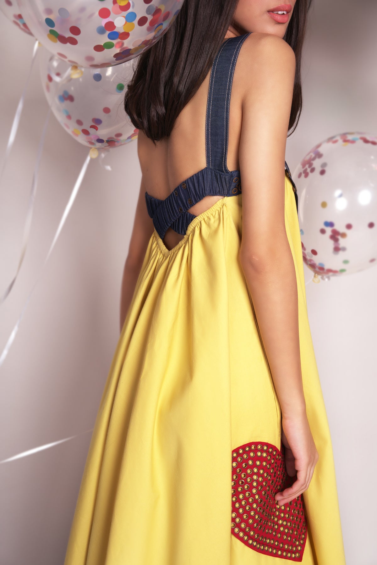 • Maxi parachute dress with denim studded straps and crossback ruched details