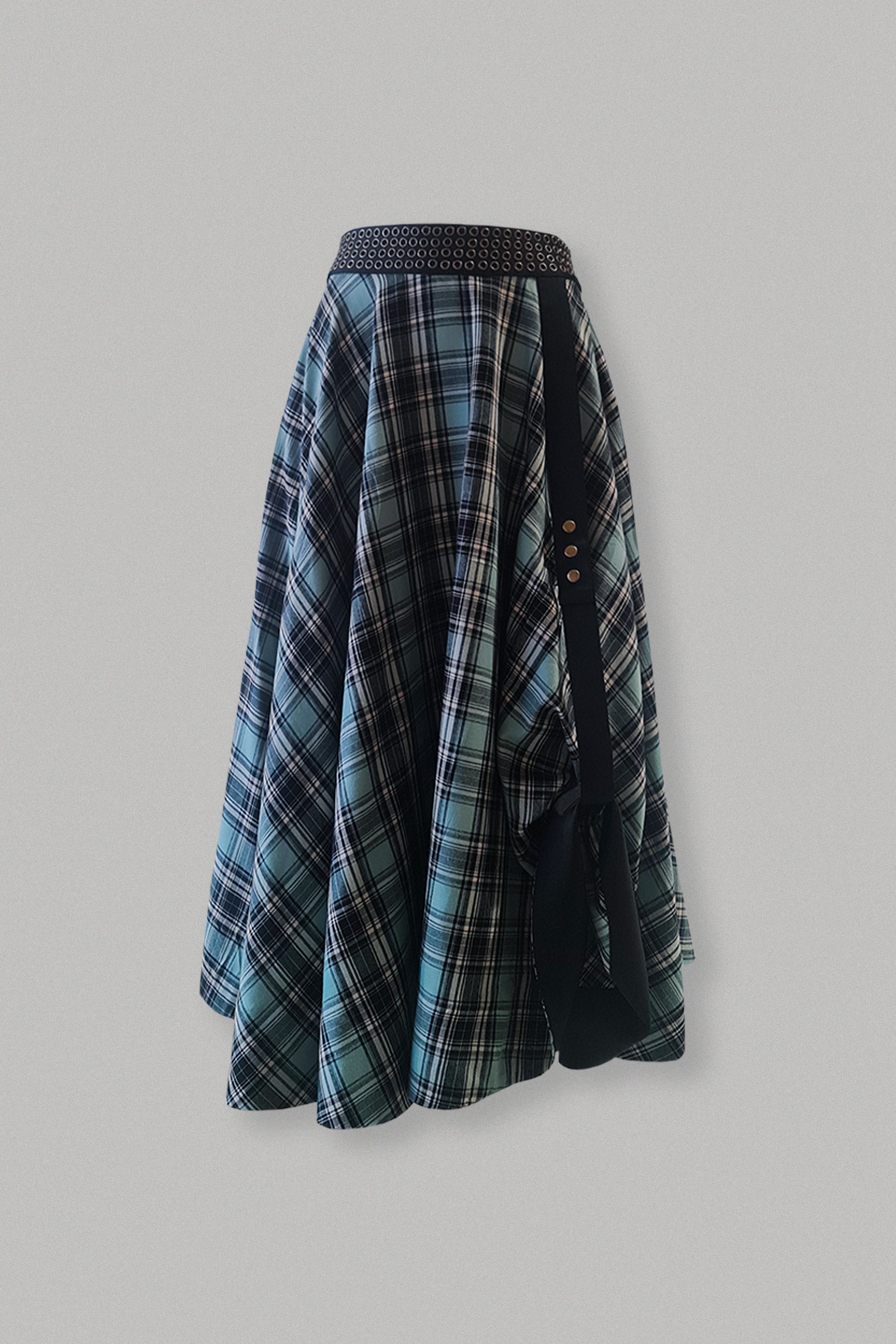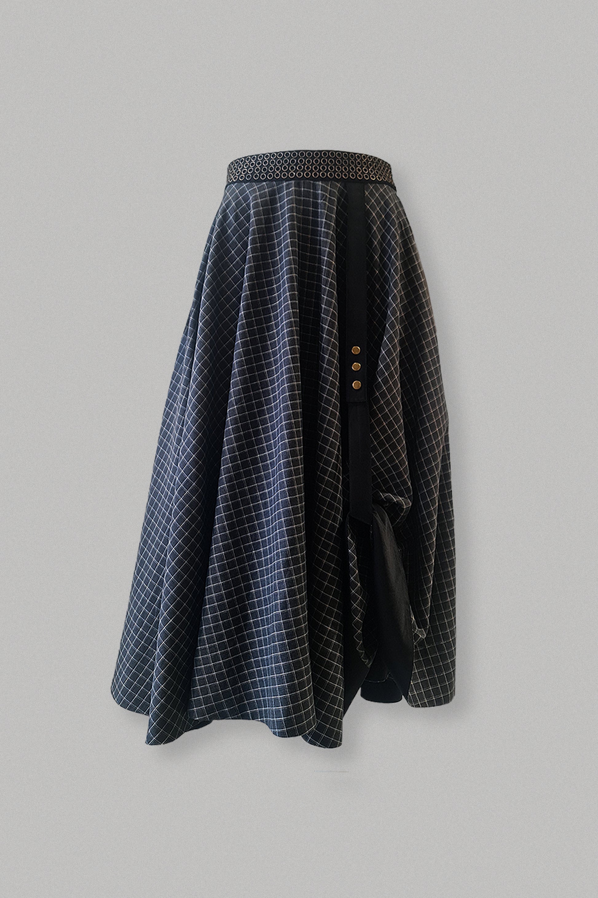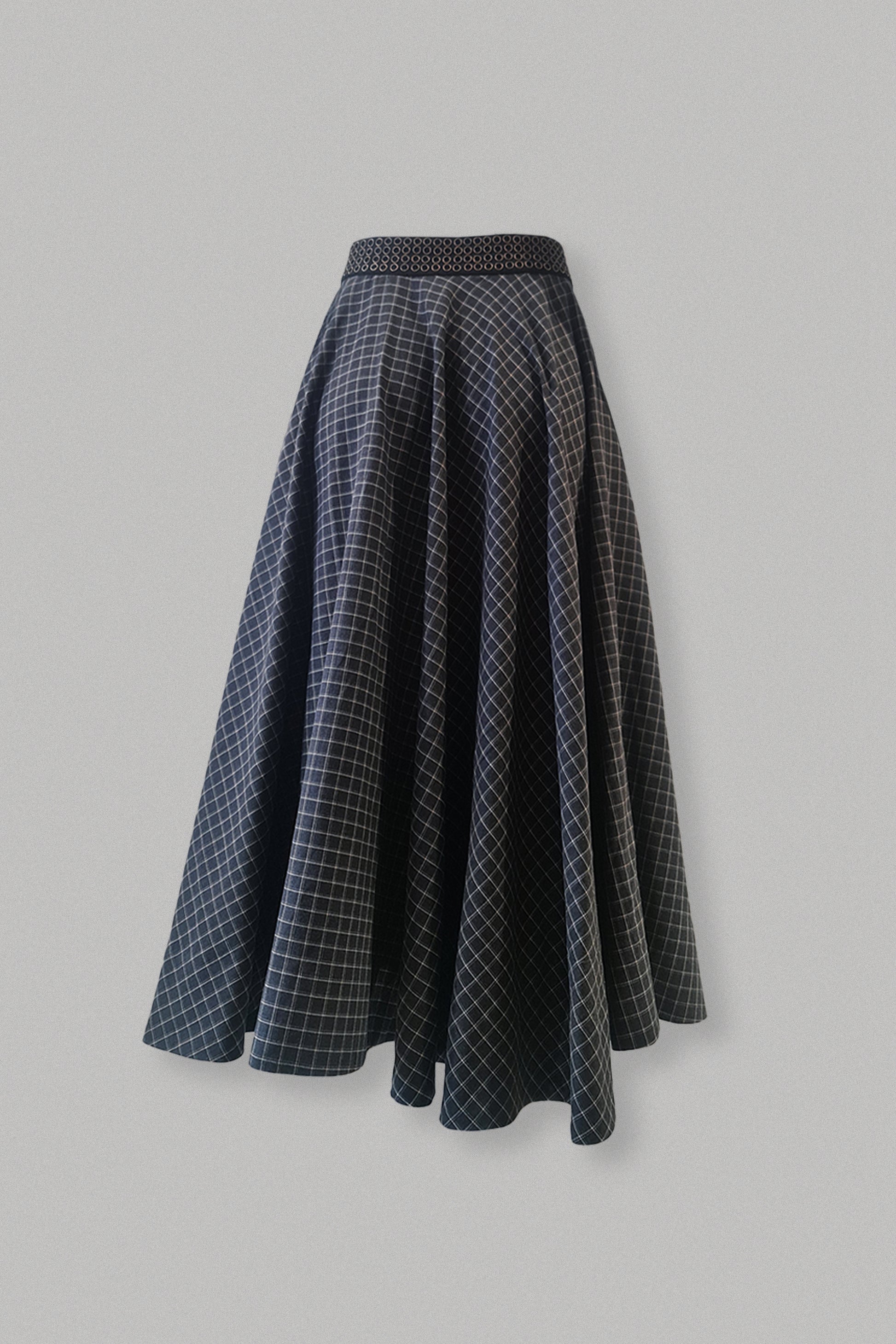 Let your hair down and twirl around in this maxi circular skirt. The skirt features riveted waist belt and a side strap to adjust the length on one side.