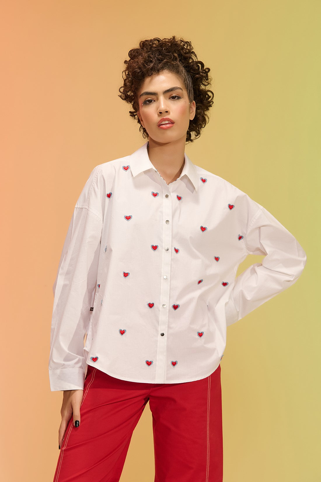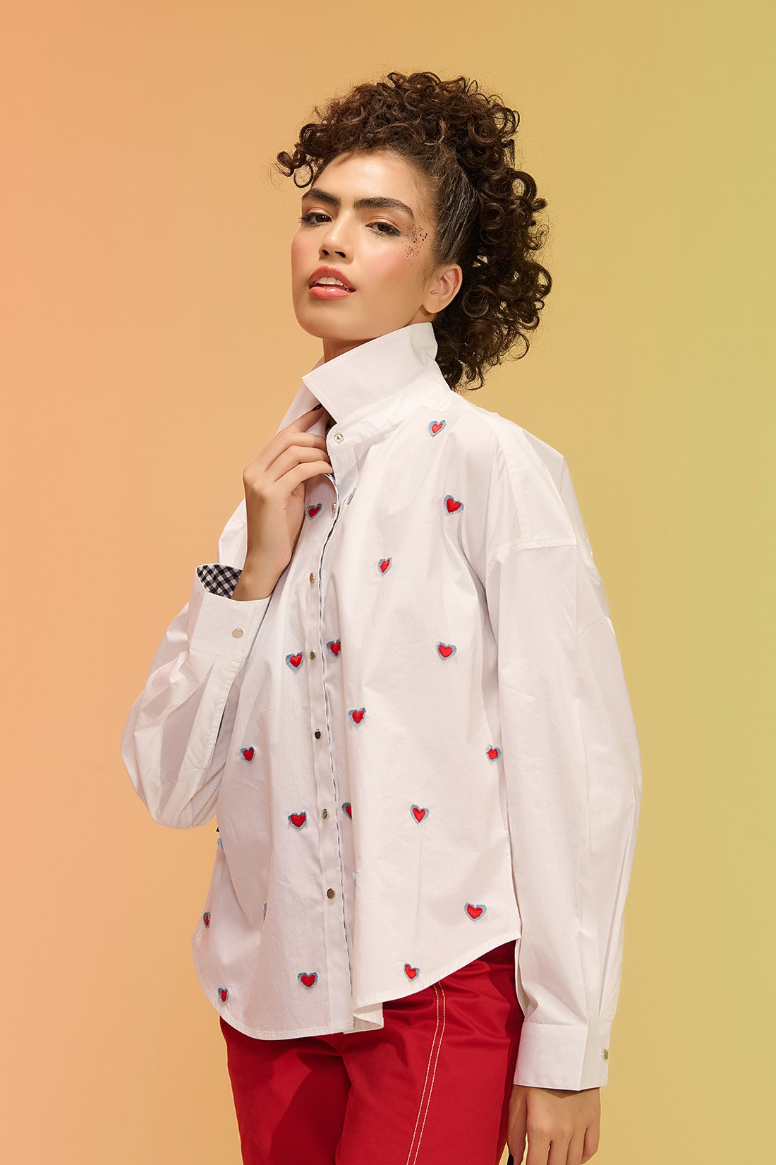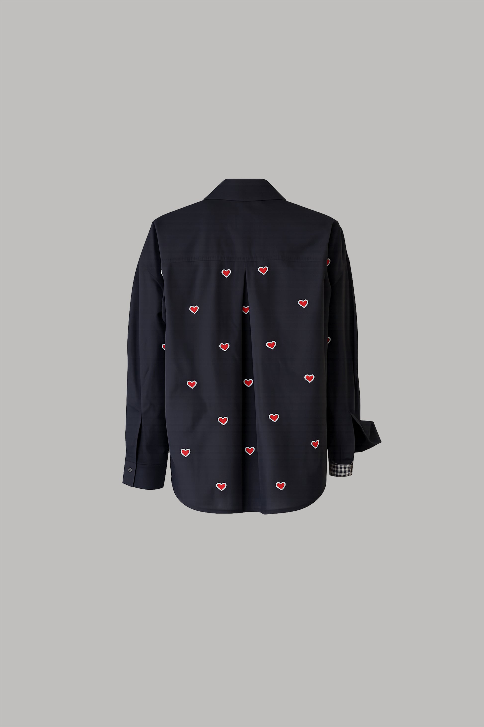 - A loose fitted shirt in poplin with metallic buttons•Small laser cut hearts in denim are patched all over the front and back bodice