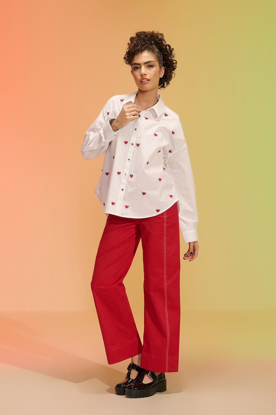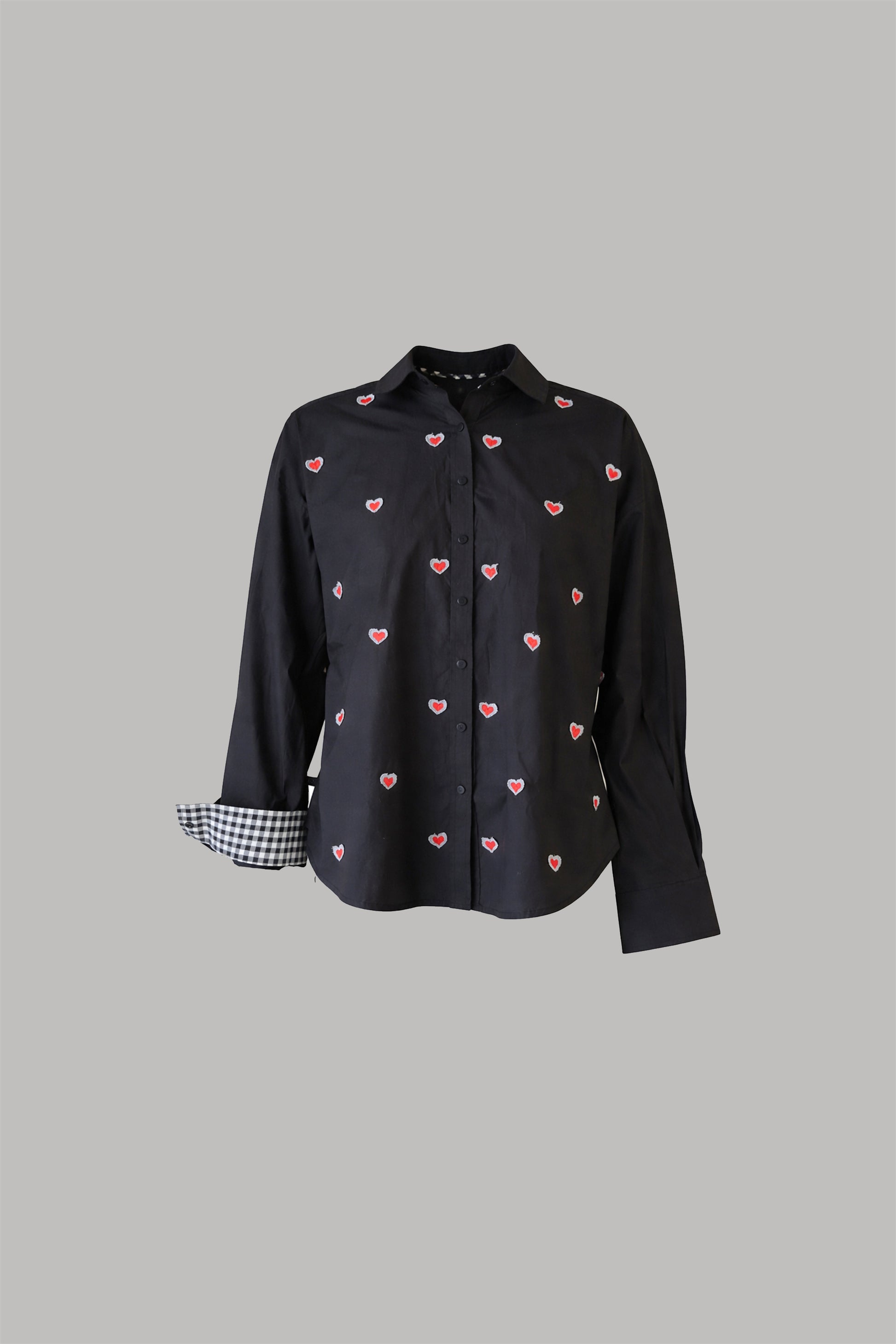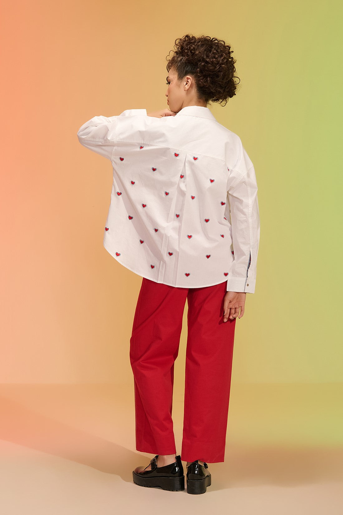 - A loose fitted shirt in poplin with metallic buttons•Small laser cut hearts in denim are patched all over the front and back bodice