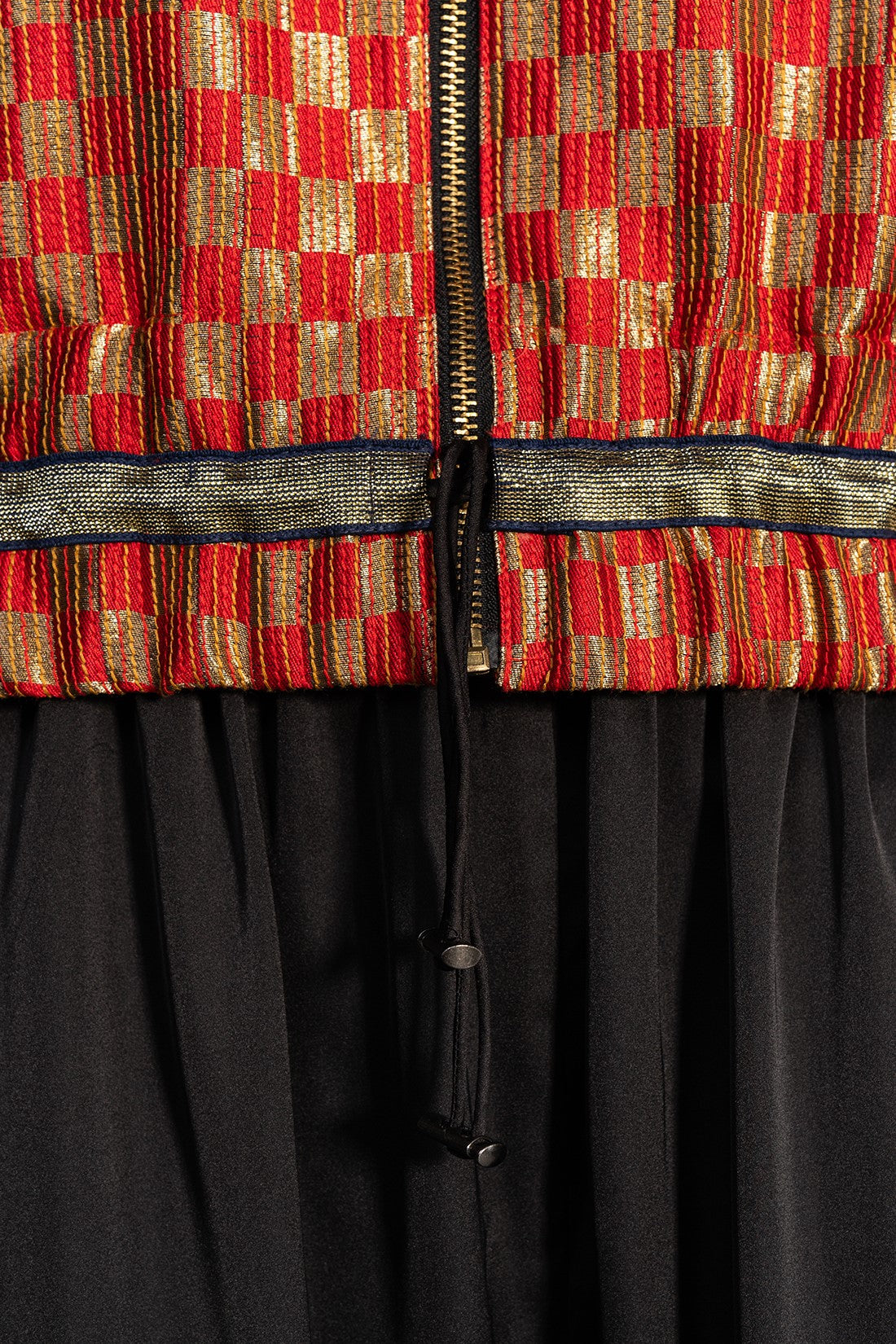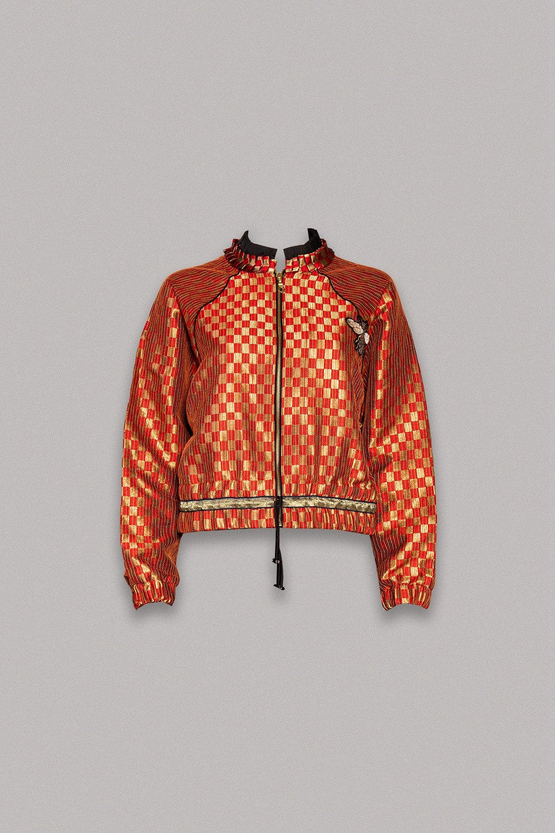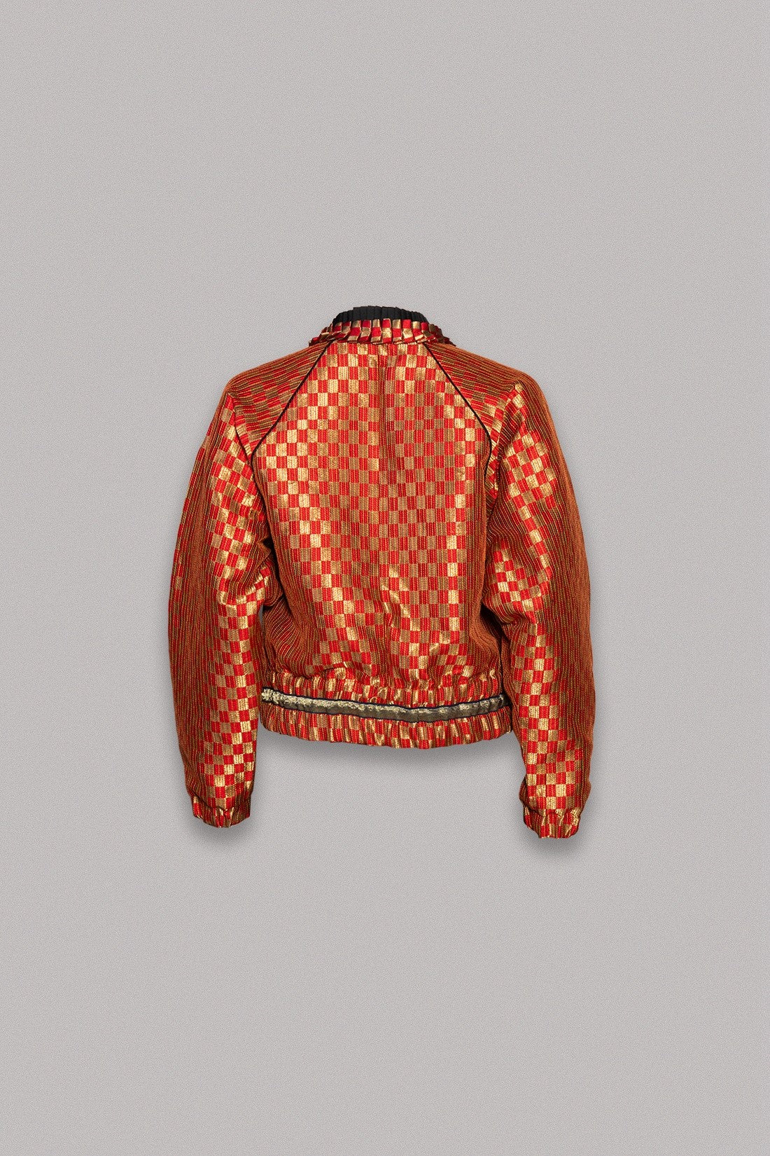 This one-of-a-kind bomber jacket features a textured design that combines two Asian brocade fabrics—golden and rust. This is your cue to shine.