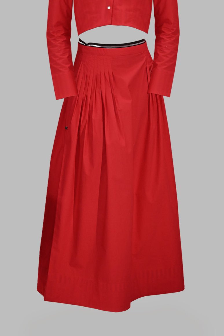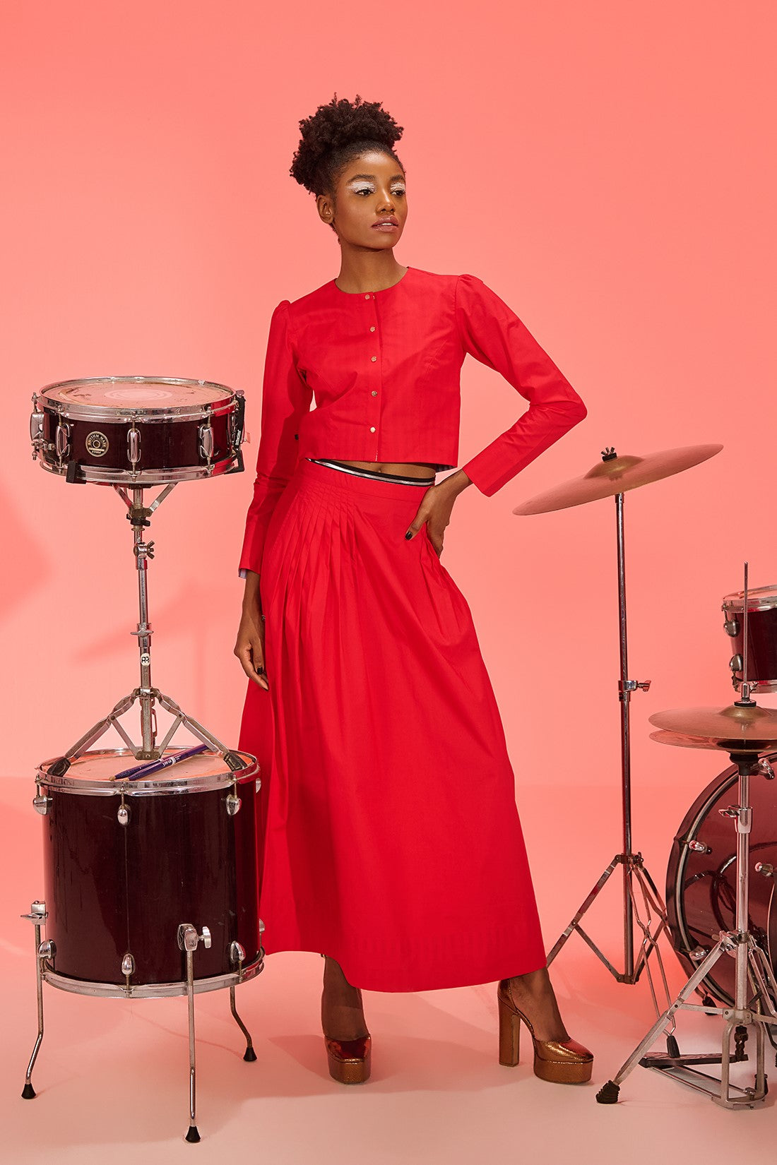 A full-length skirt with pleat detailing on the waist. The skirt has a semifitted look at the pelvis area with a zip and button opening on the side. Complete the look with our IGGY top to make a stylish statement.